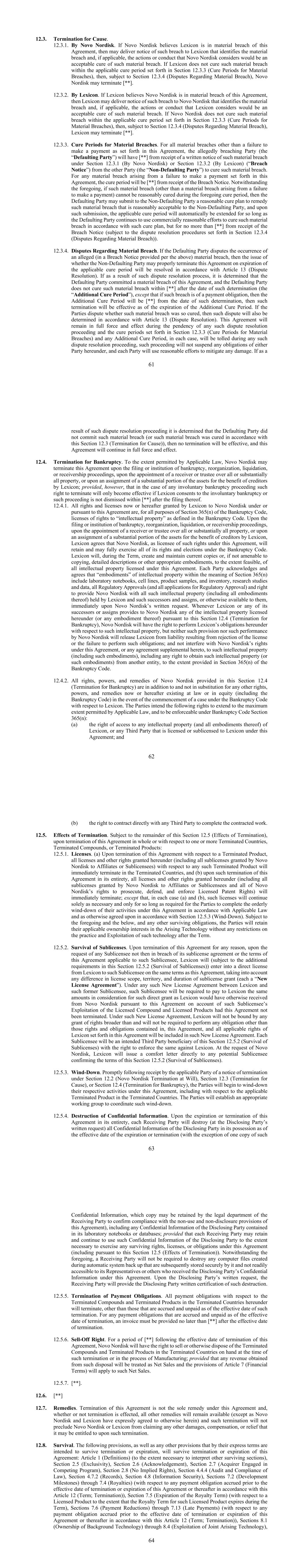 61 12.3.因故终止。12.3.1.由诺和诺德提供。如果诺和诺德认为Lexicon存在重大违反本协议的行为,则可以向Lexicon发送有关此类违约的通知,其中可以确定该重大违约行为,以及(如适用)诺和诺德认为可以接受的此类重大违约行为的补救措施的行动或行为。如果Lexicon未在第12.3.3节(重大违约的治愈期)规定的适用治愈期内纠正此类重大违约行为,那么,在符合第12.3.4节(有关重大违约的争议)的情况下,诺和诺德可以终止[**].12.3.2.通过词典。如果Lexicon认为诺和诺德严重违反本协议,则Lexicon可以向诺和诺德发送有关此类违约的通知,该通知可识别该重大违约行为,以及Lexicon认为可被接受的此类重大违约行为的补救措施(如适用)的行动或行为。如果诺和诺德未在第12.3.3节(重大违约的治愈期)规定的适用治愈期内治愈此类重大违约,那么,在符合第12.3.4节(有关重大违约的争议)的情况下,Lexicon可能会终止[**].12.3.3.重大违约的治愈期。除未按本协议规定支付款项外的所有重大违约行为,被指违约方(“违约方”)将有【**】收到另一方(“非违约方”)根据第12.3.1节(由诺和诺德)或第12.3.2节(由Lexicon)(“违约通知”)发出的此类重大违约的书面通知,以纠正此类重大违约行为。因未能支付本协议规定的款项而产生的任何重大违约,补救期为【**】自收到违约通知之日起。尽管有上述规定,如果在前述补救期内无法合理补救此类重大违约(因未付款而产生的重大违约除外),则违约方可以向非违约方提交非违约方合理接受的合理补救计划,以对此类重大违约进行补救,并且在提交后,只要违约方继续按照该补救计划使用商业上合理的努力来补救此类重大违约,适用的补救期将自动延长,但不超过[**]自收到违约通知(以第12.3.4节(有关重大违约的争议)中规定的争议解决程序为准)。12.3.4.关于材料违约的争议。如果违约方对所指称的(在根据上述规定提供的违约通知中)实质性违约的发生提出争议,那么非违约方在适用的补救期限届满时是否可以适当终止本协议的问题将根据第13条(争议解决)得到解决。如由于此类争议解决过程的结果,确定违约方对本协议实施了实质性违约,且违约方未在[**】在该确定日期(“附加治愈期”)后,除非该等违约是付款义务,则附加治愈期将为[**】自该确定之日起,则该终止将自额外治愈期届满时起生效。如果双方对这种实质性违约行为是否得到如此补救产生争议,那么,这种争议也将根据第13条(争议解决)予以确定。本协议将在任何此类争议解决程序待决期间保持完全有效,第12.3.3节(重大违约的治愈期)规定的治愈期和任何额外的治愈期,在每种情况下,将在任何此类争议解决程序期间收费,此类程序将不会中止任何一方在本协议项下的任何义务,每一方将通过合理的努力来减轻任何损害。如果作为此类争议解决程序的62个结果,确定违约方没有实施此类实质性违约(或此类实质性违约已根据本第12.3条(因故终止)得到纠正),则任何终止均不生效,本协议将继续充分有效。12.4.因破产而终止。在适用法律许可的范围内,诺和诺德可以在破产、重组、清算或接管程序提起或提起时,在对全部或几乎全部财产指定接管人或受托人时,或在Lexicon为债权人的利益转让大部分资产时,终止本协议;但是,条件是, 在任何非自愿破产程序的情况下,只有在Lexicon同意非自愿破产或该程序未在[**】备案后。12.4.1.就《破产法》第365(n)条而言,就《破产法》第365(n)条而言,Lexicon现在或以后根据本协议或根据本协议授予诺和诺德的所有权利和许可均为《破产法》中定义的“知识产权”权利许可。在破产、重组、清算或接管程序提交或提起时,在对全部或几乎全部财产指定接管人或受托人时,或在Lexicon为债权人的利益转让大部分资产时,Lexicon同意,诺和诺德作为本协议项下此类权利的被许可人,将保留并可以充分行使其在《破产法》下的所有权利和选择。在任期内,Lexicon将在可行的范围内创建和维护根据本协议获得许可的所有知识产权的当前副本,或者,如果不允许复制,详细说明或其他适当的实施例。每一缔约方承认并同意,第365(n)条含义内的知识产权“实施例”包括实验室笔记本、细胞系、产品样本、库存、研究研究和数据、所有监管批准(以及所有监管批准申请)以及有权向诺和诺德提供Lexicon和此类继任者和受让人持有的所有此类知识产权(包括其所有实施例),或在收到丨诺和诺德的书面请求后立即以其他方式向其提供这些知识产权(包括其所有实施例)。每当Lexicon或其任何继承人或受让人根据本第12.4节(因破产而终止)向诺和诺德提供任何根据本协议许可的知识产权(或其任何实施例)时,诺和诺德将有权就该等知识产权履行Lexicon在本协议项下的义务,但该等规定或诺和诺德的履行均不会使Lexicon免除因拒绝许可或未履行该等义务而导致的责任;且不干预TERM3在本协议或本协议的任何补充协议项下的权利,在《破产法》第365(n)条规定的范围内,对此类知识产权(包括此类实施例),包括从另一实体获得此类知识产权(或此类实施例)的任何权利。12.4.2.本第12.4节(破产终止)中规定的诺和诺德的所有权利、权力和补救措施是在《破产法》下有关Lexicon的案件启动的情况下,对现在或以后在法律上或权益上存在的任何其他权利、权力和补救措施(包括《破产法》)的补充,而不是替代这些权利、权力和补救措施