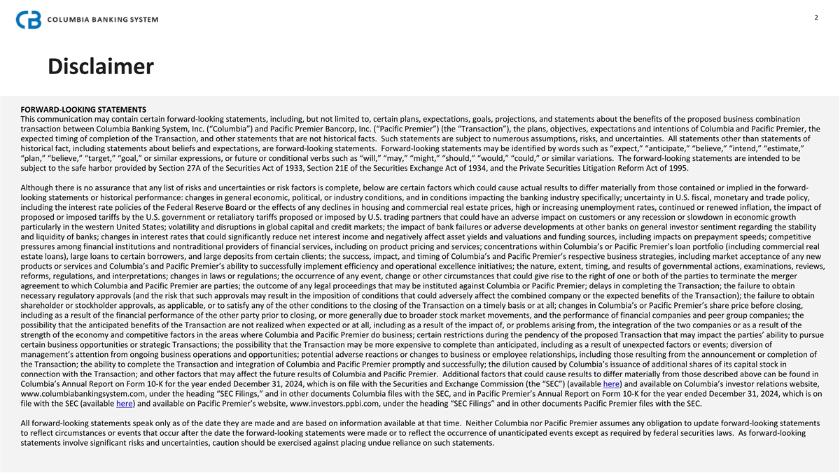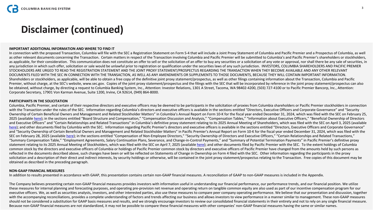2免责声明前瞻性陈述本通讯可能包含某些前瞻性陈述,包括但不限于某些计划、预期、目标、预测,以及有关Columbia Banking System, Inc.(“Columbia”)与Pacific Premier Bancorp, Inc.(“Pacific Premier Bancorp,Inc.”)(“交易”)之间拟议业务合并交易(“交易”)的利益的陈述,Columbia和Pacific Premier的计划、目标、期望和意图,交易完成的预期时间,以及其他非历史事实的陈述。此类陈述受到众多假设、风险和不确定性的影响。除历史事实陈述之外的所有陈述,包括关于信念和期望的陈述,都是前瞻性陈述。前瞻性陈述可以通过“预期”、“预期”、“相信”、“打算”、“估计”、“计划”、“相信”、“目标”、“目标”或类似表达方式,或未来或条件动词,如“将”、“可能”、“可能”、“应该”、“将”、“可能”或类似变体来识别。这些前瞻性陈述旨在遵守1933年《证券法》第27A条、1934年《证券交易法》第21E条和1995年《私人证券诉讼改革法》提供的安全港。尽管无法保证任何风险和不确定性或风险因素清单都是完整的,但以下是可能导致实际结果与前瞻性陈述或历史业绩中包含或暗示的结果存在重大差异的某些因素:总体经济、政治或行业状况的变化,以及具体影响银行业的情况;美国财政、货币和贸易政策的不确定性,包括联邦储备委员会的利率政策或住房和商业房地产价格任何下降的影响、高失业率或不断增加的失业率、持续或重新出现的通胀,美国政府提议或征收的关税或美国贸易伙伴提议或征收的报复性关税的影响,可能对客户产生不利影响或经济增长出现任何衰退或放缓,特别是在美国西部;全球资本和信贷市场的波动和中断;银行倒闭或其他银行的不利发展对投资者关于银行稳定性和流动性的普遍情绪的影响;可能显着降低净利息收入并对资产收益率、估值和资金来源产生负面影响的利率变化,包括对提前还款速度的影响;金融机构和非传统金融服务提供商之间的竞争压力,包括对产品定价和服务的压力;哥伦比亚或太平洋总理的贷款组合(包括商业房地产贷款)、对某些借款人的大额贷款以及某些客户的大额存款的集中度;哥伦比亚和太平洋总理各自业务战略的成功、影响和时机,包括任何新产品或服务的市场接受度以及哥伦比亚和太平洋总理成功实施效率和卓越运营举措的能力;政府行动、审查、审查、改革、法规的性质、程度、时机和结果,和解释;法律法规的变化;任何事件的发生,可能导致一方或双方有权终止Columbia和Pacific Premier作为当事方的合并协议的变更或其他情况;可能对Columbia或Pacific Premier提起的任何法律诉讼的结果;延迟完成交易;未能获得必要的监管批准(以及此类批准可能导致施加可能对合并后公司或交易的预期收益产生不利影响的条件的风险);未能获得股东或股东批准(如适用),或满足及时或完全完成交易的任何其他条件;Columbia或Pacific Premier在收盘前的股价变化,包括由于收盘前另一方的财务表现,或更普遍地由于更广泛的股票市场走势,以及金融公司和同行集团公司的表现;交易的预期收益未能在预期时实现或根本无法实现的可能性,包括由于以下因素的影响或产生的问题, 两家公司的整合或由于Columbia和Pacific Premier开展业务的地区的经济实力和竞争因素;拟议交易未决期间可能影响各方寻求某些商业机会或战略交易能力的某些限制;交易完成成本可能比预期更高的可能性,包括由于意外因素或事件;将管理层的注意力从正在进行的业务运营和机会上转移;对业务或员工关系的潜在不利反应或变化,包括因公告或完成交易而产生的;及时成功完成Columbia和Pacific Premier的交易和整合的能力;Columbia就交易增发其股本股份造成的稀释;以及可能影响Columbia和Pacific Premier未来业绩的其他因素。可能导致结果与上述结果存在重大差异的其他因素,请参见哥伦比亚截至2024年12月31日止年度的10-K表格年度报告,该报告已在美国证券交易委员会(“SEC”)存档(可在此处查阅),并可在哥伦比亚的投资者关系网站www.columbiabankingsystem.com上查阅,标题为“SEC文件”,在哥伦比亚提交给SEC的其他文件中,以及在Pacific Premier截至2024年12月31日止年度的10-K表格年度报告中,该报告已在SEC存档(可在此处查阅),并可在Pacific Premier的网站www.investors.ppbi.com的“SEC文件”标题下查阅,以及在Pacific Premier提交给SEC的其他文件中。所有前瞻性陈述仅在作出之日发表,并基于当时可获得的信息。除联邦证券法要求外,Columbia和Pacific Premier均不承担更新前瞻性陈述以反映前瞻性陈述作出之日之后发生的情况或事件或反映意外事件发生的任何义务。由于前瞻性陈述涉及重大风险和不确定性,应谨慎行事,不要过分依赖此类陈述。