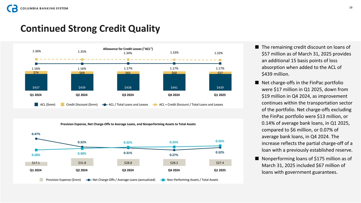 19持续强劲的信用质量■截至2025年3月31日信用损失准备金(ACL)贷款的剩余信用折扣1.36% 1.35% 1.33% 1.34% 1.32% 5700万美元提供了额外15个基点的损失吸收,如果加上ACL的1.17% 1.17% 1.17% 1.16% 1.16% 74美元69美元65美元60美元57美元4.39亿美元。■ FinPAC投资组合的净冲销437美元439美元438美元441美元439美元2025年第一季度为1700万美元,低于2024年第四季度的2024Q2 2024Q3 2024Q4 2024Q1 2024Q1 1900万美元,因为运输部门ACL($ mm)信用折扣($ mm)ACL/贷款总额和租赁ACL +信用折扣/投资组合的贷款和租赁总额继续改善。2025年第一季度不包括FinPAC投资组合的净冲销为1300万美元,占平均银行贷款的0.14%,而2024年第四季度为600万美元,占平均银行贷款的0.07%。0.35% 0.32% 0.33% 0.32%的增幅反映了以先前建立的准备金部分冲销一笔贷款。0.32% 0.31% 0.30% 0.28% 0.27% ■截至2025年3月31日,1.75亿美元的不良贷款为17.1美元31.8美元28.8美元28.2美元27.4美元,其中包括6700万美元的2024Q2 2024Q3 2024Q4 2024Q1 2025年有政府担保的贷款。拨备费用($ mm)净冲销/平均贷款(年化)不良资产/总资产