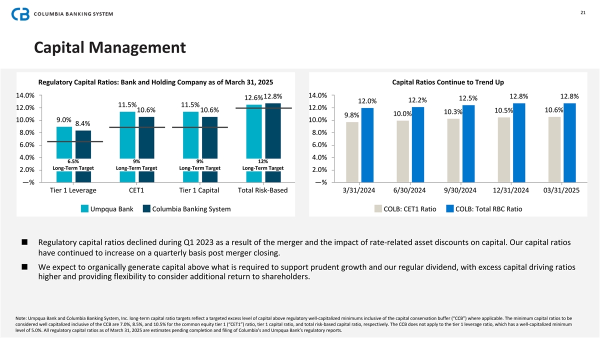 20 ACL反映了按贷款部门划分的信贷损失的强劲投资组合信用指标准备金ACL剩余总额,包括租赁和商业住宅和信贷折扣信贷折扣(1)(1)(单位:千美元)CommercialEquipmentReal EstateHome EquityConsumerTotalon Loanson Loans Balance at December 31,2024 $ 130,286 $ 95,317 $ 160,345 $ 46,784 $ 8,065 $ 440,797 $ 60,443 $ 501,240 Q1 2025 Net charge-off(11,523)(16,752)(100)(205)(741)(29,321)Reserve Build(release)9,95014,21415,913(12,418)(256)27,402025年128,713美元92,779美元176,158美元34,161美元7,068美元438,879美元56,831美元495,710%的未偿贷款和租赁1.56% 5.64% 0.90% 0.43% 4.07% 1.17% 1.32% ■我们按贷款分部和整体贷款和租赁组合划分的准备金覆盖率反映了我们稳健的承销标准和持续的、例行的投资组合监测活动。例如,我们在开始和贷款审查时强调适用的变量,例如利率、现金流和占用,并因此限制借款人的收益。这些因素导致较低的LTV和较高的DSC比率,这在我们的ACL估计中被考虑在内。■本季度2700万美元的拨备费用反映了信贷迁移趋势、冲销活动以及信贷模型中使用的经济预测的变化。我们使用了Moody’s Analytics的2025年2月一致经济预测的组成部分来估计我们截至2025年3月31日的ACL。(1)总额包括截至2025年3月31日和2024年12月31日分别为1740万美元和1620万美元的无资金承诺准备金。
