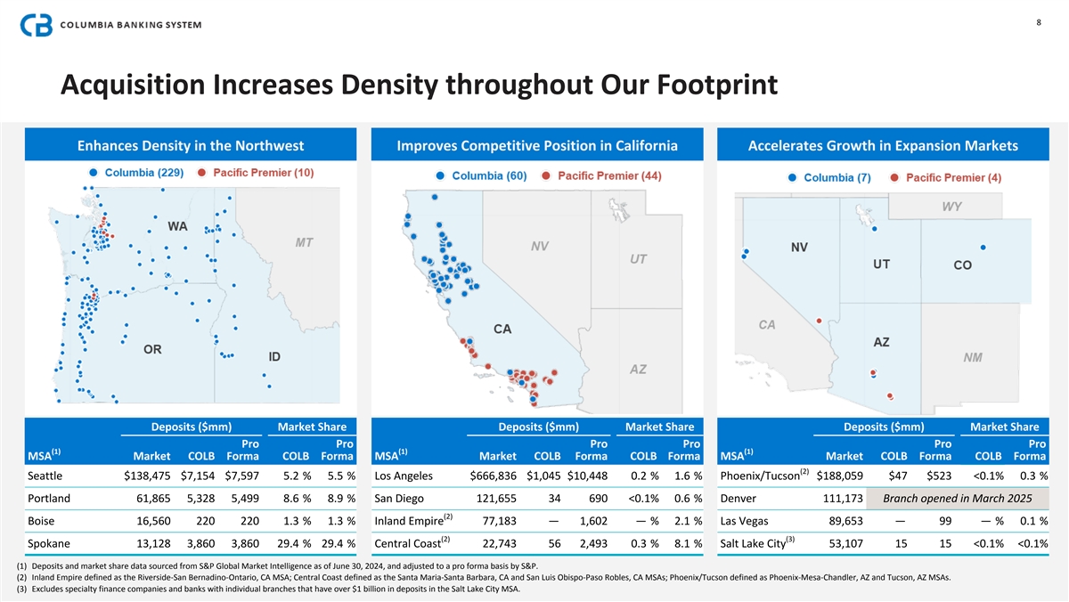7 Acquisition Pacific Premier增加了规模和机会(1)增加了南加州的规模并增加了在NorthwestPro Forma的存在Forma Snapshot $ 70B $ 51B $ 57B assetsLoansDeposits(2)top 10 market share in Southern California total % of RankBankDeposits($ mm)Franchise 1JPMorgan Chase $ 180,8137.5% 2Bank of America145,9947.6% 3Wells Fargo134,1589.8%(3)4Royal Bank of Canada53,0625.6% 5U.S. Bancorp49,6299.5 % 6East West Bancorp43,19072.0 % 7Citigroup42,6563.3 % 8Axos Financial17,84392.2% 9Bank of Calif和Pacific Premier在截至2025年3月31日的合并备考基础上,不反映采购会计调整。(2)存款和市场份额数据来源于截至2024年6月30日的标普全球市场情报,并经标准普尔调整为备考基础。南加州定义为:bakersfield-Delano,加利福尼亚州;El Centro,加利福尼亚州;Los Angeles-Long Beach-Anaheim,加利福尼亚州;Oxnard-Thousand Oaks-Ventura,加利福尼亚州;Riverside-San Bernardino-Ontario,加利福尼亚州;San Diego-Chula Vista-Carlsbad,加利福尼亚州;San Luis Obispo-Paso Robles,加利福尼亚州和Santa Maria-Santa Barbara,加利福尼亚州 MSA。(3)Franchise的百分比反映了加拿大皇家银行截至2024年7月31日的存款百分比。