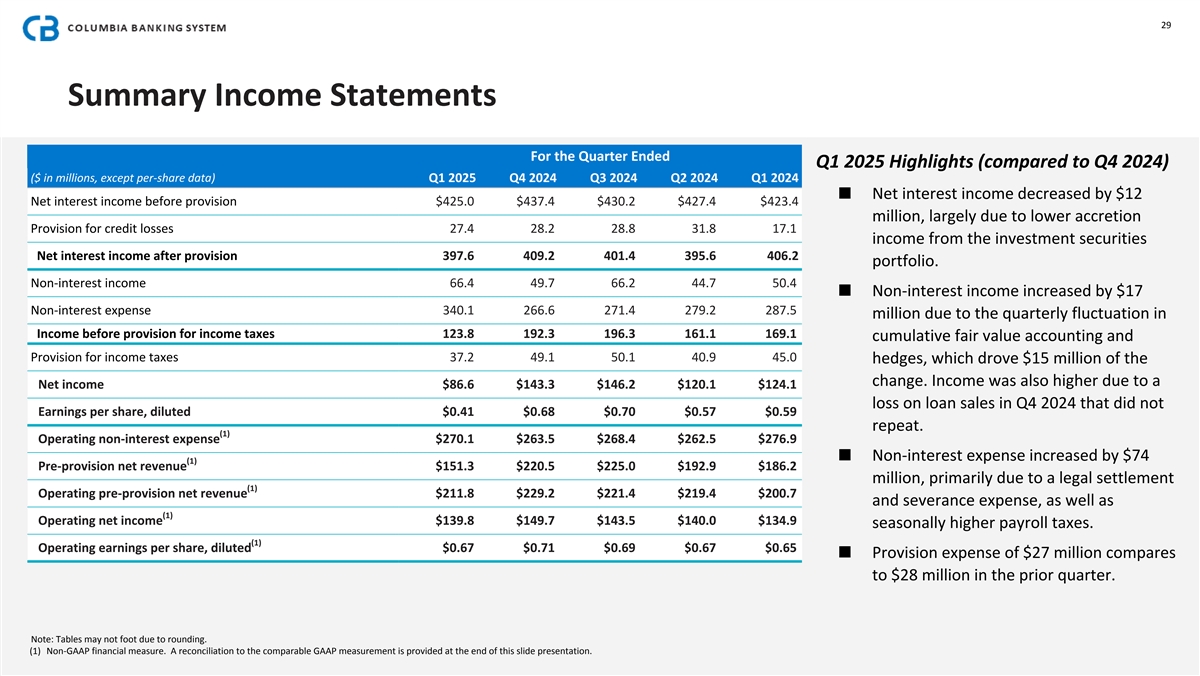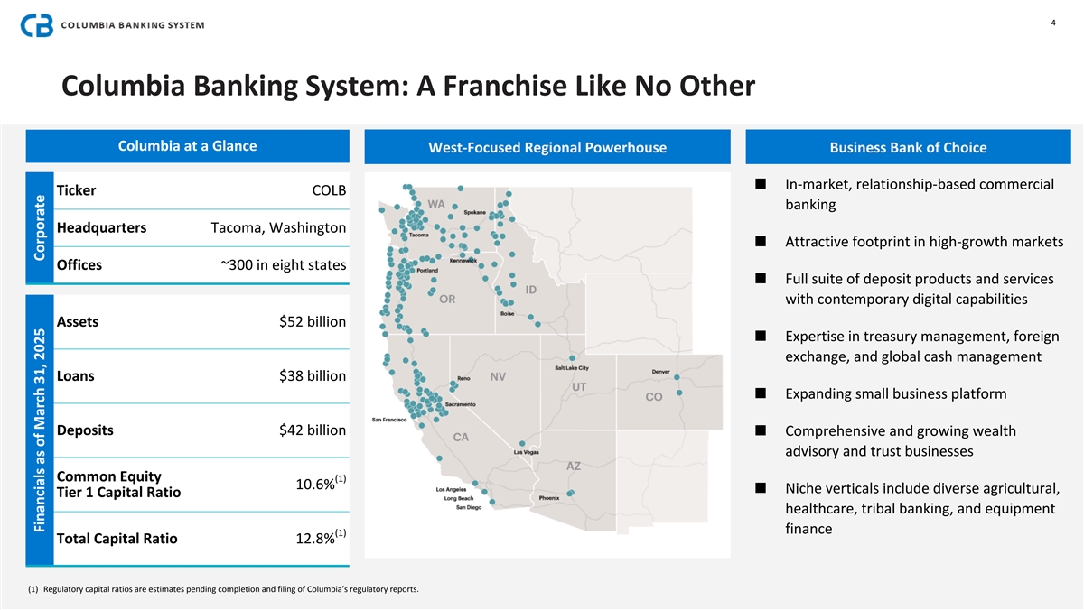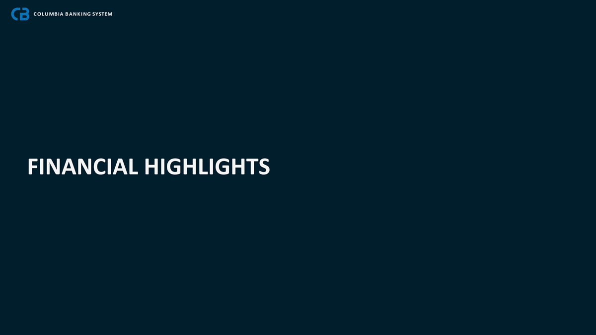 3免责声明(续)与拟议交易有关的重要附加信息以及在哪里可以找到这些信息,Columbia将向SEC提交一份表格S-4的注册声明,其中将包括Columbia和Pacific Premier的联合代理声明和Columbia的招股说明书,以及与交易有关的其他相关文件。有关Columbia和Pacific Premier的交易的某些事项将提交给Columbia和Pacific Premier的股东或股东(如适用),以供其考虑。在根据任何此类司法管辖区的证券法进行注册或获得资格之前此类要约、招揽或出售将是非法的任何司法管辖区,本通讯不构成任何证券的出售要约或购买要约的招揽或任何投票或批准的招揽,也不构成任何证券的出售。投资者、哥伦比亚股东和太平洋地区的主要股东被敦促在可获得时阅读登记声明和关于交易的联合代理声明/招股说明书,以及向SEC提交的与交易有关的任何其他相关文件,以及对这些文件的任何修订或补充,因为它们将包含重要信息股东或股东(如适用)将能够在SEC网站www.sec.gov上免费获得最终联合代理声明/招股说明书的副本,以及包含有关此次交易、Columbia和Pacific Premier信息的其他文件。联合委托书/招股说明书的副本以及将以引用方式并入联合委托书/招股说明书的向SEC提交的文件,也可以免费获得,方法是向Columbia Banking System, Inc.提出请求,注意:投资者关系部,1301 A Street,Tacoma,WA 98402-4200,(503)727-4100或向Pacific Premier Bancorp, Inc.,注意:公司秘书,17901 Von Karman Avenue,Suite 1200,Irvine,加利福尼亚州 92614,(949)864-8000。根据SEC规则,参与征集的哥伦比亚公司、Pacific Premier及其各自的某些董事和执行官可能被视为参与向哥伦比亚公司股东或Pacific Premier股东征集与交易有关的代理。有关哥伦比亚公司董事和执行官的信息,请参见哥伦比亚公司截至2024年12月31日的财政年度10-K表格年度报告中题为“董事、执行官和公司治理”和“某些受益所有人和管理层的证券所有权及相关股东事项”的章节,该报告于2025年2月25日提交给SEC(可在此处查阅);在题为“董事会Structure和薪酬”、“薪酬讨论与分析”、“薪酬表”、“有关高管的信息”等部分哥伦比亚于2025年4月3日向SEC提交的与2025年年度股东大会有关的最终代理声明中的“董事和执行官的实益所有权”和“某些关系和相关交易”(可在此处查阅);以及哥伦比亚向SEC提交的其他文件。有关Pacific Premier的董事和执行官的信息,可在Pacific Premier截至2024年12月31日的财政年度的10-K表格年度报告中标题为“董事、执行官和公司治理”和“某些实益拥有人和管理层的证券所有权和相关股东事项”的章节中查阅,于2025年2月28日向SEC提交(可在此处查阅);在题为“非雇员董事的薪酬”、“董事和执行官的安全所有权”、“某些关系和相关交易”、“薪酬汇总表”、“雇佣协议、薪酬延续计划、遣散费和控制权变更付款”的章节中,以及Pacific Premier于2025年4月7日向SEC提交的与2025年年度股东大会相关的最终代理声明中的“潜在终止付款摘要”(可在此处获取);以及Pacific Premier向SEC提交的其他文件。如果Columbia的董事和执行官持有的Columbia普通股或Pacific Premier的董事和执行官持有的Pacific Premier普通股与上述文件中反映的这些人持有的金额发生变化,此类变更已经或将反映在向SEC提交的表格4上的所有权变更声明中。有关代理征集参与者的其他信息以及对其直接和间接利益的描述,通过证券持有或其他方式, 将载于有关该交易的联合代理声明/招股章程。本文件可按前款规定免费领取。非公认会计准则财务指标除了按照公认会计准则列报的结果外,本演示文稿还包含某些非公认会计准则财务指标。GAAP与非GAAP措施的对账包含在附录中。该公司认为,提供某些非公认会计准则财务指标可为投资者提供有助于了解我们的财务业绩、业绩趋势和财务状况的信息。我们将这些措施用于内部规划和预测目的,运营拨备前净收入和有形普通股的运营回报率也被用作我们对执行官的激励薪酬计划的一部分。我们,以及证券分析师、投资者等利益相关方,也用这些衡量标准来比较同行公司的经营业绩。我们相信,我们的介绍和讨论,连同伴随的对账,提供了对影响我们业务的因素和趋势的完整理解,并允许投资者以类似于管理层的方式看待业绩。这些非GAAP衡量标准不应被视为替代GAAP基础衡量标准和结果,我们强烈鼓励投资者全面审查我们的合并财务报表,不要依赖任何单一的财务衡量标准。由于非GAAP财务指标不标准化,可能无法将这些财务指标与名称相同或相似的其他公司的非GAAP财务指标进行比较。