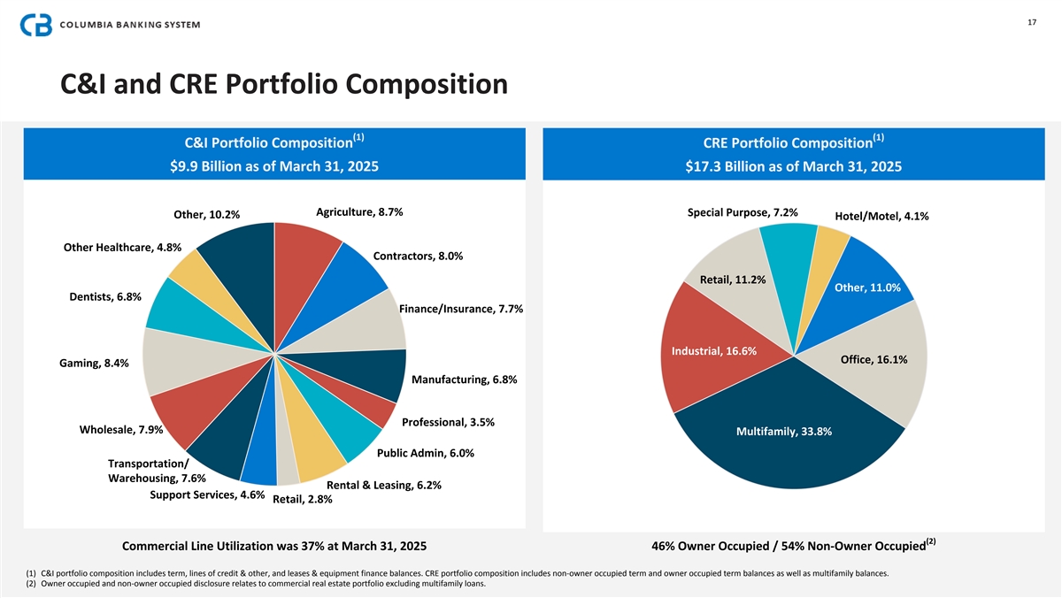 16截至2025年3月31日的多元化、高质量贷款和租赁组合组合构成业主占用CRE抵押贷款•组合平均贷款规模为110万美元•组合平均贷款规模为47.7万美元多户家庭,15% • 25年第一季度平均贷款规模为210万美元• 25年第一季度平均贷款规模为26万美元其他贷款•组合平均LTV为55% •组合平均FICO为761,LTV为61%类别,13% • 25年第一季度平均LTV为70% • 25年第一季度平均FICO为768,LTV为57%非OO CRE,16% •总拖欠率0.53% •总拖欠率1.40% •年化净核销(回收)率0.01% •年化净核销(回收)率0.00按揭,16%自住CRE,14%非自住CRE多户FinPAC,4% C & I,22% •投资组合平均贷款规模为170万美元•投资组合平均贷款规模为230万美元• 25年第一季度平均贷款规模为270万美元• 25年第一季度平均贷款规模为130万美元•投资组合平均LTV为51%,DSC为1.88 •投资组合平均LTV为54%,DSC为1.57 • 25年第一季度平均LTV为52%,DSC为1.22 • 25年第一季度平均LTV为68%,DSC为1.16 •截至2025年3月31日的总拖欠率为1.19%地理分布•总拖欠率为0.00 %•年化净核销(回收)率为0.00 %•年化净核销(回收)率为0.00 %%其他,15%普吉特海湾,19% Commercial & IndustrialLease & Equipment Finance(FinPAC)Southern 加利福尼亚州,15% WA Other,8% •投资组合平均贷款和租赁规模为42,000美元•投资组合平均贷款规模为738,000美元•第一季度平均贷款和租赁规模为56,000美元•第一季度平均贷款规模为634,000美元•投资组合平均收益率:~10% Portland Metro,13% • Northern 加利福尼亚州总拖欠率为0.91%,9% •总拖欠率为3.28% •年化净核销(回收)率为0.57% •年化净核销(回收)率为4.17%湾区,7%或其他,14%注:截至2025年3月31日的投资组合统计数据和拖欠情况。2025年第一季度的年化净冲销率。贷款与价值(“LTV”)、FICO和偿债覆盖率(“DSC”)比率基于可获得数据的投资组合的加权平均值。LTV代表基于最新评估的平均LTV与更新的贷款余额。由于四舍五入,总数可能不够。