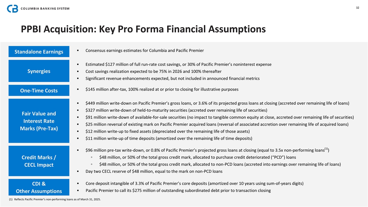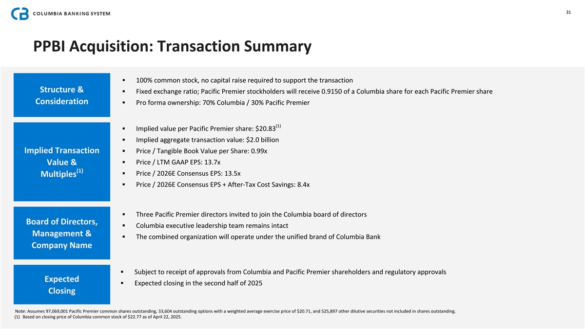 31日PPBI收购:交易摘要▪100%普通股,无需筹集资金即可支持交易Structure &▪固定汇率;Pacific Premier股东将获得0.9 150一股哥伦比亚股票每股Pacific Premier股份代价▪备考所有权:70% Columbia/30% Pacific Premier(1)▪每股Pacific Premier股票隐含价值:20.83美元▪隐含总交易价值:20亿美元隐含交易▪每股价格/有形账面价值:0.99x▪价格/LTM GAAP EPS:13.7x值&(1)▪价格/2026E共识EPS:13.5x倍倍数▪价格/2026E共识EPS +税后成本节约:8.4x▪三位Pacific Premier董事应邀加入哥伦比亚董事会董事会,▪哥伦比亚行政领导团队保持不变管理&▪合并后的组织将以哥伦比亚银行公司名称的统一品牌运营▪取决于收到Columbia和Pacific Premier股东的批准以及监管机构的批准预计▪预计2025年下半年收盘收盘价:假设已发行普通股97,069,001股Pacific Premier,已发行期权33,604份,加权平均行使价为20.71美元,未计入流通股的其他稀释性证券525,897份。(1)基于截至2025年4月22日哥伦比亚普通股的收盘价22.77美元。