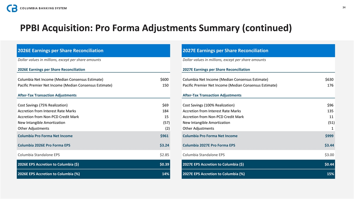 33 PPBI收购:备考调整摘要每股有形账面价值调节商誉调节美元价值单位:百万,每股金额除外美元价值单位:百万,除每股金额外交易价值2033美元Columbia有形每股账面价值收盘时19.14美元Pacific Premier普通股收盘时2970美元Columbia普通股收盘时5430美元现有无形资产(924)交易价值2033与无形资产相关的DTL 6 Pacific Premier未摊销的次级债发行费用(2)(1)购买会计调整交易费用(146)HTM投资证券(327美元)收盘时的备考普通股7,315总贷款(544)Columbia无形资产收盘时1,408贷款损失准备金转回168商誉产生177收购贷款标记转回25 CDI产生416固定资产12收盘时的备考无形资产总计2,001购买会计调整:资产(666)递延税项资产/(负债)166 CECL储备对收购贷款的净影响(36)定期存款(11)期末备考有形普通股权益5278美元总购买会计调整:负债(11)递延税项资产/(负债)3哥伦比亚期末已发行普通股210,112,415股Pacific Premier期末调整有形权益1,544美元将向Pacific Premier股东发行88,368,619股隐含溢价489美元备考普通股已发行298,481,034股溢价分配备考每股有形账面价值17.68美元核心存款无形资产416美元递延税项资产/(负债)(104)净CDI分配312美元商誉分配177美元(1)正数对公平有利;负数对公平不利。