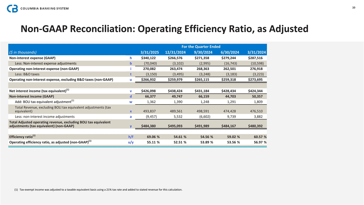 39非美国通用会计准则对账:运营效率比率,按季度末调整(千美元)3/31/202512/31/20249/30/20246/30/20243/31/2024非利息费用(GAAP)h $ 340,122 $ 266,576 $ 271,358 $ 279,244 $ 287,516减:非利息费用调整b(70,040)(3,102)(2,995)(16,743)(10,598)运营非利息费用(non-GAAP)i 270,082263,474268,363262,501276,918减:B & O税(3,150)(3,495)(3,248)(3,183)(3,223)运营非利息费用,不包括B & O税(non-GAAP)u $ 266不包括BOLI税收等值调整(税收等值)x493,837489,561498,591474,428476,510减:非利息收入调整a(9,457)5,532(6,602)9,7393,882调整后营业总收入,不包括BOLI税收等值调整(税收等值)(非美国通用会计准则)y484,380美元495,093美元491,989美元484,167美元480,392美元(1)效率比oh/f6 9.06% 54.61% 54.56% 59.02% 60.57%(1)运营效率比,经调整后(非美国通用会计准则)u/y5 5.11% 52.51% 53.89% 53.56% 56.97%(1)免税收入采用21%的税率调整为应税等值基础,并