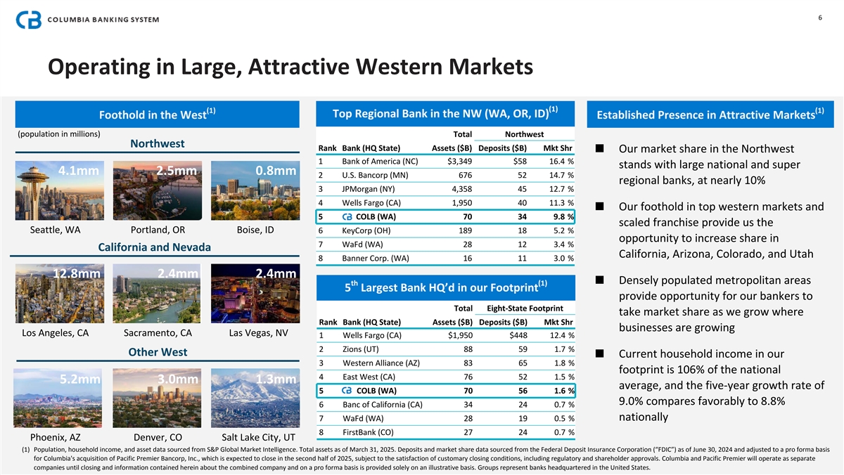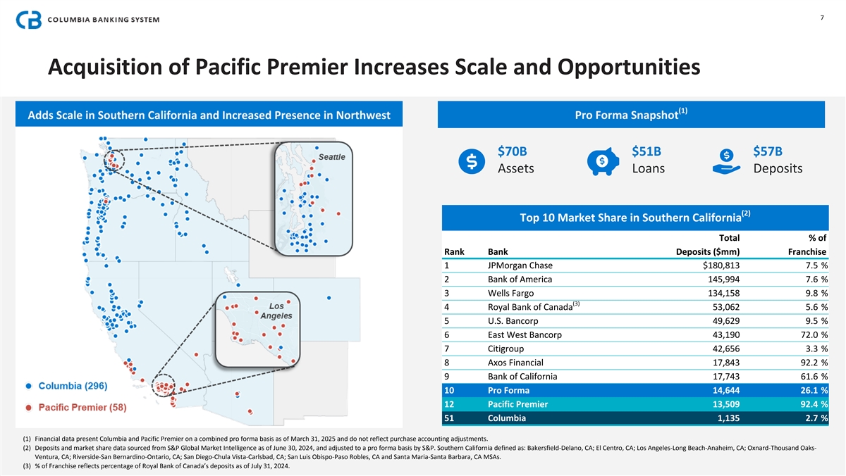 6在具有吸引力的大型西方市场开展业务(1)(1)(1)在西北地区(WA,OR,ID)立足于西部的顶级区域银行在有吸引力的市场建立了存在(百万人口)TotalNorthwest Northwest RankBank(HQ State)Assets($ B)Deposits($ B)MKT SHR ■我们在西北地区的市场份额1Bank of America(NC)$ 3,349 $ 58 16.4%与大型全国性和超4.1mm2.5mm0.8mm 2U.S. Bancorp(MN)6765214.7%区域银行,近10% 3JPMorgan(NY)4,3584512.7% 4Wells Fargo(加利福尼亚州)1,9504011.3% ■我们在顶级西方市场的立足点和5 COLB(WA)7034ID6KeyCorp(OH)189185.2%的机会增加7WaFD(WA)的份额28123.4%加利福尼亚州和内华达州加利福尼亚州、亚利桑那州、科罗拉多州和犹他州8Banner Corp.(WA)16113.0% 12.8mm2.4m2.4mm ■人口稠密的大都市区th(1)5个我们足迹中最大的银行总部为我们的银行家提供了机会,随着我们在RankBank(HQ State)Assets($ B)Deposits($ B)MKT Shr业务正在增长的洛杉矶、卡萨克拉门托、加州拉斯维加斯,NV 1Wells Fargo(加利福尼亚州)$ 1,950 $ 44812.4% 2Zions(UT)88591.7% Other West ■目前家庭收入在我们3Western Alliance(AZ)83651.8%的足迹是全国4East West(加利福尼亚州)76521.5% 5.2mm3.0mm1.3mm平均的106%,五年增长率5 COLB(WA)70561.6% 9.0%优于8.8% 6Banc of California(加利福尼亚州)34240.7% nationally 7WaFd(WA)28190.5% 8FirstBank(CO)27240.7% Phoenix,AZDenver,COSalt Lake City,UT(1)人口、家庭收入、资产数据来源于标普全球 Market截至2025年3月31日资产总额。截至2024年6月30日,存款和市场份额数据来自美国联邦存款保险公司(“FDIC”),并已调整为哥伦比亚公司收购Pacific Premier Bancorp, Inc.的备考基础,该收购预计将于2025年下半年完成,但需满足惯例成交条件,包括监管机构和股东的批准。Columbia和Pacific Premier将作为独立的公司运营,直到交易结束,此处包含的有关合并后公司和备考基础上的信息仅在说明性基础上提供。集团代表总部设在美国的银行。