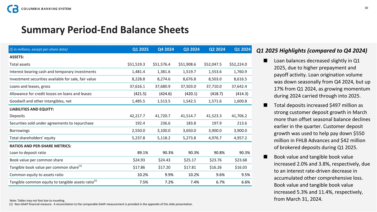 29截至2025年第一季度的季度损益表摘要要点(与2024年第四季度相比)(百万美元,每股数据除外)Q1 2025Q4 2024Q3 2024Q2 2024Q1 2024 ■净利息收入减少12美元拨备前净利息收入425.0美元437.4美元430.2美元427.4美元4.234亿美元,主要是由于信贷损失的增值准备金减少27.428.228.83 1.81 7.1投资证券收入拨备后净利息收入397.6409.2401.4395.6 406.2投资组合。非利息收入66.4 49.766.24 4.75 0.4 ■非利息收入增加17美元非利息支出340.12 66.6271.4279.22875万美元,原因是所得税拨备前收入的季度波动123.8 192.3 196.3161.1169.1累计公允价值会计和所得税拨备37.24 9.15 0.14 0.94 5.0对冲,推动了1500万美元的变化。收入也有所增加,原因是2024年第四季度没有每股收益的贷款销售净收入86.6美元143.3美元146.2美元120.1美元124.1美元亏损,稀释后0.41美元0.68美元0.70美元0.57美元0.59美元重复。(1)经营非利息支出270.1美元263.5美元268.4美元262.5美元276.9美元■非利息支出增加74美元(1)拨备前净收入151.3美元220.5美元225.0美元192.9美元1.862亿美元,主要是由于法律和解(1)经营拨备前净收入211.8美元229.2美元221.4美元219.4美元200.7美元和遣散费,以及(1)经营净收入139.8美元149.7美元143.5美元140.0美元134.9美元季节性较高的工资税。(1)每股运营收益,稀释后0.67美元0.71美元0.69美元0.67美元0.65美元■拨备费用为2700万美元,上一季度为2800万美元。注意:由于四舍五入,表格可能不够用。(1)Non-GAAP财务计量。本幻灯片演示文稿末尾提供了与可比GAAP计量的对账。