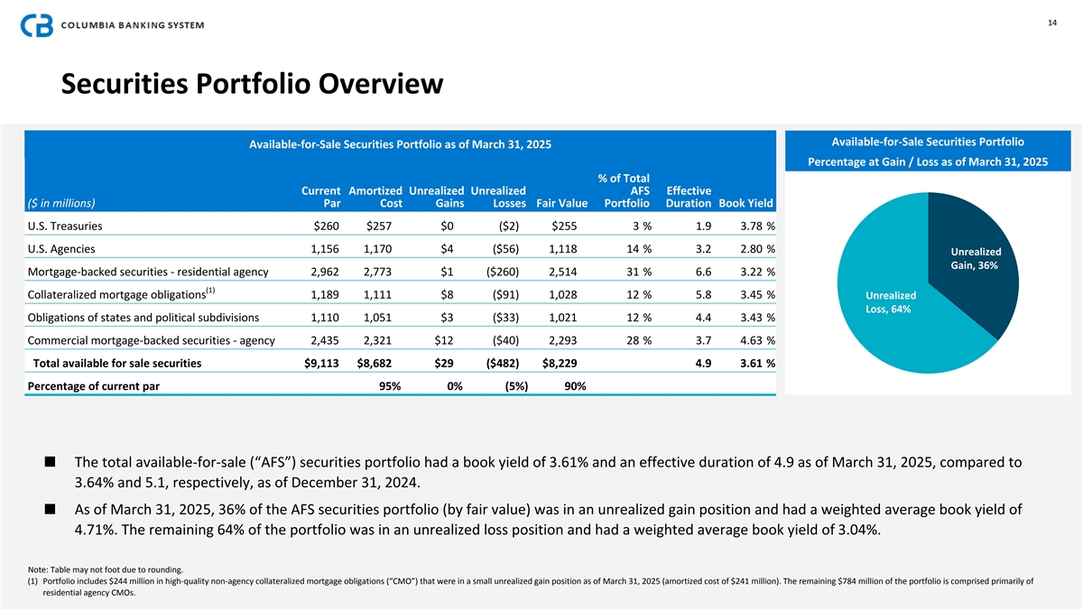 13我们多元化的商业银行业务模式和强大的零售网络支持我们颗粒状、高质量的存款基础(1)全企业存款构成按类别划分的存款客户存款构成商业-小型企业,19%非利息,32%活期,20%非利息,35%活期,19%商业,28%消费者,38%时间,10%时间,14%公共及其他,8%货币市场,28%货币市场,30%储蓄,6%经纪,7%储蓄,6% ■截至2025年3月31日,存款为420亿美元,代表的是按业务线、行业和地域多样化的颗粒状基础。我们(1)的平均客户账户余额为3.6万美元。■我们使用公开和经纪存款作为定期债务以外的资金来源,影响了我们全企业存款组合的构成。(1)我们认为,我们的客户存款构成更能说明哥伦比亚核心存款专营权的质量。我们银行家的活动旨在保护我们基于关系的特许经营的质量,同时产生净客户余额增长,以随着时间的推移减少对非核心资金来源的需求。(1)不包括所有公共、行政和经纪存款,详见附录“流动性概览”幻灯片。截至2025年3月31日,不包括在内的余额占存款总额的15%。这是一项非公认会计准则财务指标。