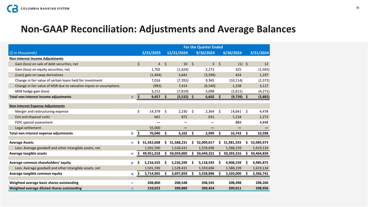 36非美国通用会计准则调节:调整和季度末平均余额(千美元)3/31/202512/31/20249/30/20246/30/20243/31/2024非利息收入调整收益(损失)出售债务证券,净额4美元10美元3美元(1)12美元权益证券收益(损失),净额1,702(1,424)2,272325(1,565)(亏损)掉期衍生工具收益(1,494)3,642(3,596)4241,197持有作投资的若干贷款的公允价值变动7,016(7,355)9,365(10,114)(2,372)估值输入或假设导致的MSR公允价值变动(983)7,414(6,540)1,2383,117 MSR套期保值收益(亏损)3,212(7,819)5,098(1,611)(4,271)非利息收入调整总额a $ 9,457 $(5,532)$ 6,602 $(9,739)$(3,882)非利息费用调整合并重组费用$ 14,379 $ 2,和处置费用6618726311,2181,272 FDIC特别评估———— 8844,848法律和解55,000 ————非利息费用调整总额b $ 70,040 $ 3,102 $ 2,995 $ 16,743 $ 10,598平均资产n $ 51,452,608 $ 51,588,231 $ 52,009,017 $ 51,981,555 $ 52,083,973减:平均商誉和其他无形资产净额1,501,5901,528,4311,559,6961,588,2391,619,134平均有形资产so $ 49,951,018 $ 50,059,800 $ 50,449,321 $ 50,393,316 $ 50,464,839平均普通股股东权益p $ 5,216,555 $净额1,501,5901,528,4311,559,6961,588,2391,619,134平均有形普通股权益q $ 3,714,965 $ 3,697,859 $ 3,558,896 $ 3,320,000 $ 3,366,741加权平均基本流通股r208,800208,548208,545208,498208,260加权平均稀释流通股210,023209,889209,454209,011208,956