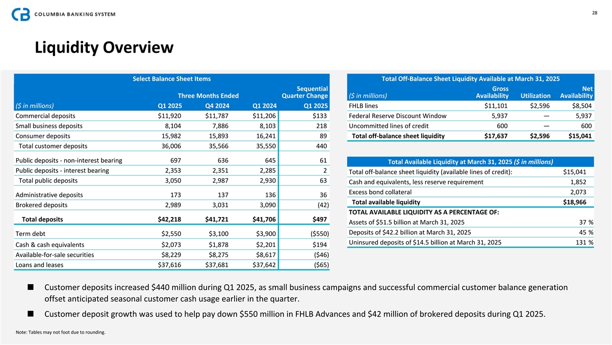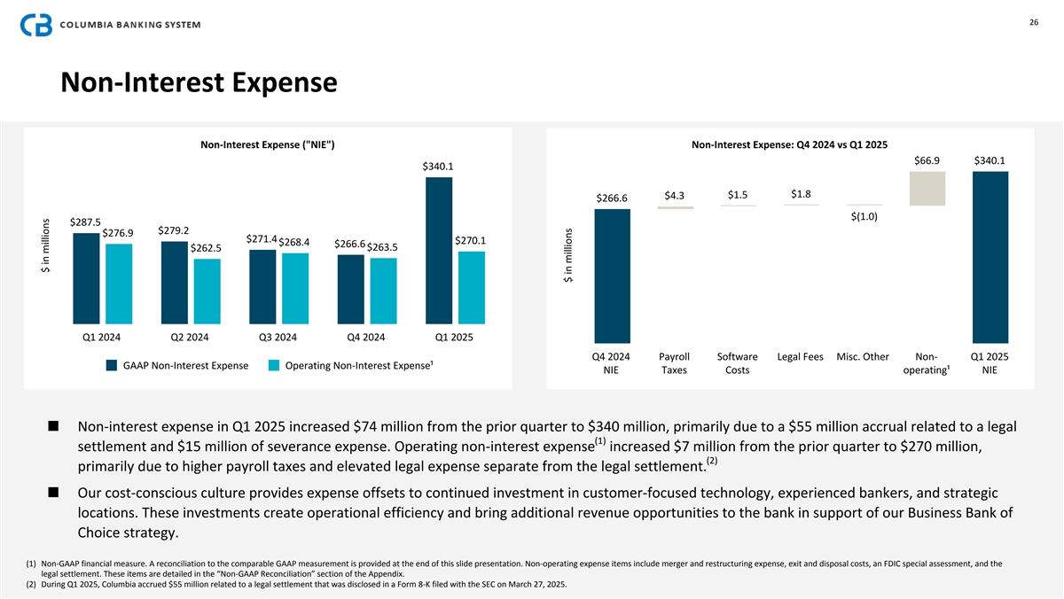 26非利息费用非利息费用(NIE)非利息费用:2024年第四季度与2025年第一季度$ 66.9 $ 340.1 $ 340.1 $ 1.8 $ 1.5 $ 4.3 $ 266.6 $(1.0)$ 287.5 $ 279.2 $ 276.9 $ 271.4 $ 270.1 $ 268.4 $ 266.6 $ 263.5 $ 262.5 Q1 2024Q2 2024Q3 2024Q4 2024Q1 2025 Q4 2024薪资软件法律费用杂项。其他非2025年第一季度GAAP非利息费用运营非利息费用丨NEETaxesCostsOperating丨NIE ■ 2025年第一季度非利息费用较上一季度增加7400万美元至3.4亿美元,主要是由于与法律(1)和解相关的5500万美元应计费用和1500万美元的遣散费。运营非利息支出较上一季度增加700万美元至2.7亿美元,(2)主要是由于工资税增加以及法律和解之外的法律支出增加。■我们注重成本的文化为持续投资于以客户为中心的技术、经验丰富的银行家和战略地点提供了费用抵消。这些投资创造了运营效率,并为银行带来了额外的收入机会,以支持我们的首选商业银行战略。(1)Non-GAAP财务计量。本幻灯片演示文稿末尾提供了与可比GAAP计量的对账。营业外支出项目包括合并重组费用、退出和处置费用、FDIC特别评估、法律和解。这些项目在附录的“非公认会计原则和解”部分中有详细说明。(2)在2025年第一季度,哥伦比亚累积了5500万美元,与2025年3月27日向SEC提交的8-K表格中披露的法律和解有关。百万美元百万美元