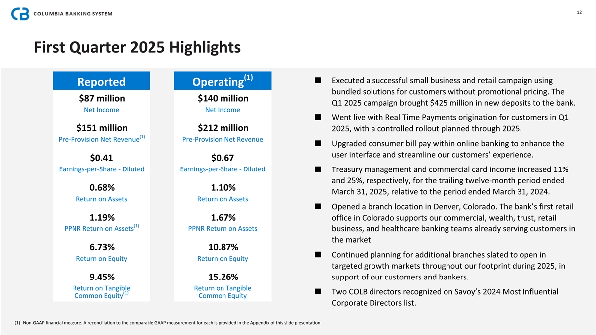 122025年第一季度亮点(1)■使用ReportedOperating捆绑解决方案为客户成功执行小型企业和零售活动,无需促销定价。8700万美元、1.4亿美元的2025年第一季度活动为该银行带来了4.25亿美元的新存款。净收入Net Income ■在2025年第一季度为客户上线了实时支付发起,金额为1.51亿美元,金额为2.12亿美元,计划在2025年之前进行受控推广。(1)预提净利润预提净利润■网银内升级消费账单支付,提升用户界面,精简客户体验。0.41美元0.67美元每股收益-稀释后每股收益-稀释后■财务管理和商业卡收入在截至2025年3月31日的过去12个月期间分别增长11%和25%,相对于截至2024年3月31日的期间增长0.68% 1.10%。资产报酬率资产报酬率■在科罗拉多州丹佛市开设分店。该行在科罗拉多州的首个零售1.19% 1.67%办事处支持我们的商业、财富、信托、零售(1)PPNR资产回报率PPNR资产回报率业务,以及已经在市场上为客户提供服务的医疗银行团队。6.73% 10.87% ■继续规划计划在股本回报率中开设的更多分支机构股本回报率在2025年期间瞄准了我们整个足迹中的增长市场,在客户和银行家的9.45% 15.26%的支持下。有形回报有形回报(1)■两位COLB董事在Savoy的2024年最具影响力普通股公司董事名单上获得认可。(1)Non-GAAP财务计量。本幻灯片演示的附录中提供了与每一项的可比GAAP衡量标准的对账。