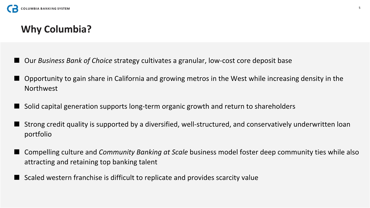 4 哥伦比亚银行系统:独一无二的特许经营哥伦比亚一览以西部为重点的区域强国商业首选银行■市场内、基于关系的商业TickerCOLB银行总部华盛顿州塔科马■在高增长市场拥有有吸引力的足迹在八个州设有办事处~300个■具有现代数字能力的全套存款产品和服务资产520亿美元■在资金管理、外汇和全球现金管理贷款方面拥有380亿美元的专长■扩大小型企业平台存款420亿美元■全面且不断增长的财富咨询和信托业务Common Equity(1)10.6% ■小众垂直领域包括多样化的农业、一级资本比率医疗保健、部落银行,和设备金融(1)总资本比率12.8%(1)监管资本比率是在完成和提交哥伦比亚监管报告之前的估计。截至2025年3月31日的财务公司