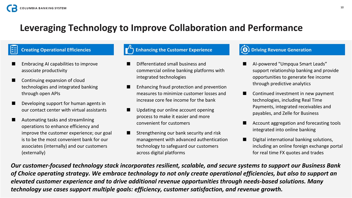 9收购具有战略吸引力和财务吸引力▪100%普通股,无需为支持交易筹集资金▪固定汇率;Pacific Premier股东每进行一笔Pacific Premier股票交易将获得0.9 150股Columbia股票(1)▪预计2025年下半年结业概况▪合并后的组织将以哥伦比亚银行的统一品牌运营▪将哥伦比亚的南加州扩张战略加速约10年▪打造具有战略凝聚力的区域强国,资产规模约700亿美元Strategic▪增强在西北核心市场的影响力并扩大在新增长市场的影响力(例如,凤凰)理由▪强大的企业契合度以及相似的经营和信用理念限制了执行风险▪排名前十的同行备考利润率(例如ROATCE、ROAA、效率)意味着哥伦比亚的估值有上行空间▪Pacific Premier相对资本过剩,截至2025年3月31日的总RBC比率为20.2%,CET1比率为17.0%,财务(1)▪14% 2026E EPS增值与初始有形账面价值摊薄三年恢复(交叉法)有吸引力▪盯市处理增强资产负债表重组灵活性▪为了降低我们合并后的备考资产敏感性,我们打算在收盘前购买最多30亿美元的投资证券,由短期批发资金提供资金;我们打算在收盘后通过出售收购的证券资产负债表和偿还短期批发资金来抵消这一行动准备▪我们预计证券收益率和融资成本之间存在约20个基点的正利差,导致每执行10亿美元的净利息收入略高,净息差稀释约8个基点,具体取决于市场情况(1)备考财务假设和调整见附录。