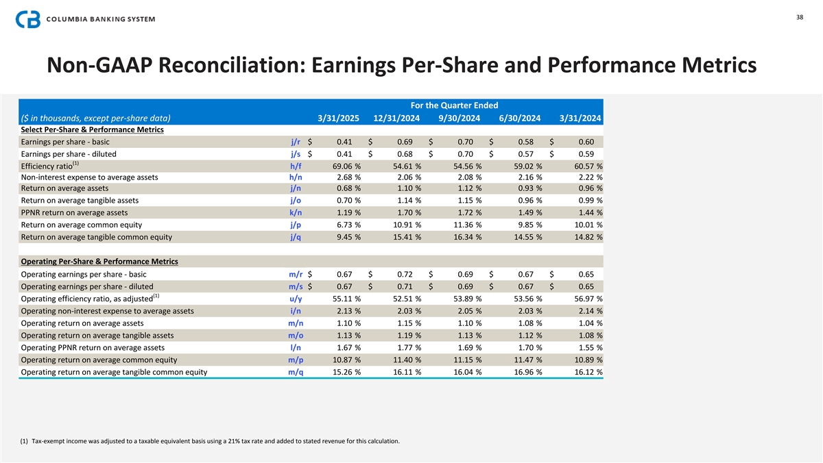 38非公认会计准则对账:截至本季度的每股收益和业绩指标(单位:千美元,每股数据除外)3/31/202512/31/20249/30/20246/30/20243/31/2024选择每股&业绩指标每股收益-basicj/r $ 0.41 $ 0.69 $ 0.70 $ 0.58 $ 0.60每股收益-dilutedj/s $ 0.41 $ 0.68 $ 0.70 $ 0.57 $ 0.59(1)Efficiency ratioh/f6 9.06% 54.61% 54.56% 59.02% 60.57%非利息费用占平均资产SH/n 2.68% 2.06% 2.08% 2.16% 2.22%平均资产收益率j/n0.68 % 1.10% 1.12% 0.93% 0.96%平均有形资产收益率j/o0.70 % 1.14% 1.15%. 70% 1.72% 1.49% 1.44%平均普通股本回报率j/p 6.73% 10.91% 11.36% 9.85% 10.01%平均有形普通股本回报率j/q9.45 % 15.41% 16.34% 14.55% 14.82%每股经营收益和业绩指标每股经营收益-basicm/r $ 0.67 $ 0.72 $ 0.69 $ 0.67 $ 0.65每股经营收益-dilutedm/s $ 0.67 $ 0.71 $ 0.69 $ 0.67 $ 0.65(1)经营效率比率,经调整/y5 5.11% 52.51% 53.89% 53.56% 56.97%经营性非利息费用占平均资产i/n2. 13% 2.03% 2.05% 2.03% 2.03% 2.14%经营性平均资产收益率m/n 1.10% 1.15% 1.10% 1.08% 1.04%经营性平均有形资产收益率m/o1. 13% 1.19% 1.13% 1.12% 1.08%经营性PPNR平均资产收益率l/n 1.67% 1.77% 1.69% 1.69% 1.70% 1.55%经营性平均普通股权益收益率m/p 10.87% 11.40% 11.15% 11.47% 10.89%经营性平均有形普通股权益收益率m/q1 5.26% 16.11% 16.04% 16.96% 16.12%(1)免税所得按21%的税率调整为等值计税基础,并加入申报收入计算。