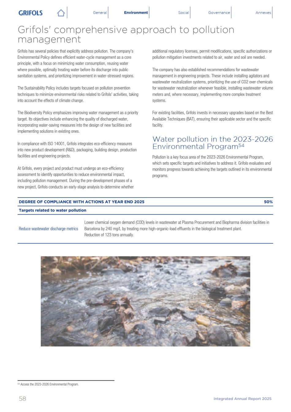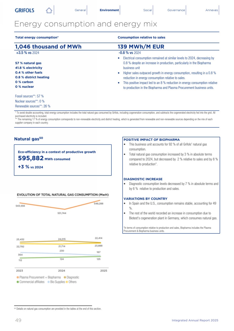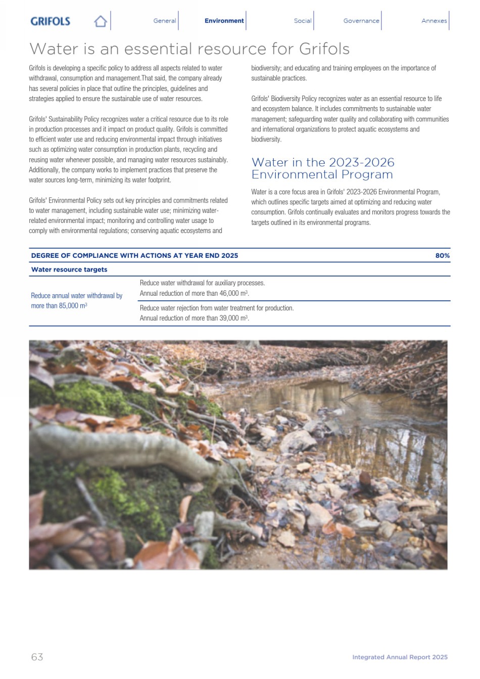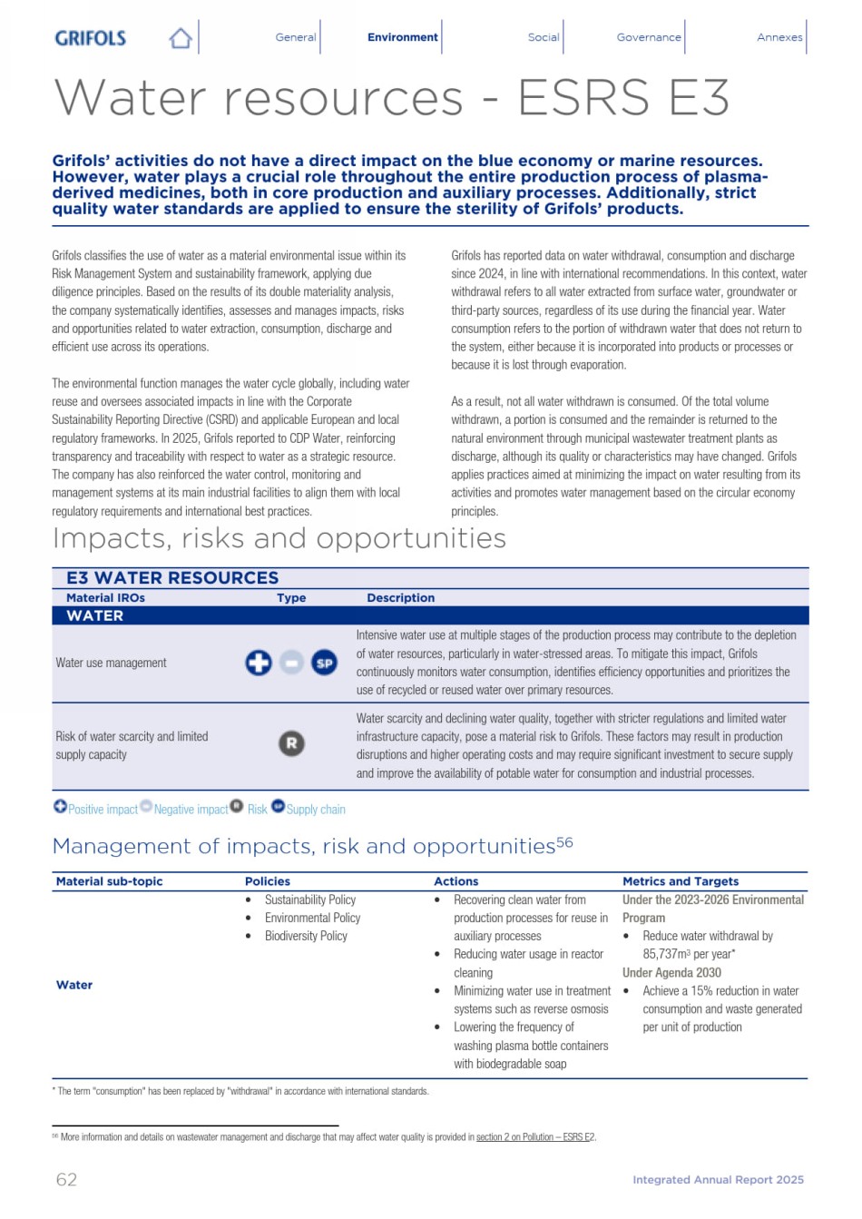 与ESRS 2 IRO-1相关的影响、风险和机会管理DR描述识别和评估与气候相关的实质性影响、风险和机会的过程17-24,39-40,205-209 DR E1-2与气候变化缓解和适应相关的政策29,43 DR E1-3与气候变化政策相关的行动和资源32,43-46与气候变化缓解和适应相关的指标和目标DR E1-4目标47 DR E1-5能源消耗和组合49-51,53-56 DR E1-6总范围1、2、3和通过碳积分融资的总GHG排放量48、52-53 DR E1-7 GHG清除量和GHG缓解项目47 DR E1-8内部碳定价48 DR E1-9来自物质物理和过渡风险以及与气候相关的潜在机会的预期财务影响41-42 ESRS E2污染影响、与ESRS 2 IRO相关的风险和机会管理DR-1识别和评估物质污染相关影响的过程描述,风险和机遇17-21,205-209 DR E2-1与污染相关的政策57 DR E2-2与污染相关的行动和资源32,58-59指标和目标DR E2-3与污染相关的目标58-59 DR E2-4对空气、水和土壤的污染59-60。土壤和空气污染不是物质。DR E2-5关注物质和非常高关注物质59。不是物质。DR E2-6污染相关影响、风险和机遇带来的预期财务影响Grifols正在努力扩展这些信息。ESRS E3与ESRS 2 IRO相关的水和海洋资源影响、风险和机会管理DR-1识别和评估物质水和海洋资源相关影响、风险和机会的过程描述17,62,205-209 DR E3-1与水和海洋资源相关的政策62-63 DR E3-2与水和海洋资源相关的行动和资源32,63-64指标和目标DR E3-3与水和海洋资源相关的目标63-64 DR E3-4水消耗64-67 DR E3-5水和海洋资源相关影响、风险和机遇的预期财务影响Grifols正在努力扩展这些信息。ESRS E4生物多样性和生态系统战略DR E4-1过渡计划和在战略和商业模式中考虑生物多样性和生态系统不是与ESRS 2相关的重大DR SBM-3重大影响、风险和机会及其与战略和商业模式的相互作用不是与ESRS 2相关的重大影响、风险和机会管理DR IRO-1识别和评估重大生物多样性和生态系统相关影响的过程描述,风险和机会不重要DR E4-2与生物多样性和生态系统有关的政策不重要DR E4-3与生物多样性和生态系统有关的行动和资源不重要披露要求内容页码一般环境社会治理附件219综合年度报告2025