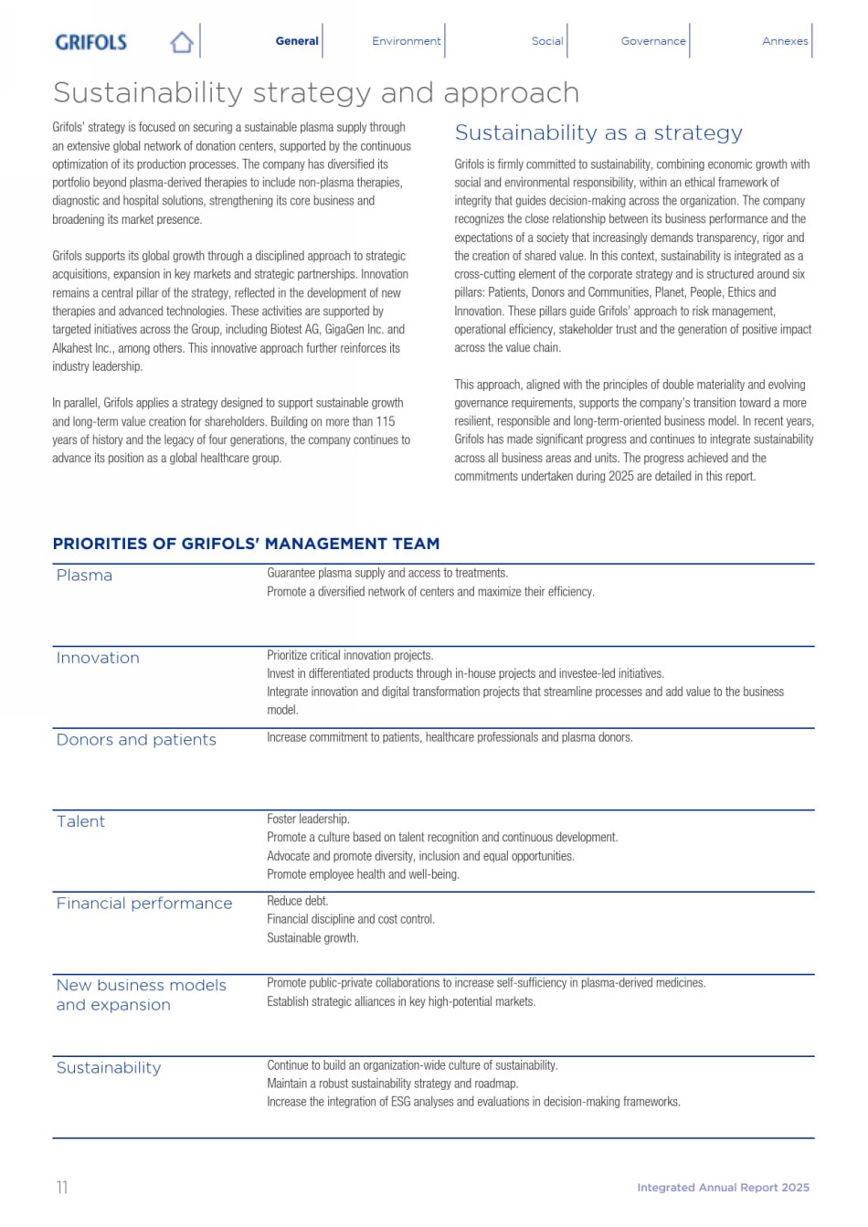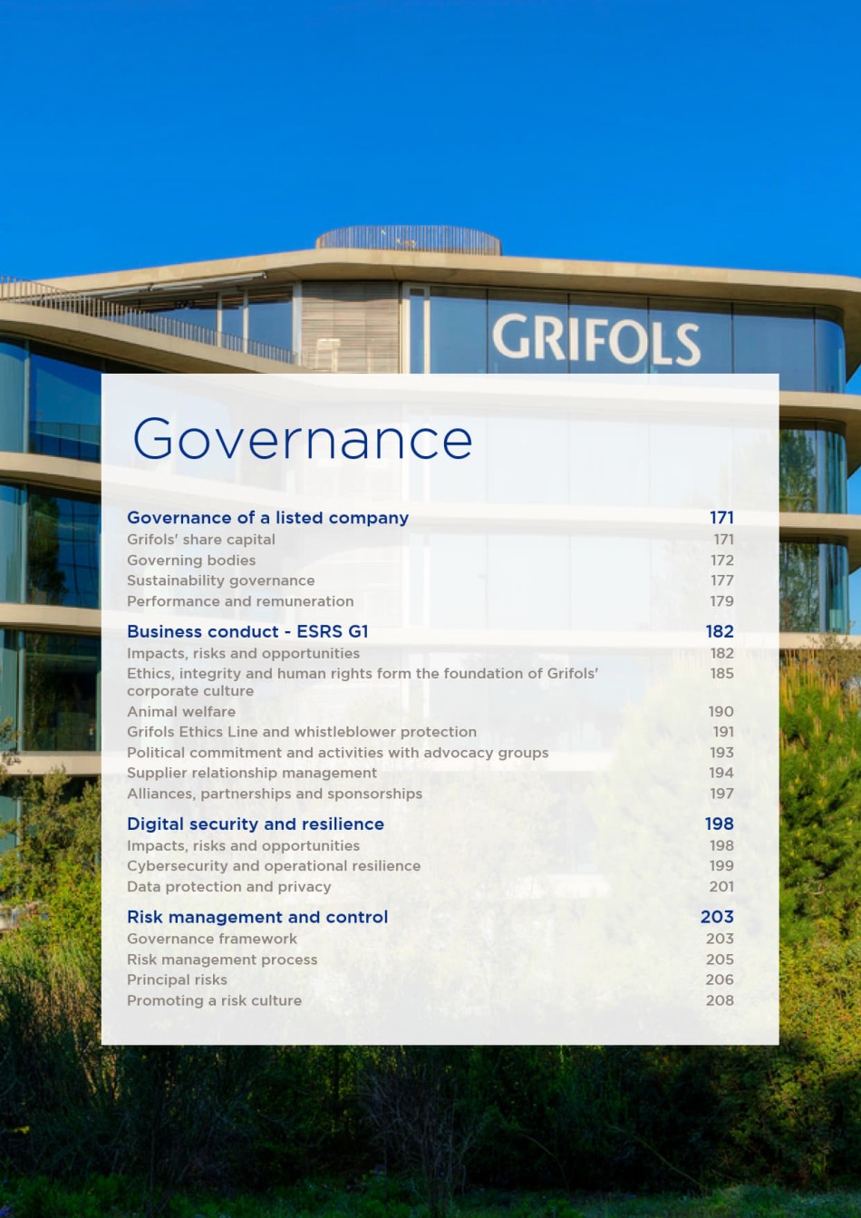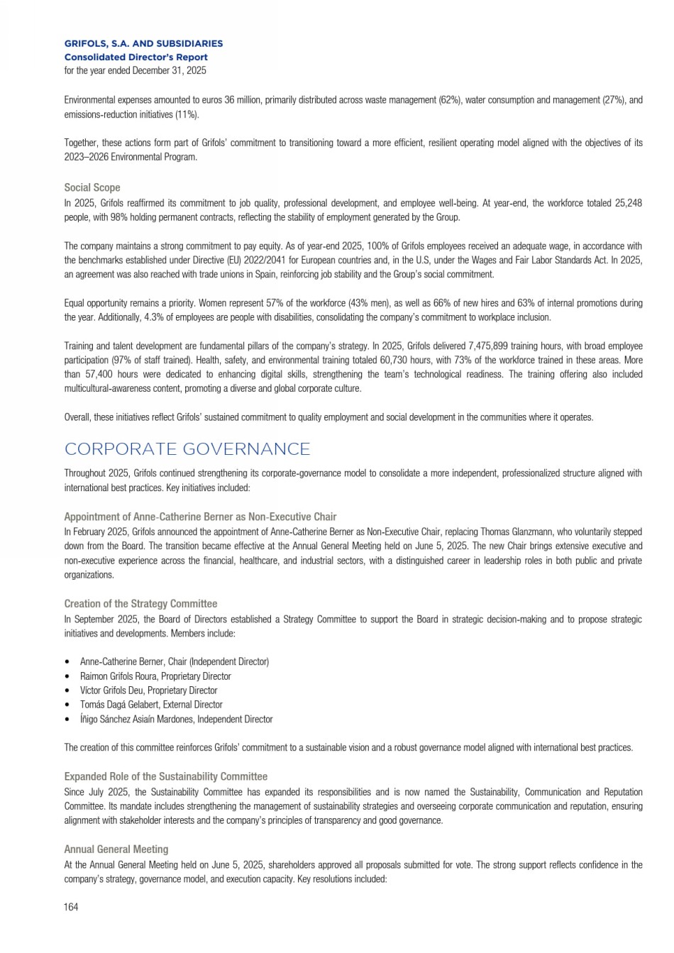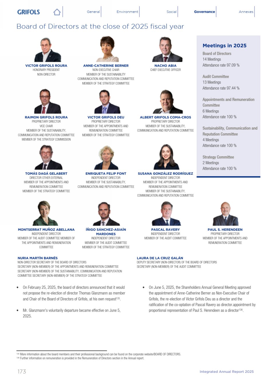 理事机构股东大会是Grifols的主权理事机构。公司鼓励全体股东参加,无最低股本要求。Grifols的2024年普通股东大会于2025年6月5日召开,投票资本代表比例为69.72%。Grifols的股东批准了提交给投票的所有提案e 133。董事会是Grifols的最高决策机构。根据《公司章程》第二十条和《董事会章程》第七条的规定,董事会负责公司的管理和法律代表,必须由不少于三名且不超过十五名成员组成。根据最近一次年度股东大会通过的决议,董事会目前由十二名董事组成。截至2025年12月31日,Grifols董事会由12名成员组成(截至2024年12月31日为13名成员)134。董事会成员任期四年,不影响其无限期连任相同期限的后续任期。所有委员会完全由独立董事组成。这适用于任命和薪酬委员会、审计委员会、可持续发展、沟通和声誉委员会以及新的战略委员会。自2024年4月1日起,所有执行职能均归属首席执行官,使公司与公认的治理最佳实践保持一致。自2024年9月以来,Grifols的主席一直担任非执行职务。自2023年12月18日辞去董事会成员职务后,Víctor Grifols Roura继续担任名誉主席。Grifols发布公司治理报告*一年一次。经董事会批准,它提供了有关其所有权和管理结构的详细信息,以及其他相关问题。大环境社会治理附件172综合年度报告2025133更多详细信息,请访问企业网站。134有关Grifols董事会委员会及其成员、章程、法规和运营报告的信息可在Grifols公司网站的“委员会”下公开获取。2025年加强治理2025年,Grifols成立了新的战略委员会,并扩大了其前可持续发展委员会的任务,该委员会已更名为可持续发展、传播和声誉委员会。董事会委员会的这些变化,连同2024年实施的措施,加强了所有权和管理层之间的分离,支持继续推进2022年启动的公司治理战略。股东大会董事会任命及薪酬委员会审计委员会可持续发展、沟通及声誉委员会战略委员会CEO执行团队