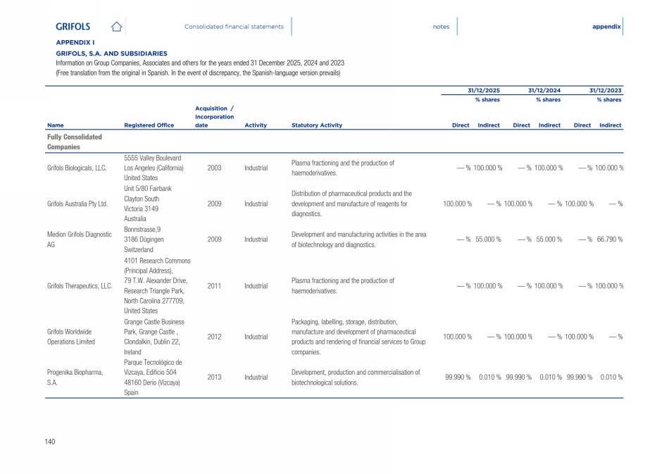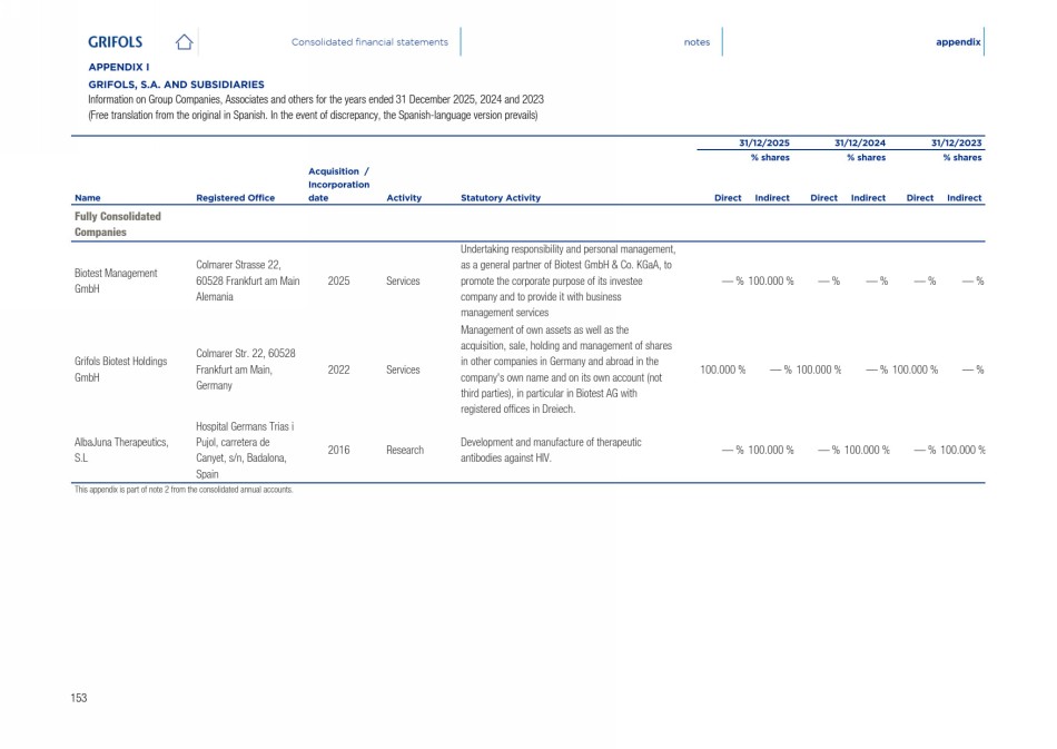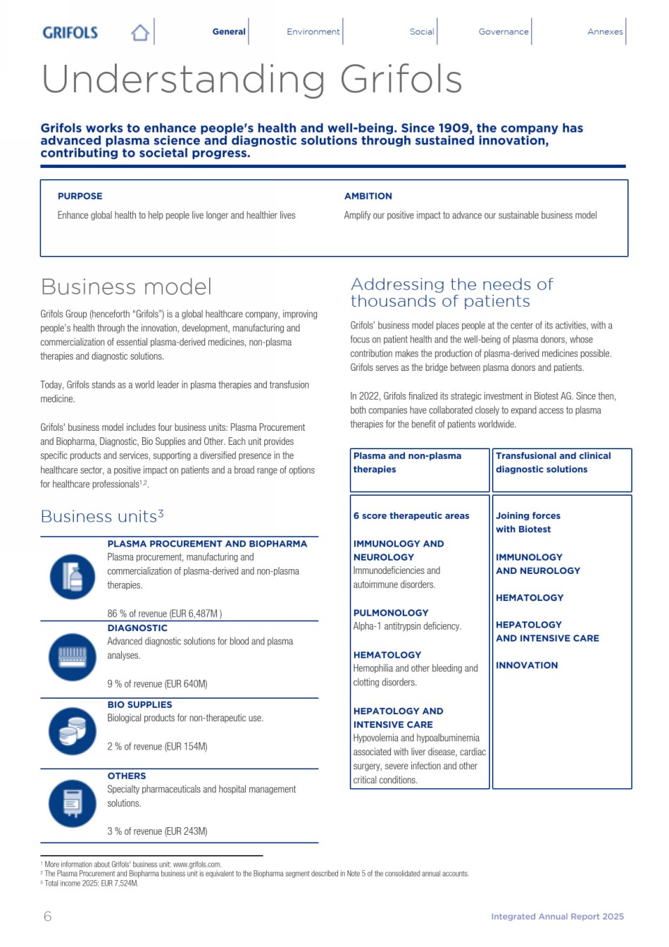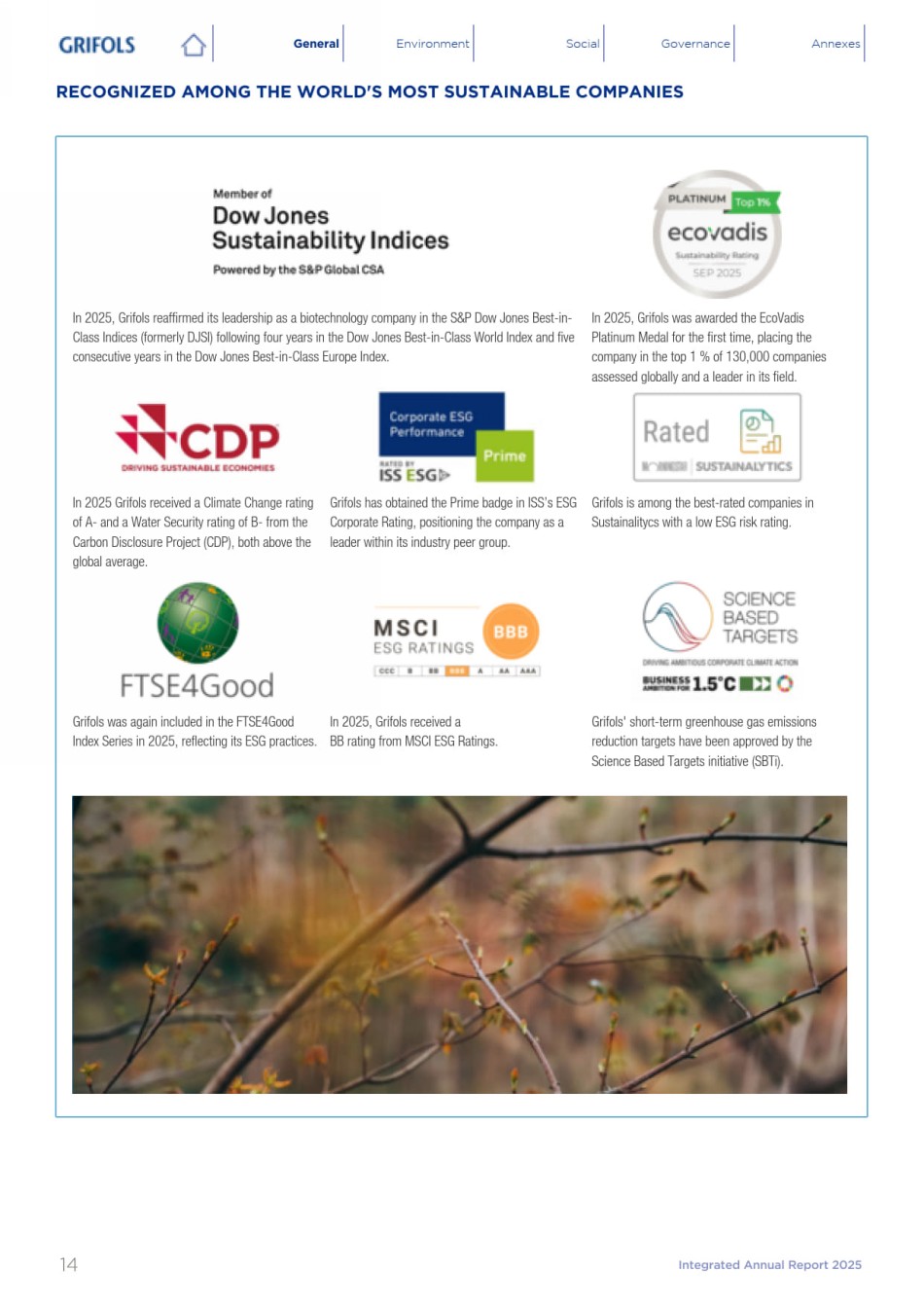 理事机构股东大会是Grifols的主权理事机构。公司鼓励全体股东参加,无最低股本要求。Grifols的2024年普通股东大会于2025年6月5日召开,投票资本代表比例为69.72%。Grifols的股东批准了提交给投票的所有提案e 133。董事会是Grifols的最高决策机构。根据《公司章程》第二十条和《董事会章程》第七条的规定,董事会负责公司的管理和法律代表,必须由不少于三名且不超过十五名成员组成。根据最近一次年度股东大会通过的决议,董事会目前由十二名董事组成。截至2025年12月31日,Grifols董事会由12名成员组成(截至2024年12月31日为13名成员)134。董事会成员任期四年,不影响其无限期连任相同期限的后续任期。所有委员会完全由独立董事组成。这适用于任命和薪酬委员会、审计委员会、可持续发展、沟通和声誉委员会以及新的战略委员会。自2024年4月1日起,所有执行职能均归属首席执行官,使公司与公认的治理最佳实践保持一致。自2024年9月以来,Grifols的主席一直担任非执行职务。自2023年12月18日辞去董事会成员职务后,Víctor Grifols Roura继续担任名誉主席。Grifols发布公司治理报告*一年一次。经董事会批准,它提供了有关其所有权和管理结构的详细信息,以及其他相关问题。大环境社会治理附件172综合年度报告2025133更多详细信息,请访问企业网站。134有关Grifols董事会委员会及其成员、章程、法规和运营报告的信息可在Grifols公司网站的“委员会”下公开获取。2025年加强治理2025年,Grifols成立了新的战略委员会,并扩大了其前可持续发展委员会的任务,该委员会已更名为可持续发展、传播和声誉委员会。董事会委员会的这些变化,连同2024年实施的措施,加强了所有权和管理层之间的分离,支持继续推进2022年启动的公司治理战略。股东大会董事会任命及薪酬委员会审计委员会可持续发展、沟通及声誉委员会战略委员会CEO执行团队