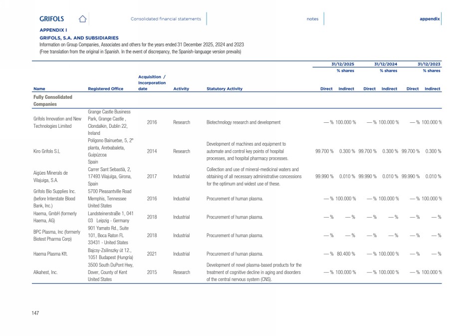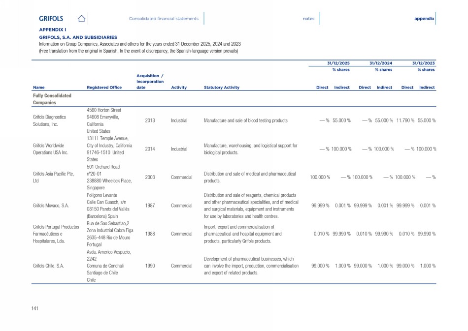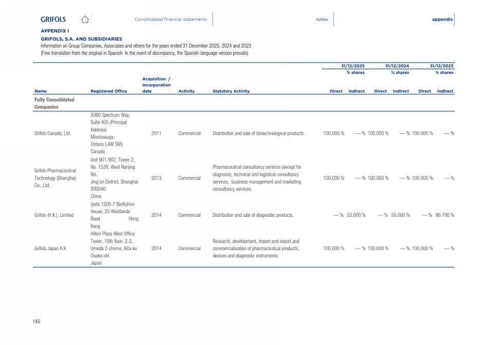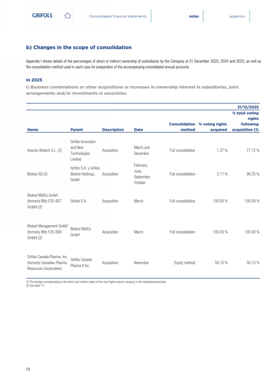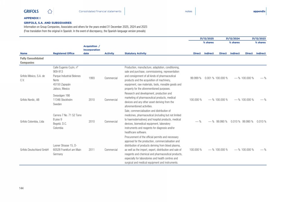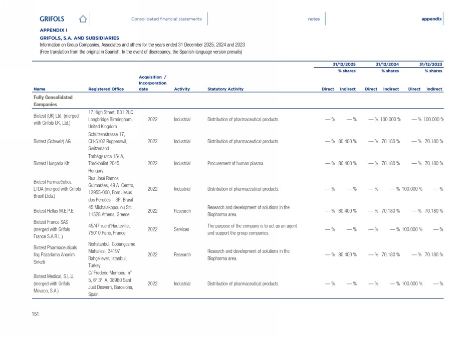理事机构股东大会是Grifols的主权理事机构。公司鼓励全体股东参加,无最低股本要求。Grifols的2024年普通股东大会于2025年6月5日召开,投票资本代表比例为69.72%。Grifols的股东批准了提交给投票的所有提案e 133。董事会是Grifols的最高决策机构。根据《公司章程》第二十条和《董事会章程》第七条的规定,董事会负责公司的管理和法律代表,必须由不少于三名且不超过十五名成员组成。根据最近一次年度股东大会通过的决议,董事会目前由十二名董事组成。截至2025年12月31日,Grifols董事会由12名成员组成(截至2024年12月31日为13名成员)134。董事会成员任期四年,不影响其无限期连任相同期限的后续任期。所有委员会完全由独立董事组成。这适用于任命和薪酬委员会、审计委员会、可持续发展、沟通和声誉委员会以及新的战略委员会。自2024年4月1日起,所有执行职能均归属首席执行官,使公司与公认的治理最佳实践保持一致。自2024年9月以来,Grifols的主席一直担任非执行职务。自2023年12月18日辞去董事会成员职务后,Víctor Grifols Roura继续担任名誉主席。Grifols发布公司治理报告*一年一次。经董事会批准,它提供了有关其所有权和管理结构的详细信息,以及其他相关问题。大环境社会治理附件172综合年度报告2025133更多详细信息,请访问企业网站。134有关Grifols董事会委员会及其成员、章程、法规和运营报告的信息可在Grifols公司网站的“委员会”下公开获取。2025年加强治理2025年,Grifols成立了新的战略委员会,并扩大了其前可持续发展委员会的任务,该委员会已更名为可持续发展、传播和声誉委员会。董事会委员会的这些变化,连同2024年实施的措施,加强了所有权和管理层之间的分离,支持继续推进2022年启动的公司治理战略。股东大会董事会任命及薪酬委员会审计委员会可持续发展、沟通及声誉委员会战略委员会CEO执行团队