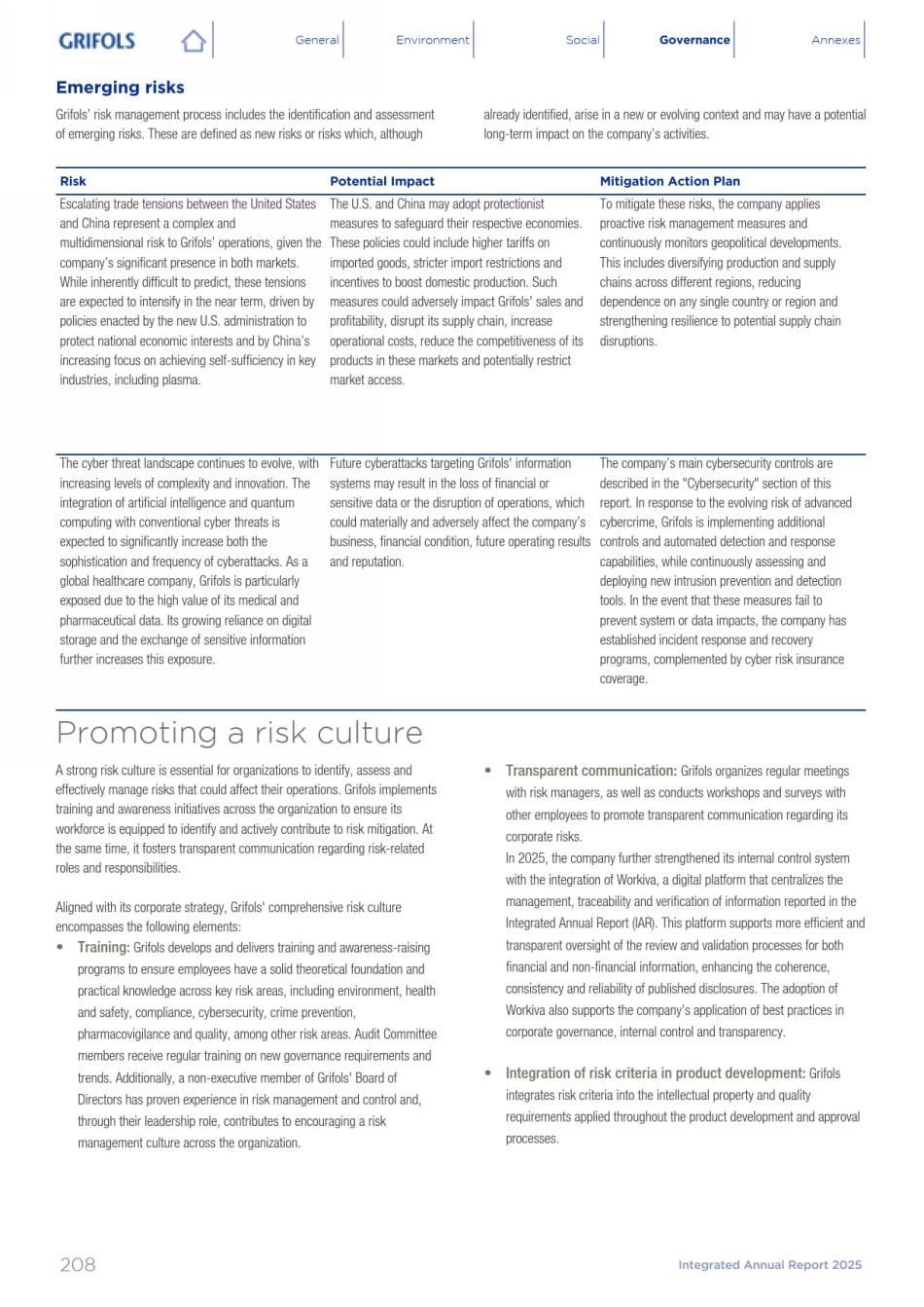 新兴风险Grifols的风险管理流程包括识别和评估新兴风险。这些被定义为新的风险或风险,尽管已经确定,但在新的或不断变化的背景下出现,并可能对公司的活动产生潜在的长期影响。风险潜在影响缓解行动计划美国和中国之间贸易紧张局势的升级对Grifols的业务构成了复杂和多层面的风险,因为该公司在这两个市场都有重要的存在。虽然这些紧张局势本质上难以预测,但在美国新政府为保护国家经济利益而制定的政策以及中国越来越注重在包括等离子在内的关键行业实现自给自足的推动下,预计这些紧张局势将在短期内加剧。美中两国可能会采取保护主义措施来维护各自的经济。这些政策可能包括提高进口商品的关税、更严格的进口限制以及刺激国内生产的措施。这些措施可能会对Grifols的销售和盈利能力产生不利影响,扰乱其供应链,增加运营成本,降低其产品在这些市场的竞争力,并可能限制市场准入。为减轻这些风险,该公司采取了积极主动的风险管理措施,并持续监测地缘政治发展。这包括使不同地区的生产和供应链多样化,减少对任何单一国家或地区的依赖,并加强对潜在供应链中断的抵御能力。网络威胁格局不断演变,复杂性和创新性水平不断提高。人工智能和量子计算与常规网络威胁相结合,有望显著提高网络攻击的复杂程度和频率。作为一家全球性的医疗保健公司,由于其医疗和制药数据的高价值,Grifols的曝光度尤其高。它对数字存储和敏感信息交换的日益依赖进一步增加了这种曝光率。未来针对Grifols信息系统的网络攻击可能会导致财务或敏感数据丢失或运营中断,这可能会对公司的业务、财务状况、未来经营业绩和声誉产生重大不利影响。该公司的主要网络安全控制措施在本报告“网络安全”部分进行了描述。为应对不断演变的高级网络犯罪风险,Grifols正在实施额外的控制和自动化检测和响应能力,同时不断评估和部署新的入侵预防和检测工具。在这些措施未能防止系统或数据影响的情况下,该公司建立了事件响应和恢复计划,并辅以网络风险保险范围。促进风险文化强大的风险文化对于组织识别、评估和有效管理可能影响其运营的风险至关重要。Grifols在整个组织内实施培训和提高认识举措,以确保其员工具备识别风险并积极促进风险缓解的能力。同时,它促进关于风险相关角色和责任的透明沟通。根据其公司战略,Grifols全面的风险文化包含以下要素:•培训:Grifols制定并提供培训和提高认识计划,以确保员工在关键风险领域拥有坚实的理论基础和实践知识,包括环境、健康和安全、合规、网络安全、预防犯罪、药物警戒和质量等风险领域。审计委员会成员定期接受有关新治理要求和趋势的培训。此外,Grifols董事会的一名非执行成员在风险管理和控制方面已证明具有经验,并通过他们的领导作用,为鼓励整个组织的风险管理文化做出了贡献。•透明沟通:Grifols组织与风险管理人员的定期会议,并与其他员工开展研讨会和调查,以促进关于其公司风险的透明沟通。2025年,公司通过整合对综合年度报告(IAR)中报告的信息进行集中管理、追溯和验证的数字化平台Workiva,进一步加强了内部控制体系。该平台支持对财务和非财务信息的审查和验证过程进行更高效和透明的监督,增强已公布披露信息的一致性、一致性和可靠性。Workiva的采用也支持该公司应用公司治理方面的最佳实践, 内部控制和透明度。•在产品开发中整合风险标准:Grifols将风险标准整合到整个产品开发和批准过程中应用的知识产权和质量要求中。大环境社会治理附件208综合年度报告2025