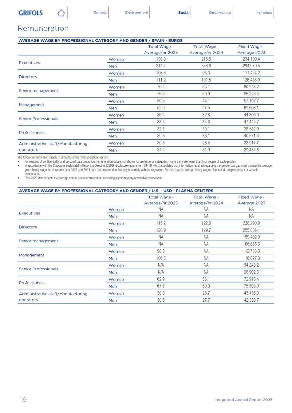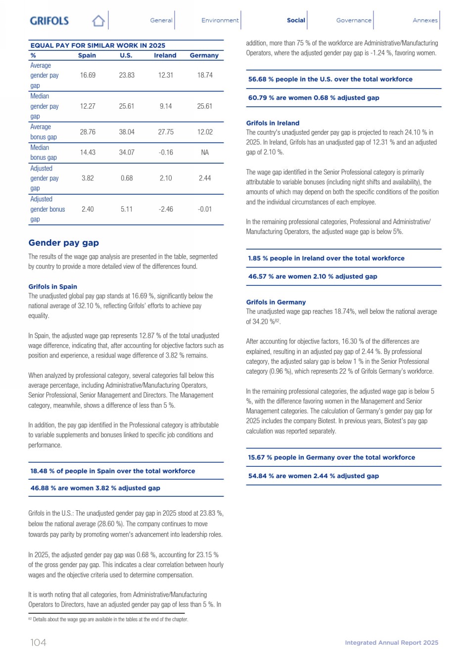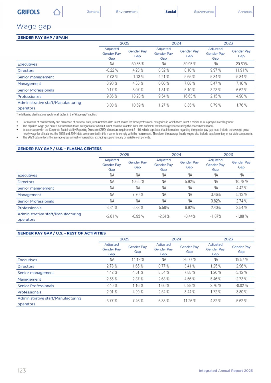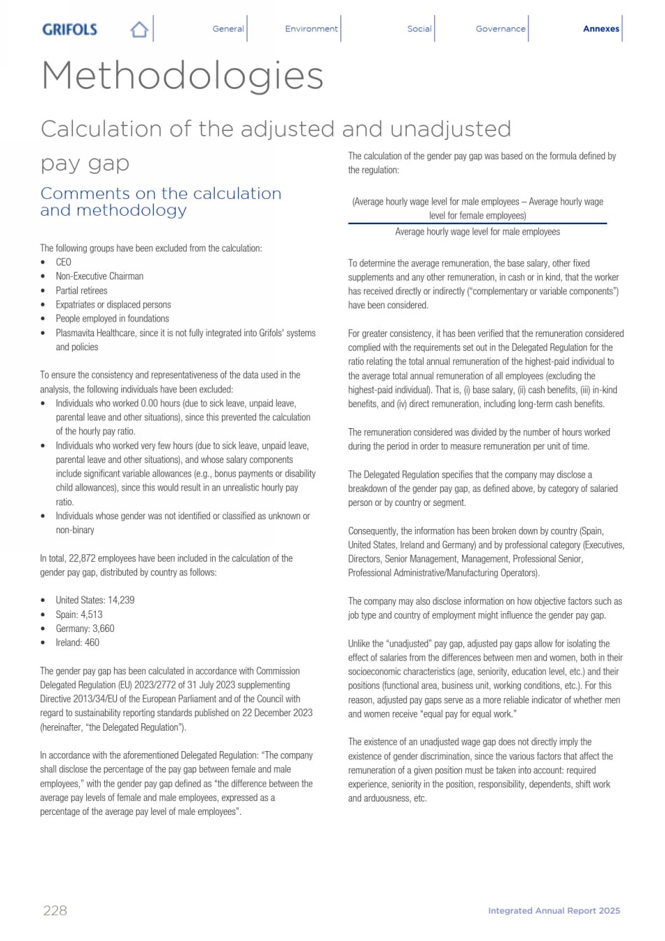 方法计算调整后和未调整的薪酬差距对计算和方法的评论以下群体被排除在计算之外:•首席执行官•非执行主席•部分退休人员•外籍人士或流离失所人员•在基金会工作的人• Plasmavita Healthcare,由于没有完全纳入Grifols的系统和政策以确保分析中使用的数据的一致性和代表性,以下个人被排除在外:•工作0.00小时的个人(由于病假、无薪假、育儿假等情况),因为这阻止了小时工资比例的计算。•工作时间很少的个人(由于病假、无薪假、育儿假和其他情况),其工资组成部分包括大量可变津贴(例如奖金支付或残疾儿童津贴),因为这将导致不现实的小时工资比率。•性别未被识别或归类为未知或非二元的个人,共有22,872名雇员被纳入性别薪酬差距计算,按国家分布如下:•美国:14,239 •西班牙:4,513 •德国:3,660 •爱尔兰:460性别薪酬差距是根据2023年7月31日的委员会授权条例(EU)2023/2772计算得出的,该条例补充了欧洲议会和理事会于2023年12月22日公布的关于可持续性报告标准的第2013/34/EU号指令(以下简称“授权条例”)。按照前述授权规定:“公司应当披露男女员工薪酬差距的百分比”,性别薪酬差距定义为“男女员工平均薪酬水平的差异,以男性员工平均薪酬水平的百分比表示”。性别薪酬差距的计算依据的是条例界定的公式:(男性雇员的平均小时工资水平–女性雇员的平均小时工资水平)男性雇员的平均小时工资水平,以确定工人直接或间接获得的平均薪酬、基本工资、其他固定补助和任何其他现金或实物报酬(“互补或可变部分”)均已考虑在内。为了更大的一致性,经核实,所考虑的薪酬符合《授权条例》中关于最高薪酬个人的年度薪酬总额与全体雇员(不包括最高薪酬个人)的平均年度薪酬总额相关比率的要求。即(i)基本工资,(ii)现金福利,(iii)实物福利,以及(iv)直接薪酬,包括长期现金福利。所考虑的薪酬除以该期间的工作小时数,以衡量每单位时间的薪酬。授权条例规定,公司可以按受薪人员类别或按国家或部门披露上述定义的性别薪酬差距细分。因此,这些信息已按国家(西班牙、美国、爱尔兰和德国)和专业类别(高管、董事、高级管理人员、管理人员、专业高级人员、专业行政/制造运营商)进行了细分。该公司还可能披露有关工作类型和就业国家等客观因素如何影响性别薪酬差距的信息。与“未调整”的薪酬差距不同,调整后的薪酬差距允许将薪酬的影响与男女之间的差异隔离开来,无论是社会经济特征(年龄、资历、教育水平等)还是职位(职能领域、业务单位、工作条件等)。出于这个原因,调整后的薪酬差距成为衡量男女是否“同工同酬”的更可靠指标。存在未经调整的工资差距并不直接意味着存在性别歧视,因为必须考虑到影响特定职位薪酬的各种因素:所需的经验、该职位的资历、责任、受抚养人、轮班工作和艰巨性等。大环境社会治理附件228综合年度报告2025