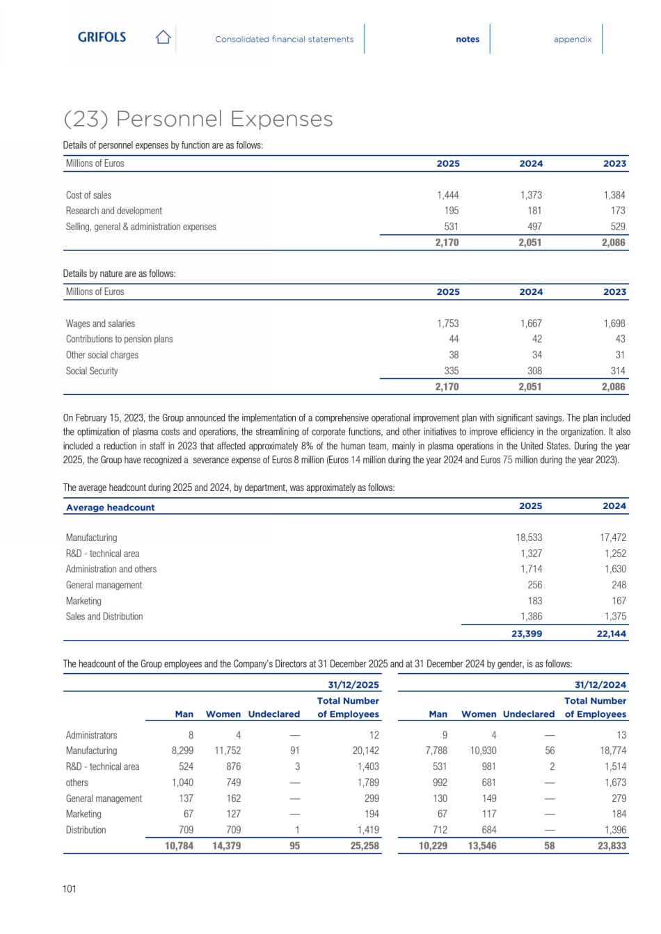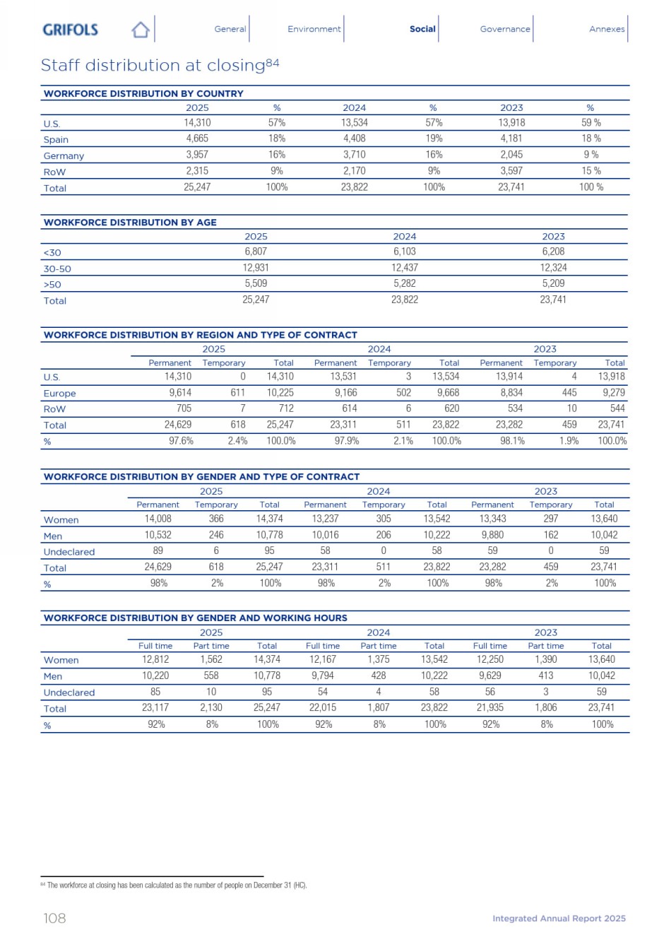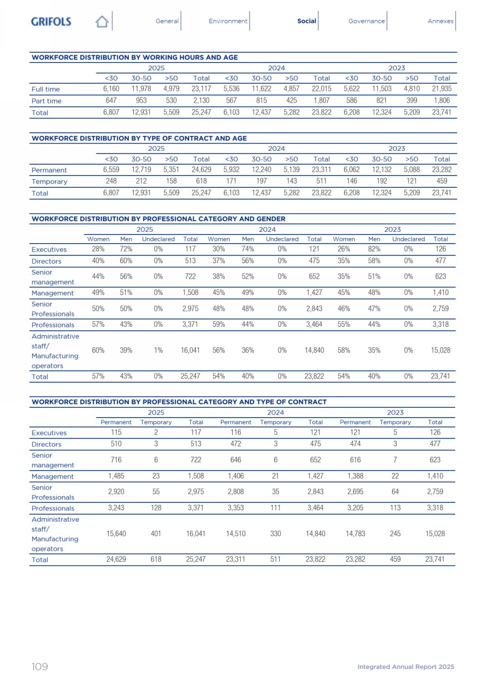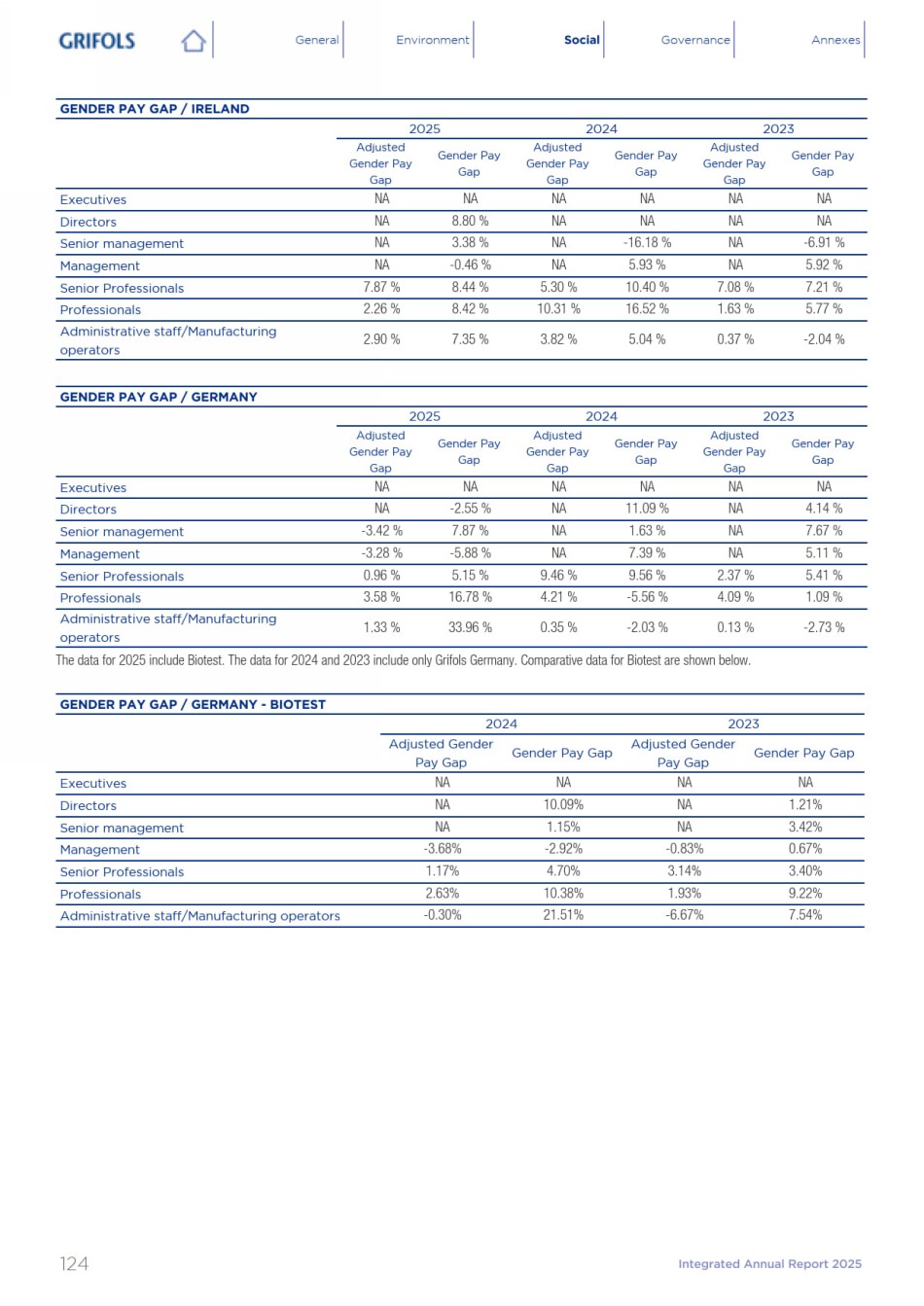 方法计算调整后和未调整的薪酬差距对计算和方法的评论以下群体被排除在计算之外:•首席执行官•非执行主席•部分退休人员•外籍人士或流离失所人员•在基金会工作的人• Plasmavita Healthcare,由于没有完全纳入Grifols的系统和政策以确保分析中使用的数据的一致性和代表性,以下个人被排除在外:•工作0.00小时的个人(由于病假、无薪假、育儿假等情况),因为这阻止了小时工资比例的计算。•工作时间很少的个人(由于病假、无薪假、育儿假和其他情况),其工资组成部分包括大量可变津贴(例如奖金支付或残疾儿童津贴),因为这将导致不现实的小时工资比率。•性别未被识别或归类为未知或非二元的个人,共有22,872名雇员被纳入性别薪酬差距计算,按国家分布如下:•美国:14,239 •西班牙:4,513 •德国:3,660 •爱尔兰:460性别薪酬差距是根据2023年7月31日的委员会授权条例(EU)2023/2772计算得出的,该条例补充了欧洲议会和理事会于2023年12月22日公布的关于可持续性报告标准的第2013/34/EU号指令(以下简称“授权条例”)。按照前述授权规定:“公司应当披露男女员工薪酬差距的百分比”,性别薪酬差距定义为“男女员工平均薪酬水平的差异,以男性员工平均薪酬水平的百分比表示”。性别薪酬差距的计算依据的是条例界定的公式:(男性雇员的平均小时工资水平–女性雇员的平均小时工资水平)男性雇员的平均小时工资水平,以确定工人直接或间接获得的平均薪酬、基本工资、其他固定补助和任何其他现金或实物报酬(“互补或可变部分”)均已考虑在内。为了更大的一致性,经核实,所考虑的薪酬符合《授权条例》中关于最高薪酬个人的年度薪酬总额与全体雇员(不包括最高薪酬个人)的平均年度薪酬总额相关比率的要求。即(i)基本工资,(ii)现金福利,(iii)实物福利,以及(iv)直接薪酬,包括长期现金福利。所考虑的薪酬除以该期间的工作小时数,以衡量每单位时间的薪酬。授权条例规定,公司可以按受薪人员类别或按国家或部门披露上述定义的性别薪酬差距细分。因此,这些信息已按国家(西班牙、美国、爱尔兰和德国)和专业类别(高管、董事、高级管理人员、管理人员、专业高级人员、专业行政/制造运营商)进行了细分。该公司还可能披露有关工作类型和就业国家等客观因素如何影响性别薪酬差距的信息。与“未调整”的薪酬差距不同,调整后的薪酬差距允许将薪酬的影响与男女之间的差异隔离开来,无论是社会经济特征(年龄、资历、教育水平等)还是职位(职能领域、业务单位、工作条件等)。出于这个原因,调整后的薪酬差距成为衡量男女是否“同工同酬”的更可靠指标。存在未经调整的工资差距并不直接意味着存在性别歧视,因为必须考虑到影响特定职位薪酬的各种因素:所需的经验、该职位的资历、责任、受抚养人、轮班工作和艰巨性等。大环境社会治理附件228综合年度报告2025