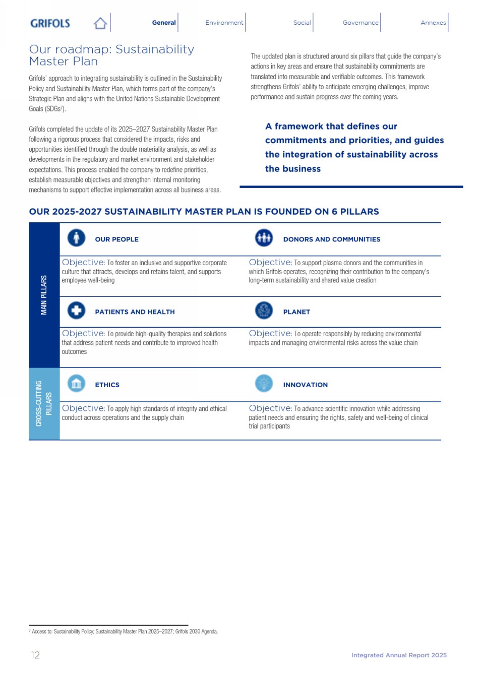 可持续发展、传播和声誉委员会成员Susana Gonz á lez Rodr í guez独立董事–委员会主席Enriqueta Felip Font独立董事Anne-Catherine Berner独立董事Albert Grifols Coma-Cros专有董事丨Raimon Grifols Roura 丨Nuria Martín Barnés非董事秘书将可持续发展纳入Grifols为2025年至2027年期间制定的战略Grifols可持续发展政策和可持续发展总体规划是其战略计划的一部分,并与联合国可持续发展目标(SDGs)保持一致。该公司的可持续发展政策得到了其他政策、计划和正式承诺的支持,以从ESG角度促进Grifols活动的实质性方面。新的可持续发展总体规划2025-2027年2025年,Grifols推出了新的可持续发展总体规划,通过将ESG原则逐步纳入其公司战略,在十多年来致力于长期价值创造的基础上再接再厉。该计划围绕六大支柱——人、捐助者和社区、患者与健康、创新、地球和伦理——构建,指导公司的可持续管理并制定具体目标,包括加强人才发展和道德文化;到2030年将每单位生产的温室气体排放量减少42%(范围1和2),并实现100%可再生能源的减排;促进捐助者和患者的安全和信任;并推动负责任的创新,以改善全球范围内获得疗法的机会。该计划基于双重重要性方法,并与2030年议程和CSRD的原则保持一致,加强了作为可持续发展和业务增长驱动力的透明度、风险管理和问责制。大环境社会治理附件178综合年度报告2025
