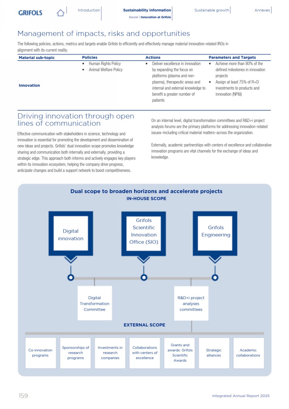 影响、风险和机会的管理以下政策、行动、指标和目标使Grifols能够根据当前的现实情况高效、有效地管理材料创新-重新定档的IRO。材料子主题政策行动参数和目标创新•人权政策•动物福利政策•通过扩大对平台(血浆和非血浆)、治疗领域以及内部和外部知识的关注来提供卓越的创新,以惠及更多的患者•在创新项目中实现80%以上的既定里程碑•将至少75%的研发投资分配给通过开放沟通渠道推动创新的产品和创新(NP & I),与科学领域的利益相关者进行有效沟通,科技创新对于推动新思想新项目的发展和传播至关重要。Grifols的双创新范围促进了内部和外部的知识共享和交流,提供了战略优势。这种方法既告知并积极吸引其创新生态系统内的关键参与者,帮助公司推动进步、预测变化并建立支持网络以提高竞争力。在内部层面,数字化转型委员会和R & D + i项目分析论坛是解决整个组织的创新相关问题——包括关键材料问题——的主要平台。在外部,与英才中心的学术伙伴关系和协作创新计划是交流思想和知识的重要渠道。导言可持续发展信息可持续增长附件社会|创新at Grifols 159 Integrated Annual Report 2025双范围拓宽视野加速项目in-HOUSE ScoPE Digital Innovation Grifols Scientific Innovation Office(SIO)Grifols Engineering Digital Transformation Committee R & D + i Project Analysis Committees External ScoPE Co-创新项目赞助研究项目投资研究公司与卓越中心的合作赠款和奖励:Grifols Scientific Awards Strategic Alliances学术合作