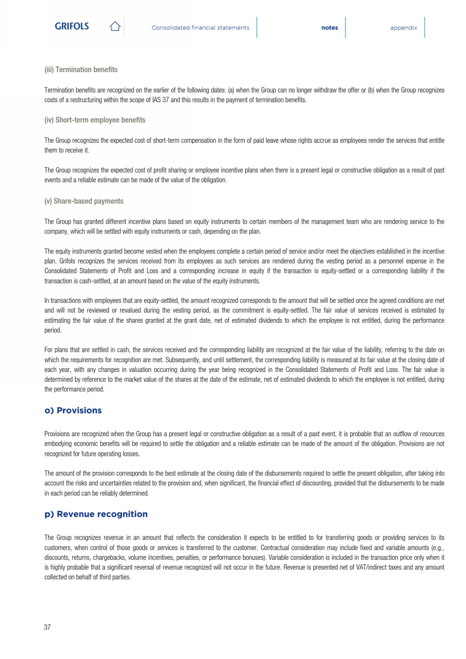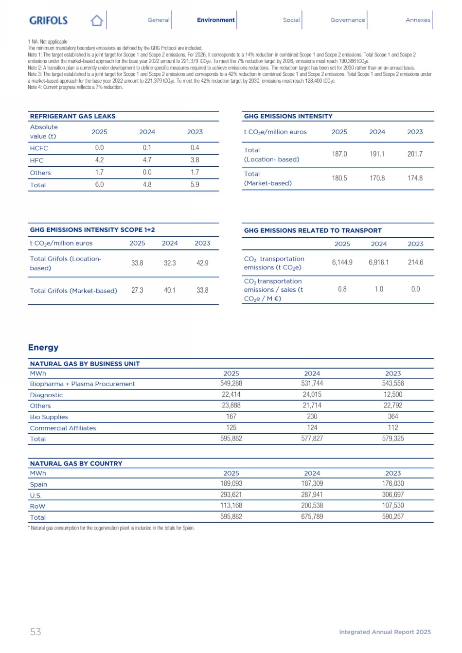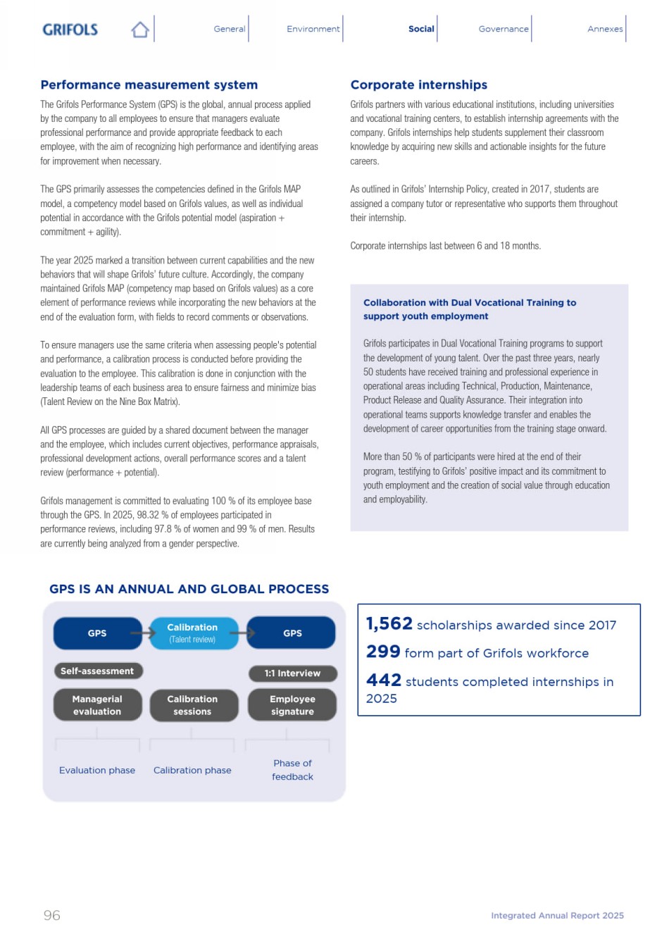 短期可变薪酬Grifols为管理团队成员和整个集团的合格员工维持一个短期可变薪酬计划。其宗旨是推动年度业绩,认可个人和集体对公司业绩的贡献,并加强与公司战略重点的一致性。截至2025财年末,首席执行官是董事会中唯一从与公司保持的商业关系中获得短期可变薪酬的成员。在这种情况下,假设董事会设定的目标100%实现,年度总目标奖金从年度固定薪酬的0%到最高60%不等。若超额完成指标,短期浮动薪酬按比例递增,最高不超过年度固定薪酬的90%。绩效水平根据公司制定的年度定量和定性目标的完成情况确定,符合可比公司的标准做法。这些目标与公司的长期战略、利益和可持续性保持一致。根据任命和薪酬委员会的提议,首席执行官的年度目标与董事会批准的财务和非财务指标和参数相关联。对于2025财年,这些目标的结构如下:•经济-财务指标(60%权重)与集团的整体业绩挂钩,并参考合并调整后EBITDA、合并自由现金流和净销售额等指标,所有这些指标均基于合并账户计算。这一指标反映了公司的整体运营和财务表现。• ESG指标(15%的权重)涉及非金融目标的实现,包括环境、社会和治理(ESG)目标,与上一年相比,其权重已提高至15%。在这一类别中,环境指标占25%,社会指标占40%,治理指标占35%。这些目标与Grifols的可持续发展战略、Grifols 2030年可持续发展议程和可持续发展目标(SDGs)保持一致。这些目标所依据的绩效指标(PDI)由可持续发展、传播和声誉委员会监测,并由独立第三方进行验证。•创新指标(10%权重)基于与战略创新管道相关的10个特定里程碑的实现,旨在加速项目和新机会。•其他运营和业务相关指标,最高15%的总加权。对于随后几年,执行董事的年度目标将与财务和非财务指标和参数挂钩,由董事会根据任命和薪酬委员会的提议批准。这些目标必然包括财务、运营和业务相关目标,以及创新相关目标,以便使执行董事薪酬与公司的财务业绩、业务发展和创新管道保持一致。此外,还将考虑非财务(ESG相关)指标,具体目标与Grifols的可持续发展战略和2030年议程保持一致。与ESG Grifols挂钩的可变薪酬将其高级管理人员和所有员工的部分可变薪酬与实现环境男性、社会和治理(ESG)目标挂钩,加强了可持续长期价值的创造,并与其可持续发展战略和2030 A genda保持一致。整个集团的可变薪酬受财务和非财务指标和目标的约束,并包括与ESG绩效挂钩的特定IC部分。目标分布如下:25%的环境、40%的社会和35%的公司治理。总体而言,适用于劳动力的企业总目标中有20%与这些因素相关。根据员工是仅根据公司RPO率目标还是也根据工厂特定目标进行评估,这个百分比可能代表可变薪酬总额的较低比例。就C EO而言,如董事薪酬政策所述,ESG相关目标占年度奖金的15%。这些目标由可持续发展、沟通和声誉委员会以及任命和薪酬委员会确定,并由董事会批准。相关的关键绩效指标(KPI)与公司的战略公关活动保持一致,包括能源效率、负责任的水资源管理、人才吸引和发展、平等、监管合规和商业ETHIC。绩效被监测和独立验证, 确保薪酬框架支持Grifols的可持续性和良好的gove rna nce承诺。大环境社会治理附件180综合年度报告2025
