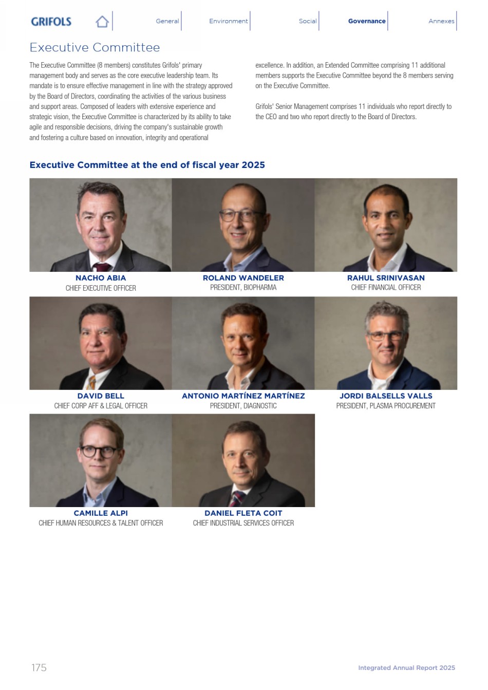 执行委员会执行委员会(8名成员)构成Grifols的主要管理机构,并担任核心执行领导团队。其任务是确保按照董事会批准的战略进行有效管理,协调各业务和支持领域的活动。执行委员会由具有丰富经验和战略远见的领导者组成,其特点是能够做出敏捷和负责任的决策,推动公司的可持续增长,并培养基于创新、诚信和卓越运营的文化。此外,一个由11名额外成员组成的扩大委员会支持执行委员会,而不是在执行委员会任职的8名成员。Grifols的高级管理层包括11名直接向CEO汇报的人员和两名直接向董事会汇报的人员。2025财年末执行委员会NACHO ABIA首席执行官Roland WANDELer总裁、生物制药RAHUL SRINIVASAN首席财务官DAVID BELL首席CORP AFF &法律官Antonio Mart í nez Mart í nez总裁、诊断JORDI BALSELLS Valls总裁、PLASMA采购CAMILLE ALPI首席人力资源和人才官Daniel Fleta COIT首席工业SE