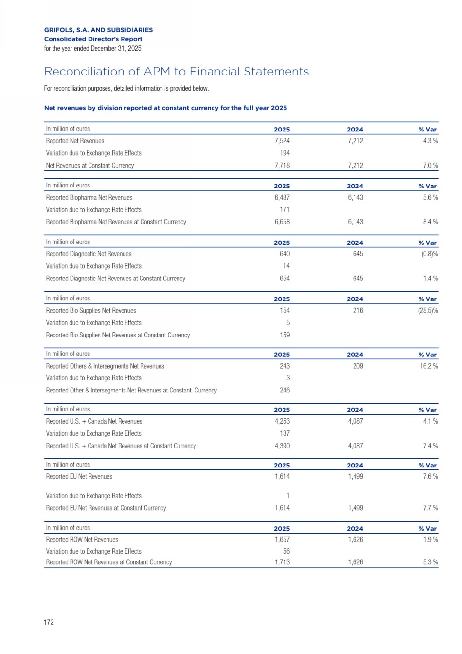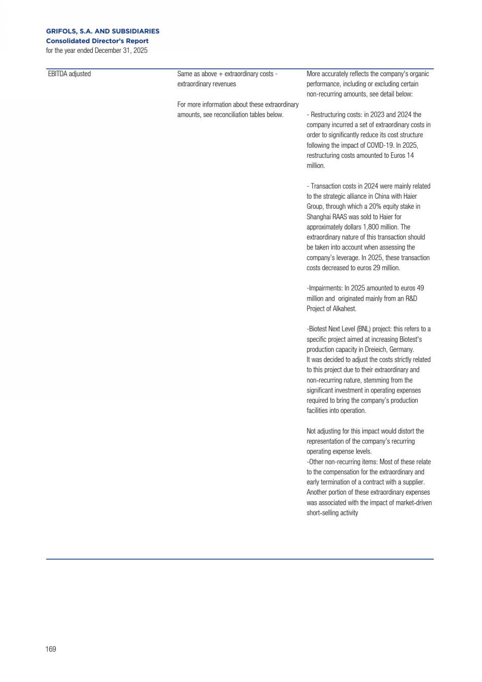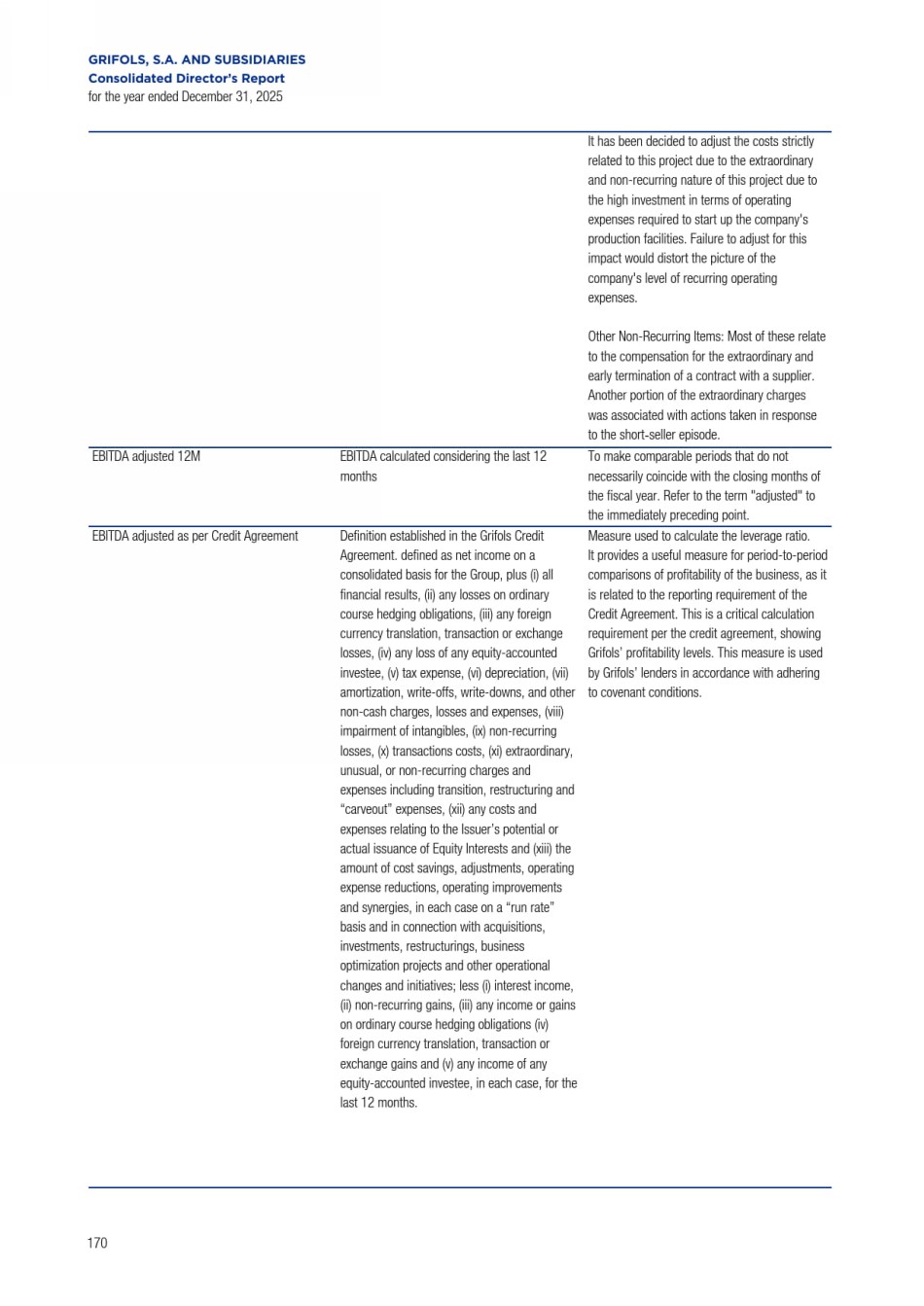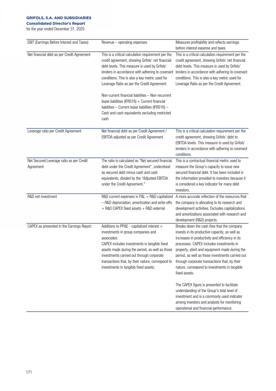 本文件包含以下替代绩效衡量标准(APMs):报告的合并EBITDA、调整后的合并EBITDA、根据信贷便利的杠杆率、根据信贷便利的净债务、自由现金流、营运资本和非经常性项目。有关APM的定义、使用解释和调节的更多详细信息,请参阅演示文稿的附录以及来自Grifols网站www.grifols.com/en/investors的“替代绩效措施”文件。
