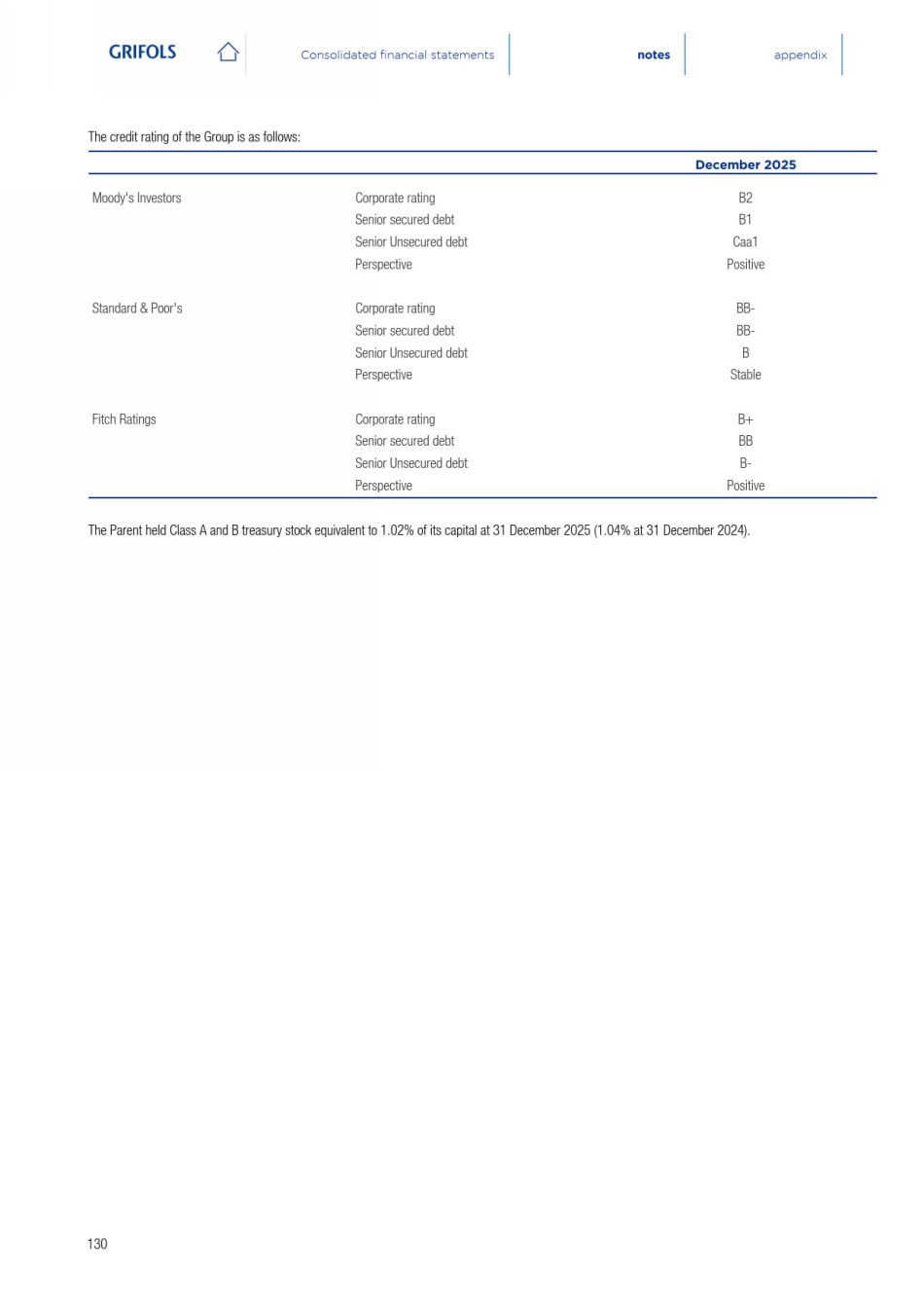 Grifols的财务和运营业绩因三家信用评级机构均取得强劲的重新评级进展而获得回报:标普将Grifols的信用评级上调至‘BB-’,前景展望为‘稳定’;惠誉将前景展望修正为‘正面’,并确认‘B +’评级;穆迪将Grifols的评级从‘B2’上调至‘B1’,前景展望为‘稳定’。这三家信用评级机构都承认Grifols强大的投资级业务特征。