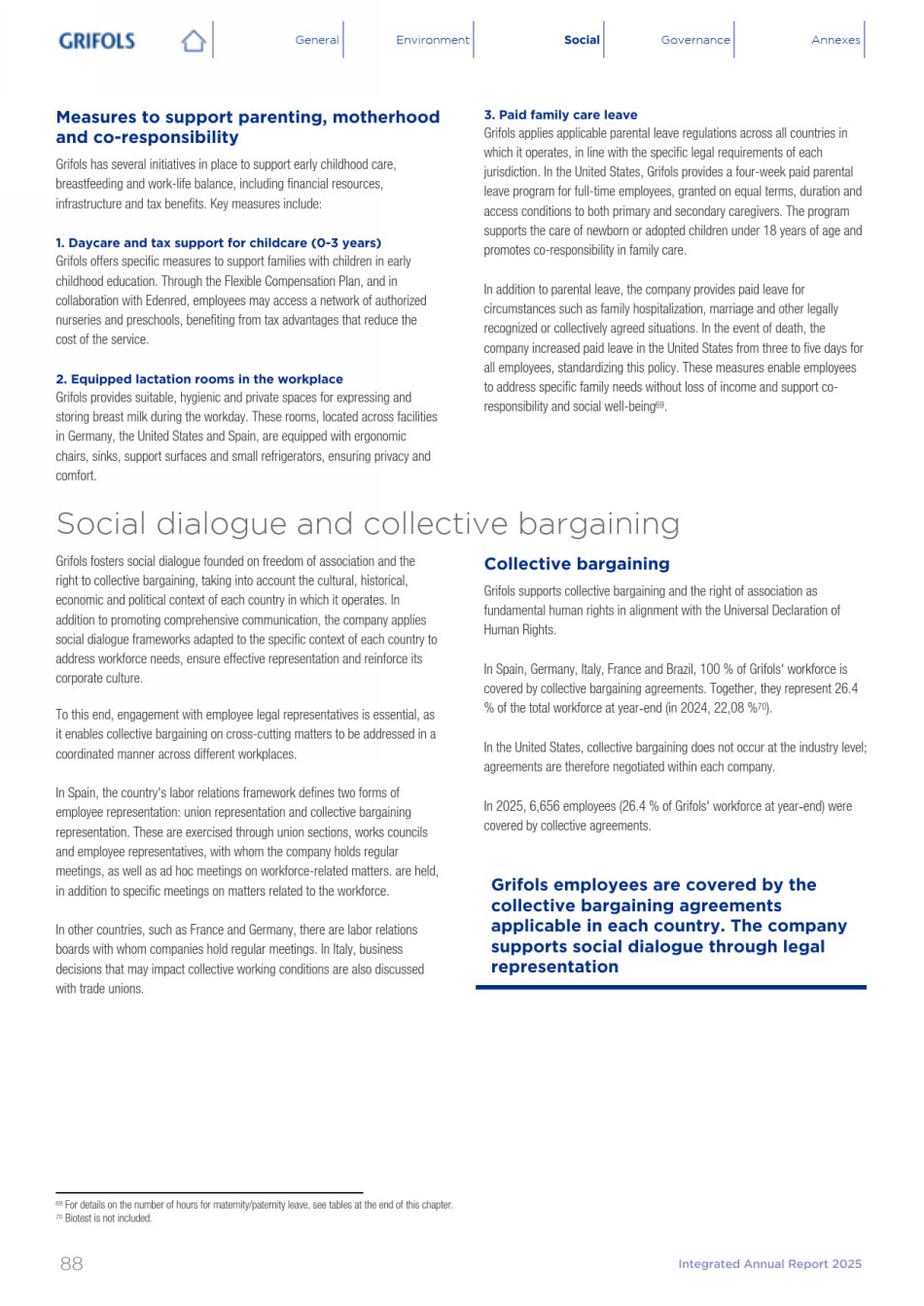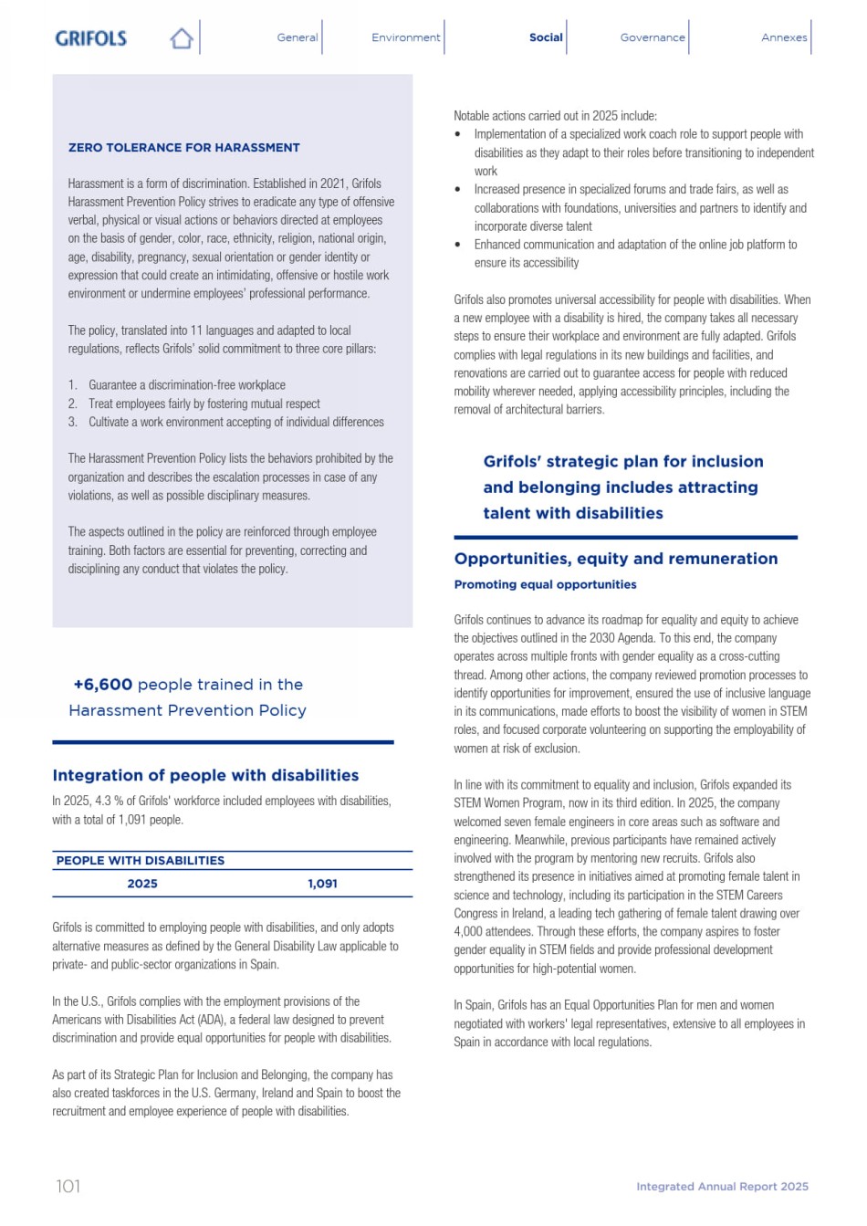 道德、诚信和人权构成Grifols企业文化的基础Grifols的企业文化立足于规范组织所有领域的道德原则,包括环境实践。这一承诺始于对人权的绝对尊重,这构成了其商业行为和企业责任的基石y142。Grifols努力确保一个包容和公平的环境,维护其员工、合作伙伴、捐助者、患者和运营社区的尊严和福祉,基于强有力的社会承诺。该公司通过调查和审计等工具以及Grifols道德线等机制评估有效性,以报告不当行为,目标是确保其价值观在整个组织中得到整合和共享。Grifols的企业文化建立在合规的基础上,制定了各种计划,以确保其所有活动符合法律法规、国际标准和行业最佳实践。该公司还通过明确的政策、持续的培训和严格的审计流程,促进诚信和透明的文化。Grifols的高管行为准则和Code of Ethics定义了组织的基本原则和准则,强化了商业道德和合规文化。行为准则•全体员工书面遵守。•为所有新员工提供特定培训。•在Grifols的公司网站和内部门户网站上向所有员工公开和可访问。•任何违规行为都被视为严重违法行为,可能会受到纪律处分,包括解雇。高级领导人道德守则•为Grifols的高管和理事机构建立行为规则。•每年由董事会成员、高级管理人员、经理和区域负责人签署。•不遵守Grifols的任何道德原则可能会导致纪律处分,包括解雇。通过健全的治理促进商业道德Grifols的董事会和委员会在确保符合道德的商业行为、与人权保持一致并遵守适用法律和最佳实践143方面发挥着关键作用。人权政策于2022年获得批准,由可持续发展委员会监督,强调了该公司在其所有运营、子公司和业务关系中尊重和促进人权的承诺。它适用于所有员工、管理人员和理事机构,并通过第三方第144条的Code of Ethics和行为准则延伸至供应商、承包商和业务合作伙伴。Grifols禁止童工、强迫劳动和人口贩运,促进平等、工作场所安全和结社自由。它还提供培训、报告和补救机制,保证符合《联合国工商业与人权指导原则》的道德和透明管理。反腐败合规计划由董事会通过审计委员会管理,包括预防腐败犯罪、确保遵守反腐败立法以及将道德标准纳入所有业务的举措。刑事风险管理系统由审计委员会e14管理5。人权146尊重人的尊严和权利是Grifols行动的基本要求。生物伦理学的基本原则指导公司在整个价值链中研究、开发、生产和营销其产品的方法,目标是维护参与该过程的所有个人的安全和尊严,并解决健康科学进步所产生的问题。各种条例、宣言和守则指导着这些原则的通过,包括《世界人权宣言》(1948年)、《赫尔辛基宣言》(1964年)和《联合国教科文组织生物伦理学和人权国际宣言》(2005年)。Grifols以首要国际组织为参考(联合国全球契约、联合国工商业与人权指导原则、经合组织多国企业指导方针和国际劳工组织多国企业宣言),制定了一项全球战略,以在其所有行动中促进和保障对人权的责任和承诺。大环境社会治理附件185综合年度报告2025142 Grifols的主要企业政策及其内部规范和条例可公开查阅。143有关Grifols董事会成员在应用行为规则方面的经验、知识和资历的更多详细信息。144有关人权的所有信息可在www.grifols.com上查阅。145有关审计委员会监督的更多细节,请查阅Grifols董事会条例。146查阅人权政策。