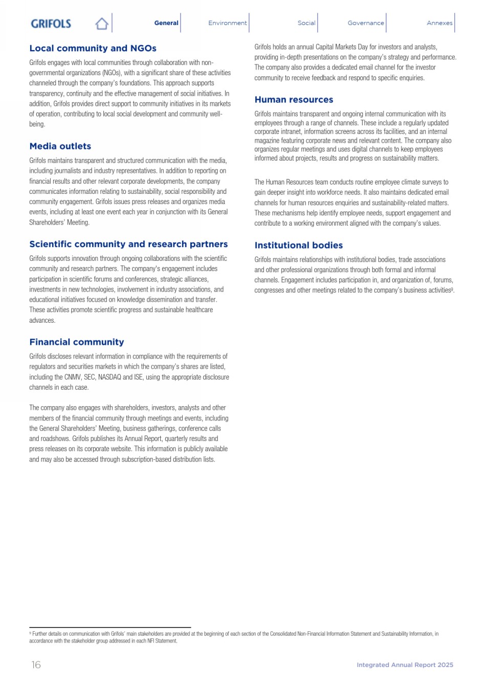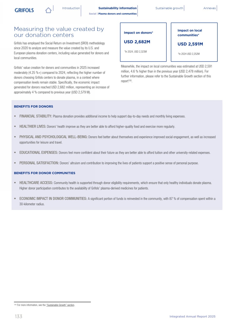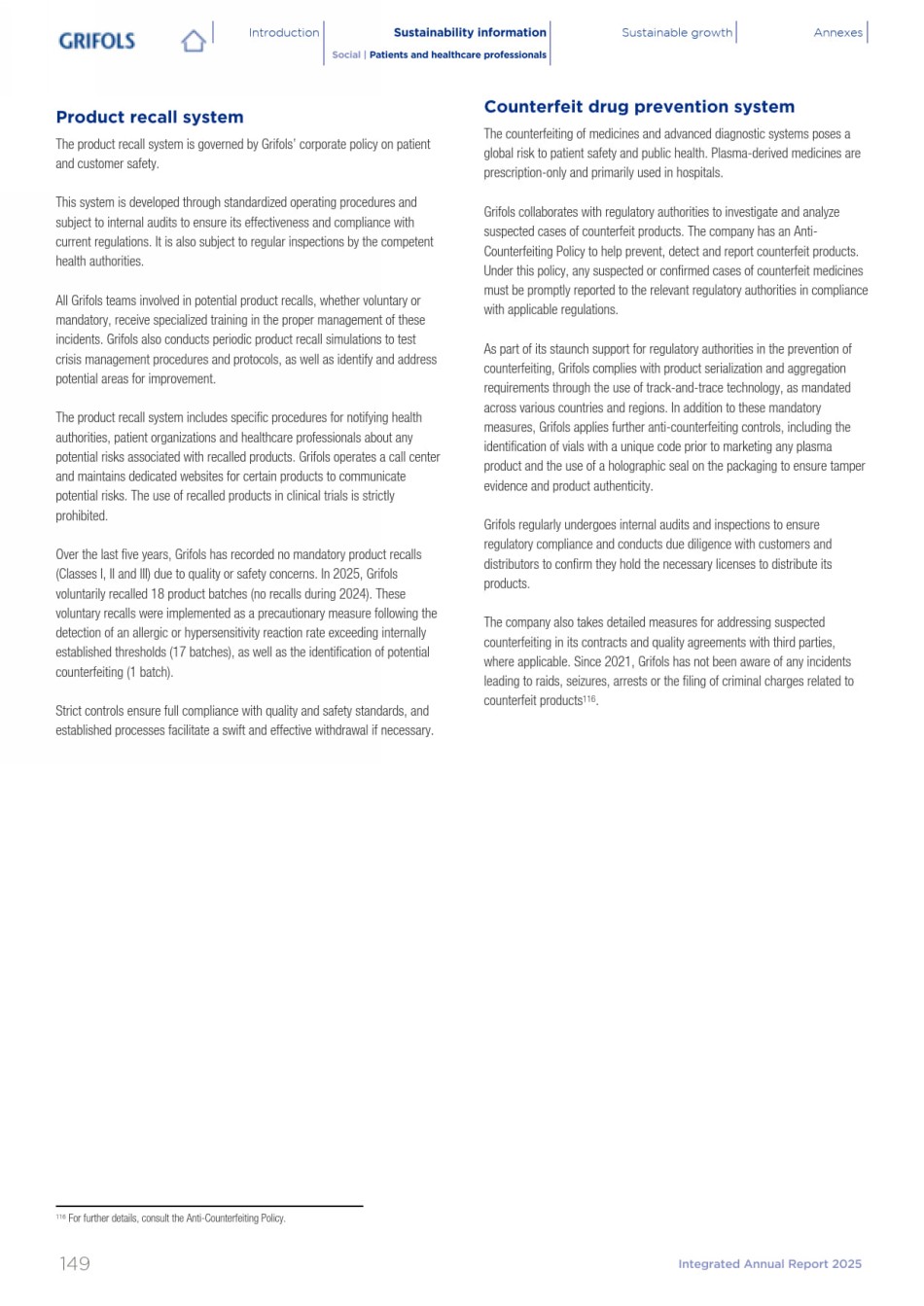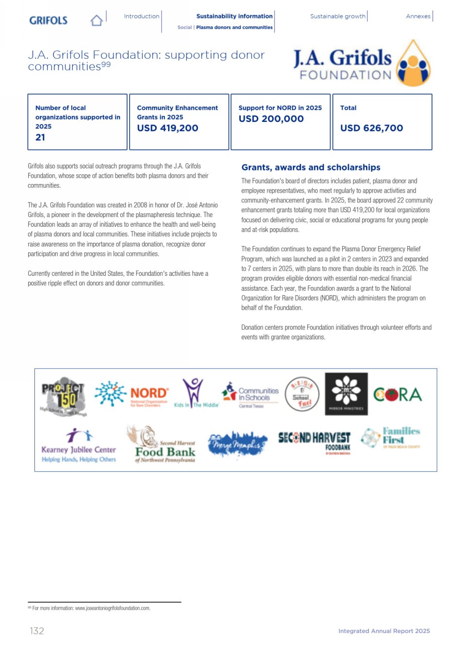 在2025年建立联系2025年,Grifols通过加强与全球患者协会的合作,加强了其对患者参与的承诺。这些伙伴关系的重点是促进对可通过血浆衍生疗法治疗的各种罕见疾病的认识、宣传和获得及时诊断和治疗的机会,同时重申血浆作为一种必要原材料的价值。在α-1抗胰蛋白酶缺乏症(AATD)领域,该公司重新支持Alpha-1欧洲联盟,并与西班牙AATD网络(REDAAT)合作制定AATD管理良好做法宣言,旨在改善疾病检测和患者护理。Grifols还支持Alfa-1 Norden的成立,并作为其面向患者组织的血浆教育计划的一部分,主办了该协会。这一举措引入了一个新的组成部分:关于交流和公开演讲的技能提升研讨会,辅之以关于市场准入和诊断等血浆相关主题的会议。在原发性免疫缺陷(PIDD)方面,该公司与BCN PID基金会和ACADIP一起推动教育和提高认识活动,包括在患者参与下参观Parets del Vall è s发展项目,并参加专门的国际论坛。值得注意的是,该公司支持IDF澳大利亚指导计划的持续改进和扩展,该计划将导师与寻求指导的个人配对。该项目提供情感支持、实用建议和分享经验,以帮助患者应对挑战并建立信心。迄今为止,它已经连接了10对导师–受训者,并培训了16名新导师,创建了一个不断发展的网络,每年在澳大利亚为更多患者提供支持。在CIDP和Guillain-Barr é综合征(GBS)领域,该公司与GBS | CIDP Foundation International以及德国和法国的协会合作开发教育材料、带头开展提高认识运动并放大患者的声音。在欧洲层面,Grifols在一份白皮书中支持EPODIN,以促进临床医生、专业协会、患者组织和政策制定者之间的合作。通过这项倡议,Grifols渴望就免疫异常炎症性神经病(DIN)患者护理原则达成共识,并确定解决国家和欧洲层面未满足需求的解决方案。同样,在免疫性血小板减少性紫癜(ITP)领域,Grifols就告知、支持和鼓励患者参与科学论坛的举措,加深了与包括FEDHEMO(西班牙)、O’Cyto(法国)和AAPIT(意大利)在内的各种组织的联系。该公司还与ITP支持协会合作,为诊断患有ITP的青少年和年轻人制作了一本信息丰富的书籍,帮助填补适龄资源方面的关键空白。通过这种方法,Grifols强调了其以使命为导向的促进患者参与的承诺。与医疗保健专业人员和组织的关系Grifols与医疗保健专业人员和组织的互动有助于丰富其在患者行为和疾病管理方面的知识和专业知识。这对于指导行业努力和提高患者护理和治疗方案的质量至关重要。所有互动都以最大的完整性和透明度进行,并受Grifols全球合规计划的监管。Grifols的礼品和款待政策以适当的标准指导员工,并为管理与医疗保健专业人员、公职人员和其他个人的价值转移和款待制定了限制。在美国,《阳光法案》(PPS)要求药品、生物制品和医疗器械的制造商和团购组织(GPO)逐项列出与向医疗保健专业人员和组织(包括医生、高级实践提供者和教学医院)支付和转移价值有关的所有信息。美国医疗保险和医疗补助服务中心(CMS)每年6月都会根据这些披露情况发布报告。在美国,Grifols遵守美国药物研究和制造商协会(PhRMA)和先进医疗技术协会(AdvaMed)的医疗保健提供者交互代码,并继续根据AdvaMed(2025年10月)和PhRMA(2022年1月)代码的更新制定其合规计划。这两项准则都立足于加强与医疗保健界互动的道德标准和原则。根据开放支付计划在美国进行的价值转移:2024年500万美元+ 14.9%与2023年相比Grifols建立了管理其透明度计划运作的政策和程序,以确保遵守美国州和联邦政府机构设定的报告义务。本着这些原则, Grifols可能会聘用顾问或顾问等医疗保健专业人员,前提是他们是根据其资格和专业知识被选中以满足特定需求的。经济补偿必须反映所提供服务的公平市场价值,所有安排必须通过书面合同正式确定。Grifols为所有需要与美国医疗保健组织和专业人员定期互动的员工提供透明度培训计划。共有57名美国员工参加了正式的透明度培训,而北美医疗健康合规团队全年向更广泛的员工群体提供信息和个人培训。这些努力确保参与这些互动的所有员工理解并遵守透明度规定和原则。导言可持续发展信息可持续增长附件社会|患者和医疗保健专业人员151综合年度报告2025