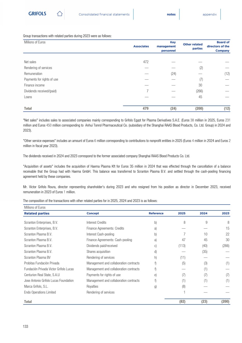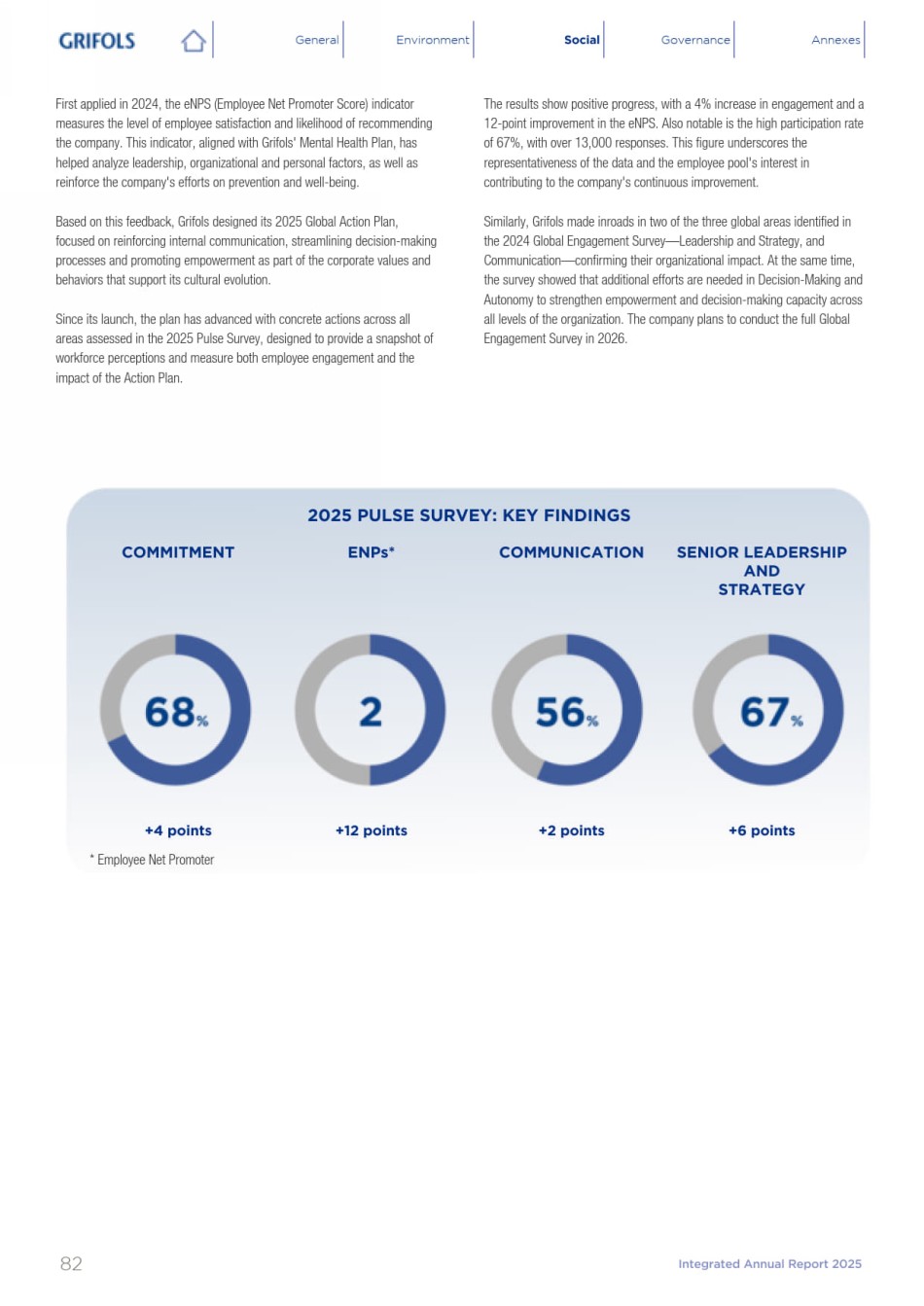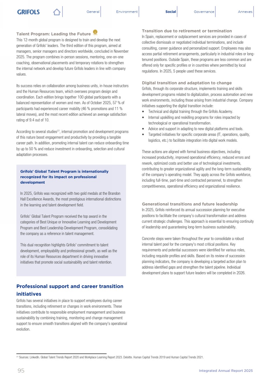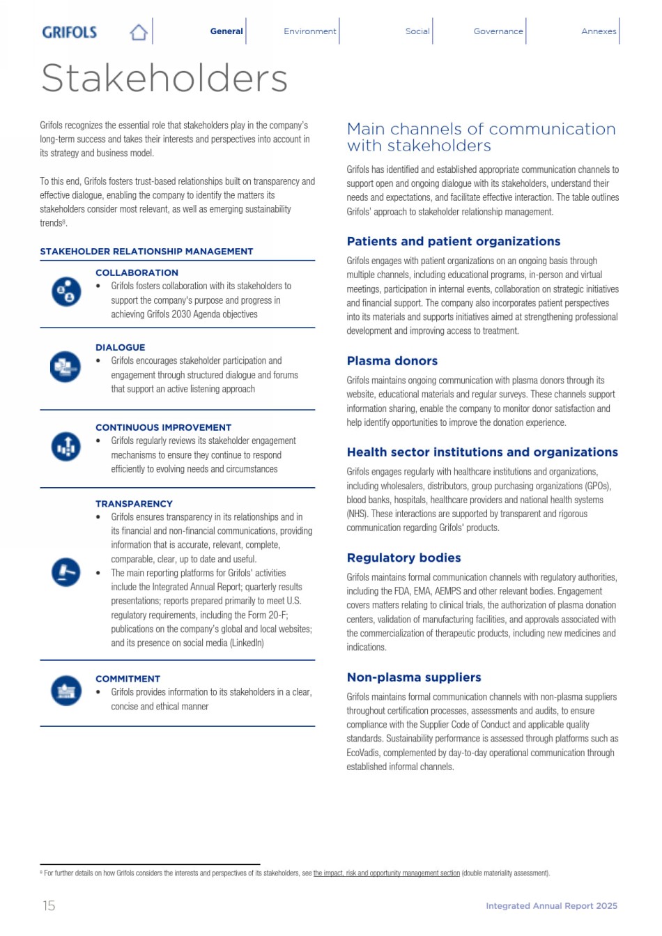 在2025年建立联系2025年,Grifols通过加强与全球患者协会的合作,加强了其对患者参与的承诺。这些伙伴关系的重点是促进对可通过血浆衍生疗法治疗的各种罕见疾病的认识、宣传和获得及时诊断和治疗的机会,同时重申血浆作为一种必要原材料的价值。在α-1抗胰蛋白酶缺乏症(AATD)领域,该公司重新支持Alpha-1欧洲联盟,并与西班牙AATD网络(REDAAT)合作制定AATD管理良好做法宣言,旨在改善疾病检测和患者护理。Grifols还支持Alfa-1 Norden的成立,并作为其面向患者组织的血浆教育计划的一部分,主办了该协会。这一举措引入了一个新的组成部分:关于交流和公开演讲的技能提升研讨会,辅之以关于市场准入和诊断等血浆相关主题的会议。在原发性免疫缺陷(PIDD)方面,该公司与BCN PID基金会和ACADIP一起推动教育和提高认识活动,包括在患者参与下参观Parets del Vall è s发展项目,并参加专门的国际论坛。值得注意的是,该公司支持IDF澳大利亚指导计划的持续改进和扩展,该计划将导师与寻求指导的个人配对。该项目提供情感支持、实用建议和分享经验,以帮助患者应对挑战并建立信心。迄今为止,它已经连接了10对导师–受训者,并培训了16名新导师,创建了一个不断发展的网络,每年在澳大利亚为更多患者提供支持。在CIDP和Guillain-Barr é综合征(GBS)领域,该公司与GBS | CIDP Foundation International以及德国和法国的协会合作开发教育材料、带头开展提高认识运动并放大患者的声音。在欧洲层面,Grifols在一份白皮书中支持EPODIN,以促进临床医生、专业协会、患者组织和政策制定者之间的合作。通过这项倡议,Grifols渴望就免疫异常炎症性神经病(DIN)患者护理原则达成共识,并确定解决国家和欧洲层面未满足需求的解决方案。同样,在免疫性血小板减少性紫癜(ITP)领域,Grifols就告知、支持和鼓励患者参与科学论坛的举措,加深了与包括FEDHEMO(西班牙)、O’Cyto(法国)和AAPIT(意大利)在内的各种组织的联系。该公司还与ITP支持协会合作,为诊断患有ITP的青少年和年轻人制作了一本信息丰富的书籍,帮助填补适龄资源方面的关键空白。通过这种方法,Grifols强调了其以使命为导向的促进患者参与的承诺。与医疗保健专业人员和组织的关系Grifols与医疗保健专业人员和组织的互动有助于丰富其在患者行为和疾病管理方面的知识和专业知识。这对于指导行业努力和提高患者护理和治疗方案的质量至关重要。所有互动都以最大的完整性和透明度进行,并受Grifols全球合规计划的监管。Grifols的礼品和款待政策以适当的标准指导员工,并为管理与医疗保健专业人员、公职人员和其他个人的价值转移和款待制定了限制。在美国,《阳光法案》(PPS)要求药品、生物制品和医疗器械的制造商和团购组织(GPO)逐项列出与向医疗保健专业人员和组织(包括医生、高级实践提供者和教学医院)支付和转移价值有关的所有信息。美国医疗保险和医疗补助服务中心(CMS)每年6月都会根据这些披露情况发布报告。在美国,Grifols遵守美国药物研究和制造商协会(PhRMA)和先进医疗技术协会(AdvaMed)的医疗保健提供者交互代码,并继续根据AdvaMed(2025年10月)和PhRMA(2022年1月)代码的更新制定其合规计划。这两项准则都立足于加强与医疗保健界互动的道德标准和原则。根据开放支付计划在美国进行的价值转移:2024年500万美元+ 14.9%与2023年相比Grifols建立了管理其透明度计划运作的政策和程序,以确保遵守美国州和联邦政府机构设定的报告义务。本着这些原则, Grifols可能会聘用顾问或顾问等医疗保健专业人员,前提是他们是根据其资格和专业知识被选中以满足特定需求的。经济补偿必须反映所提供服务的公平市场价值,所有安排必须通过书面合同正式确定。Grifols为所有需要与美国医疗保健组织和专业人员定期互动的员工提供透明度培训计划。共有57名美国员工参加了正式的透明度培训,而北美医疗健康合规团队全年向更广泛的员工群体提供信息和个人培训。这些努力确保参与这些互动的所有员工理解并遵守透明度规定和原则。导言可持续发展信息可持续增长附件社会|患者和医疗保健专业人员151综合年度报告2025