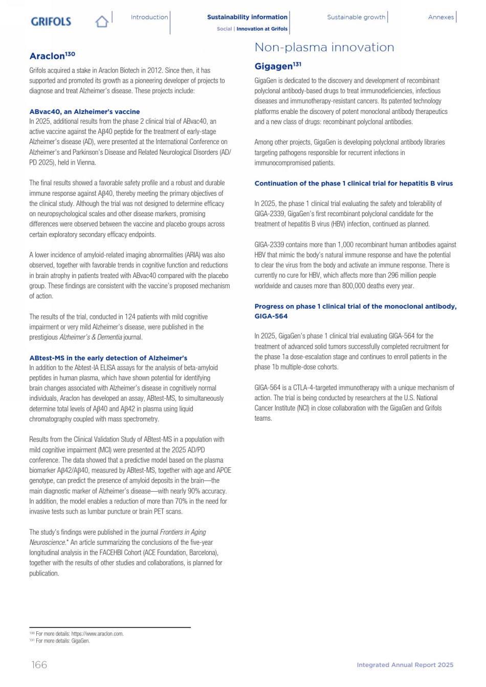 Araclo n 130 Grifols于2012年收购了Araclon Biotech的股份。从那时起,它作为诊断和治疗阿尔茨海默病项目的先驱开发商,支持并促进了其发展。这些项目包括:2025年阿尔茨海默病疫苗ABvac40,用于治疗早期阿尔茨海默病(AD)的针对A β 40肽的活性疫苗ABvac40的2期临床试验的额外结果,在维也纳举行的阿尔茨海默病和帕金森病及相关神经系统疾病国际会议(AD/PD2025)上展示。最终结果显示了良好的安全性和针对A β 40的强大而持久的免疫反应,从而达到了临床研究的主要目标。尽管该试验并非旨在确定对神经心理量表和其他疾病标志物的疗效,但在疫苗和安慰剂组之间观察到了某些探索性次要疗效终点的有希望的差异。与安慰剂组相比,还观察到淀粉样蛋白相关成像异常(ARIA)的发生率更低,同时ABVAC40治疗患者的认知功能和脑萎缩减少的有利趋势。这些发现与疫苗提出的作用机制是一致的。该试验在124名患有轻度认知障碍或非常轻微的阿尔茨海默病的患者中进行,结果发表在著名的《阿尔茨海默氏症与痴呆症》杂志上。ABTES-MS在阿尔茨海默氏症早期检测中除了用于分析人血浆中β-淀粉样肽的ABTES-IA ELISA测定已显示出在认知正常个体中识别与阿尔茨海默氏症相关的大脑变化的潜力外,Araclon还开发了一种测定方法ABTES-MS,使用液相色谱联用质谱同时测定血浆中A β 40和A β 42的总水平。ABTES-MS在轻度认知障碍(MCI)人群中的临床验证研究结果在2025年AD/PD会议上公布。数据显示,基于血浆生物标志物A β 42/A β 40的预测模型,通过ABTES-MS测量,连同年龄和APOE基因型,可以以近90%的准确率预测大脑中淀粉样蛋白沉积物的存在——阿尔茨海默病的主要诊断标志物。此外,该模型还能将腰椎穿刺或脑部PET扫描等侵入性测试的需求减少70%以上。这项研究结果发表在《衰老神经科学前沿》杂志上。*计划发表一篇文章,总结FACEHBI队列(ACE基金会,巴塞罗那)中五年纵向分析的结论,以及其他研究和合作的结果。非血浆创新Gigage n 131GigaGen致力于发现和开发基于重组多克隆抗体的药物,用于治疗免疫缺陷、传染病和免疫治疗耐药的癌症。其专利技术平台能够发现强效的单克隆抗体疗法和一类新药:重组多克隆抗体。在其他项目中,GigaGen正在开发针对导致免疫功能低下患者反复感染的病原体的多克隆抗体库。继续开展乙肝病毒1期临床试验2025年,GigaGen首个用于治疗乙肝病毒(HBV)感染的重组多克隆候选药物GIGA-2339的安全性和耐受性评估1期临床试验按计划继续进行。GIGA-2339包含1000多种针对HBV的重组人抗体,这些抗体模拟人体的自然免疫反应,具有清除体内病毒并激活免疫反应的潜力。HBV目前尚无治愈方法,全球范围内有超过2.96亿人受到影响,每年导致超过80万人死亡。单抗GIGA-564的1期临床试验进展2025年,GigaGen评估GIGA-564治疗晚期实体瘤的1期临床试验成功完成1a期剂量递增阶段的招募,并继续在1b期多剂量队列中招募患者。GIGA-564是一种CTLA-4靶向免疫疗法,具有独特的作用机制。该试验由美国国家癌症研究所(NCI)的研究人员与GigaGen和Grifols团队密切合作进行。简介可持续发展信息可持续增长附件Social | Innovation at Grifols 166 Integrated Annual Report 2025130更多详情:https://www.araclon.com。131更多详情:GigaGen。