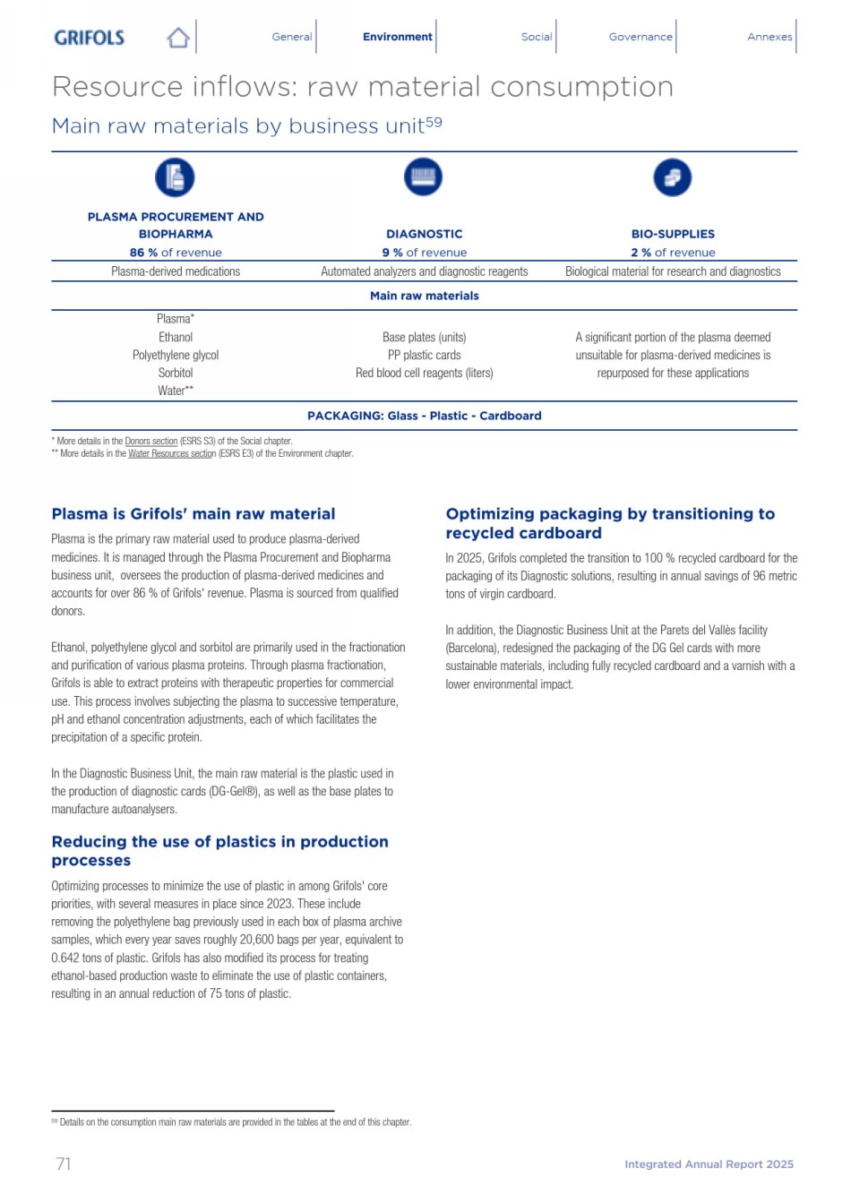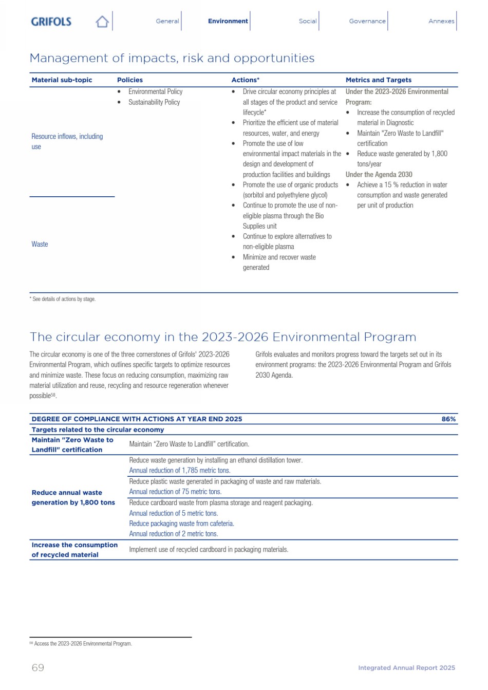 指标和目标DR E4-4与生物多样性和生态系统相关的目标不重要DR E4-5与生物多样性和生态系统变化相关的影响指标不重要DR E4-6生物多样性和生态系统相关风险和机会的预期财务影响不重要ESRS E5与ESRS 2 IRO相关的资源使用和循环经济影响、风险和机会管理DR-1识别和评估物质资源使用和循环经济相关影响、风险和机会的过程描述17-21,205-209 DR E5-1与资源使用和循环经济有关的政策68-69 DR E5-2与资源使用和循环经济有关的行动和资源32,71-75指标和目标DR E5-3与资源使用和循环经济有关的目标74 DR E5-4资源流入73,76 DR E5-5资源流出74 DR E5-6资源使用和循环经济相关影响、风险和机遇的预期财务影响Grifols正在努力扩大这一信息。主题-特定社会标准ESRS S1与ESRS 2相关的自有劳动力战略DR SBM-2利益相关者的兴趣和观点15-16,81-82与ESRS 2相关的DR SBM-3重大影响、风险和机会及其与战略和商业模式的相互作用78-79影响、风险和机会管理DR S1-1与自有劳动力相关的政策79,186 DR S1-2与自己的员工和工人代表就影响进行接触的过程88-89 DR S1-3纠正负面影响的过程和自己的员工提出关切的渠道81-82、100-102、183、191-192 DR S1-4就对自己的员工的实质性影响采取行动,以及管理与自己的员工相关的实质性风险和寻求实质性机会的方法,以及这些行动的有效性78-79披露要求内容页号一般环境社会治理附件220综合年度报告2025