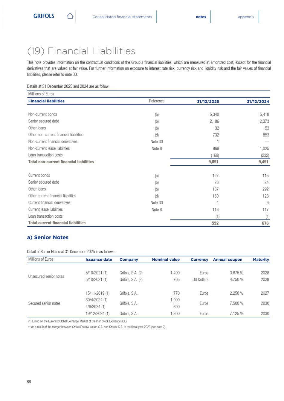 Grifols维持对2025年加强资产负债表的强烈关注。杠杆率从2024年的4.6倍下降到2025年的4.2倍,这得益于改善的EBITDA和强劲的自由现金流产生。该公司目前预计将分两步为其2027年到期的债券再融资——从2026年上半年的RCF + TLB再融资开始;随后是26年第四季度或更早的2027年债券再融资。