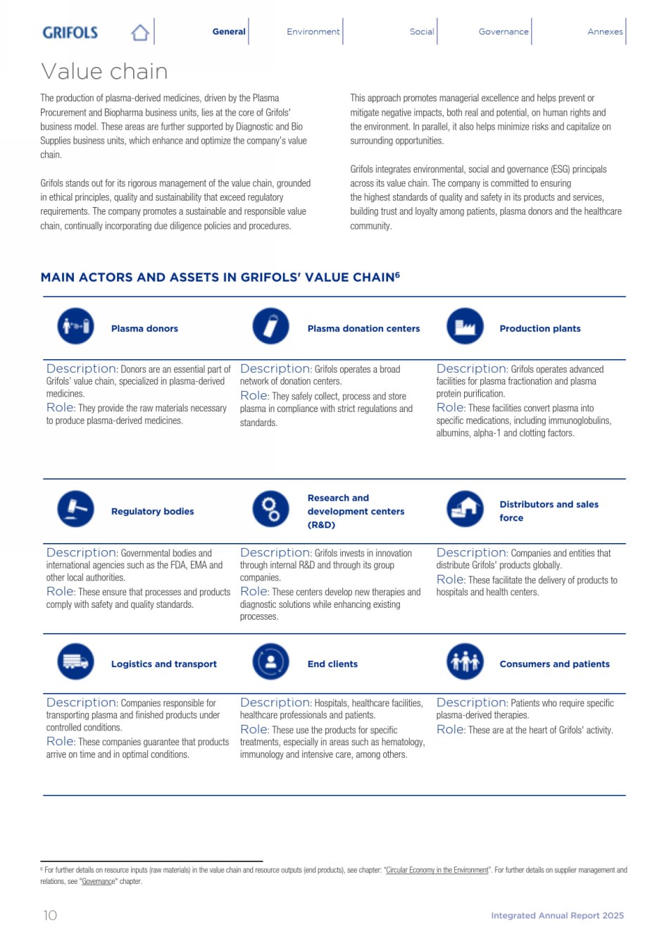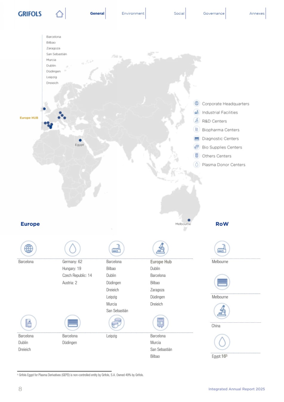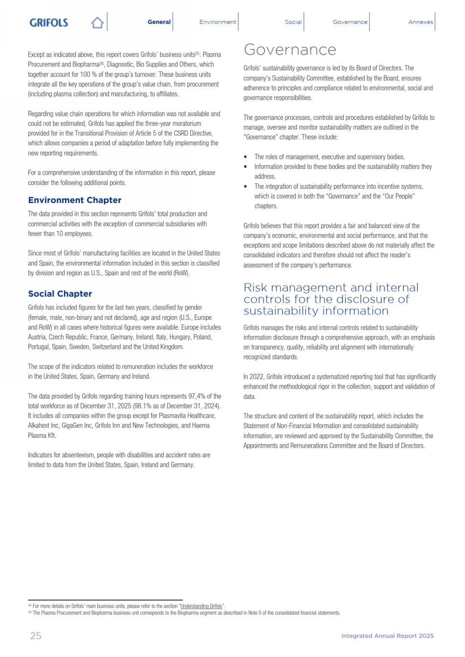 业务连续性和组织弹性在日益动荡的环境中,有弹性和可靠的运营对于Grifols实现其tra tegic目标的能力至关重要。中断可能来自外部因素——包括极端天气事件、监管变化、地缘政治发展和恶意攻击——或来自内部事件,如严重事故、供应商或第三方故障或系统中断。血浆采集和制造代表了该公司最关键的运营依赖。捐助者动态、监管要求或运营限制导致的中断可能会降低产能,影响SE rvi ce水平并产生财务影响。Grifols通过垂直整合的血浆采集模式加强运营弹性,并得到遍布美国、欧洲和加拿大的广泛的血浆采集中心网络的支持,以及旨在维持长期产能的扩张和效率举措。多个监管机构授权的设施进一步加强了制造业的弹性,在可行的情况下为可互换的流程提供了部署。这些措施辅之以灾难恢复和业务连续性计划,以及针对极端天气事件和严重事故的保险范围。对产能、基础设施和工艺改进的持续投资进一步加强了Grifols维持可靠运营和响应EV OLV ING需求的能力。2025年,Grifols在创建业务连续性和危机管理框架方面取得进展,以支持一致、合规和跨职能的准备和响应方法。生物制药产品血浆衍生产品的价格和需求受到几个主要市场的价格管制。这些控制措施,加上直接和间接的价格压力,已经影响——并可能继续影响——公司维持或提高毛利率的能力。政府和第三方付款人也可能限制可报销金额或资格标准,从而影响需求和市场准入。在美国,与定价相关的担忧导致了更严格的审查和持续的政府eFFOTS,以提高医疗保健和药品成本的透明度,包括拟议的联邦和州立法定价、报销和折扣。尽管血浆衍生疗法已被排除在最近的某些措施之外,但额外价格限制的风险仍然存在。尽管存在这些挑战,该公司在关键市场实现了稳健的收入增长,同时产品组合优化、每升成本降低和经营杠杆改善推动了利润率扩张。随着时间的推移,针对关键创新里程碑的进展和研发管道的加速预计将有助于缓解潜在的影响o f定价压力。人才吸引和保留n6 Grifols未来的成功取决于其留住高级管理层关键成员的能力,以及吸引、保留和激励合格员工队伍的能力。该公司高度依赖其执行团队和科学团队的核心成员。该公司的业绩依赖于运营、财务和会计、科学和技术、临床功能离子以及销售和营销方面的专业知识。这些领域对合格专业人员的竞争可能会影响公司有效执行战略的能力。Grifols实施了全面的奖励模式,以增强围绕四个核心支柱构建的员工体验:薪酬和福利、专业发展、认可和积极的工作环境。该公司还定期开展员工气候调查,以收集反馈并根据结果实施行动计划,支持continuou在员工敬业度和保留率方面的改善。1有关更多信息,请参见th e网络安全和数据保护n部分。2有关更多信息,请参见th e Innovatio n部分。3有关更多信息,请参阅患者和医疗保健专业人员部分。4有关更多信息,请参见Business Conduc t部分。5有关更多信息,请参见气候变化-适应n部分。6更多信息见我们的Peopl e部分。风险评估和缓解活动一般环境社会治理附件207综合年度报告2025