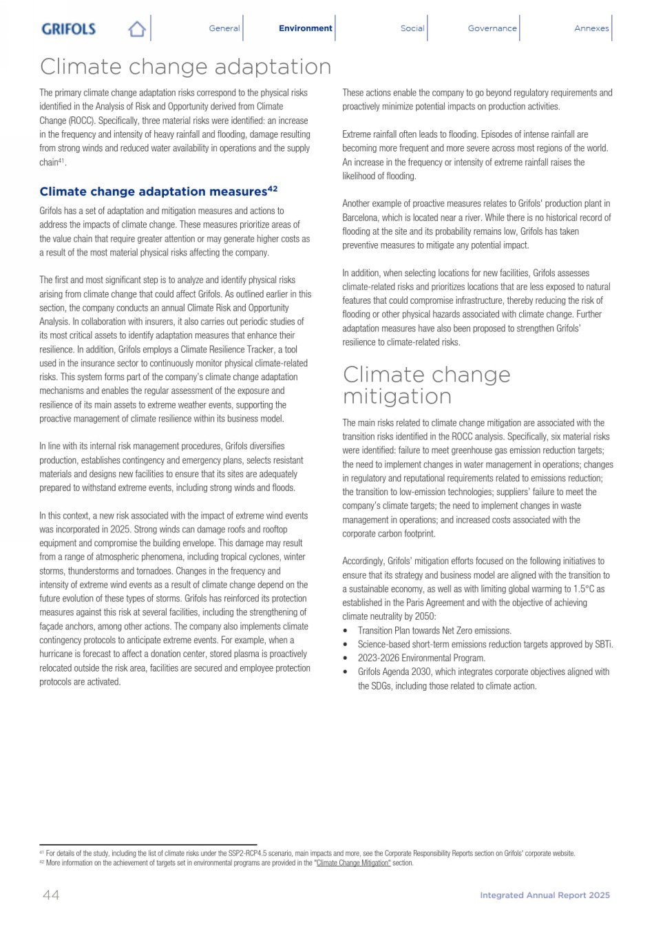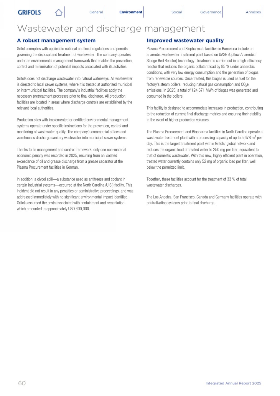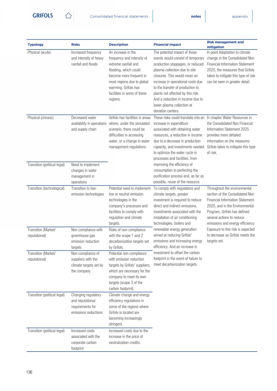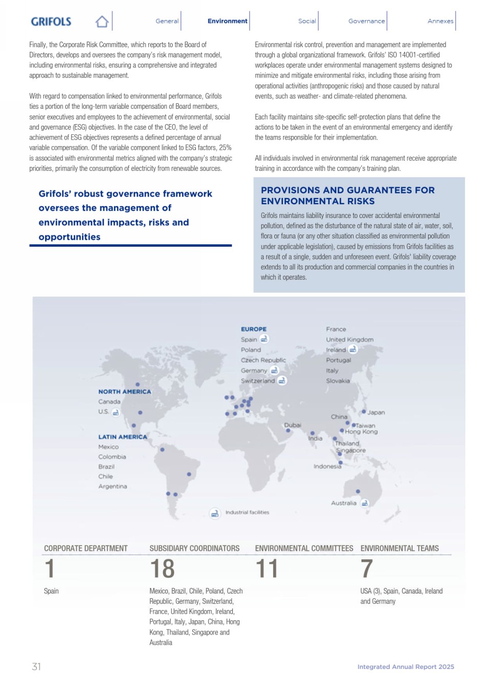 业务连续性和组织弹性在日益动荡的环境中,有弹性和可靠的运营对于Grifols实现其tra tegic目标的能力至关重要。中断可能来自外部因素——包括极端天气事件、监管变化、地缘政治发展和恶意攻击——或来自内部事件,如严重事故、供应商或第三方故障或系统中断。血浆采集和制造代表了该公司最关键的运营依赖。捐助者动态、监管要求或运营限制导致的中断可能会降低产能,影响SE rvi ce水平并产生财务影响。Grifols通过垂直整合的血浆采集模式加强运营弹性,并得到遍布美国、欧洲和加拿大的广泛的血浆采集中心网络的支持,以及旨在维持长期产能的扩张和效率举措。多个监管机构授权的设施进一步加强了制造业的弹性,在可行的情况下为可互换的流程提供了部署。这些措施辅之以灾难恢复和业务连续性计划,以及针对极端天气事件和严重事故的保险范围。对产能、基础设施和工艺改进的持续投资进一步加强了Grifols维持可靠运营和响应EV OLV ING需求的能力。2025年,Grifols在创建业务连续性和危机管理框架方面取得进展,以支持一致、合规和跨职能的准备和响应方法。生物制药产品血浆衍生产品的价格和需求受到几个主要市场的价格管制。这些控制措施,加上直接和间接的价格压力,已经影响——并可能继续影响——公司维持或提高毛利率的能力。政府和第三方付款人也可能限制可报销金额或资格标准,从而影响需求和市场准入。在美国,与定价相关的担忧导致了更严格的审查和持续的政府eFFOTS,以提高医疗保健和药品成本的透明度,包括拟议的联邦和州立法定价、报销和折扣。尽管血浆衍生疗法已被排除在最近的某些措施之外,但额外价格限制的风险仍然存在。尽管存在这些挑战,该公司在关键市场实现了稳健的收入增长,同时产品组合优化、每升成本降低和经营杠杆改善推动了利润率扩张。随着时间的推移,针对关键创新里程碑的进展和研发管道的加速预计将有助于缓解潜在的影响o f定价压力。人才吸引和保留n6 Grifols未来的成功取决于其留住高级管理层关键成员的能力,以及吸引、保留和激励合格员工队伍的能力。该公司高度依赖其执行团队和科学团队的核心成员。该公司的业绩依赖于运营、财务和会计、科学和技术、临床功能离子以及销售和营销方面的专业知识。这些领域对合格专业人员的竞争可能会影响公司有效执行战略的能力。Grifols实施了全面的奖励模式,以增强围绕四个核心支柱构建的员工体验:薪酬和福利、专业发展、认可和积极的工作环境。该公司还定期开展员工气候调查,以收集反馈并根据结果实施行动计划,支持continuou在员工敬业度和保留率方面的改善。1有关更多信息,请参见th e网络安全和数据保护n部分。2有关更多信息,请参见th e Innovatio n部分。3有关更多信息,请参阅患者和医疗保健专业人员部分。4有关更多信息,请参见Business Conduc t部分。5有关更多信息,请参见气候变化-适应n部分。6更多信息见我们的Peopl e部分。风险评估和缓解活动一般环境社会治理附件207综合年度报告2025