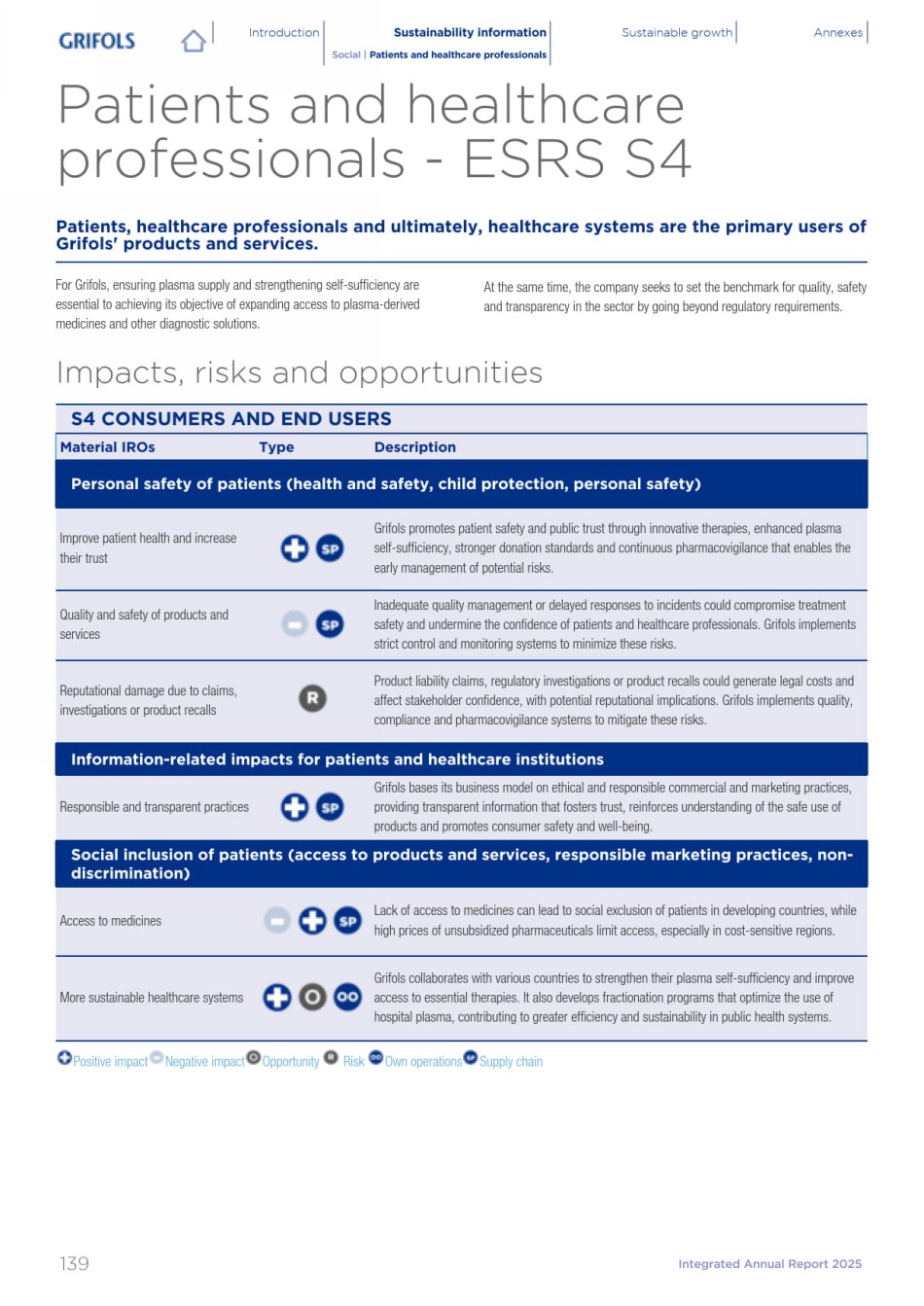 Grifols的创新Grifols报告了基于双重重要性原则的创新,同时考虑了商业和可持续性影响。Grifols的创新侧重于四个关键优先事项:加速开发新疗法、产品和服务,并推动现有疗法的改进和新适应症;支持竞争力;优化内部生产力以实现更高的效率;以及培养科学协作、教育和研究技能以推进知识。在此背景下,Grifols提供了有关其创新努力的详细信息,以支持对该公司的全面了解。影响、风险和机遇材料IRO类型描述创新临床试验Grifols坚信,生命科学的进步必须植根于人文和伦理方法。公司致力于保护参与其牵头或赞助的临床试验的患者的权利、安全和福祉。该公司还倡导在试验中以负责任和合乎道德的方式使用实验动物,这对开发拯救生命的疗法至关重要。促进知识和研究造福社会Grifols促进研究和科学进步,以帮助推动社会进步。该公司提供差异化创新组合,主要专注于开发治疗和诊断解决方案。这些努力通过使用人工智能(AI)得到进一步加强,将可持续性标准融入其产品创新,以促进社会进步和环境保护。此外,它促进传播严谨的信息和产生关于血浆的科学证据,加强对捐赠的信任,为捐赠者的福祉和安全做出贡献。技术和人工智能促进效率、生产力和发展Grifols致力于纳入促进新药开发和优化物流的创新技术,产生效率,转化为成本降低和收入增加。这种方法与基于人工智能的解决方案的实施相辅相成,这些解决方案提高了生产力和运营效率,加强了业务的竞争力和可持续性。颠覆性创新和竞争优势丧失医药领域的颠覆性创新,如果不及时适应新的科学技术进步,就会侵蚀企业的竞争优势。为了减轻这种风险,企业必须监测新出现的趋势,并对能力和技术进行持续投资。正面影响负面影响机会风险自有运营供应链介绍可持续信息可持续增长附件社会|创新at Grifols 158综合年度报告2025