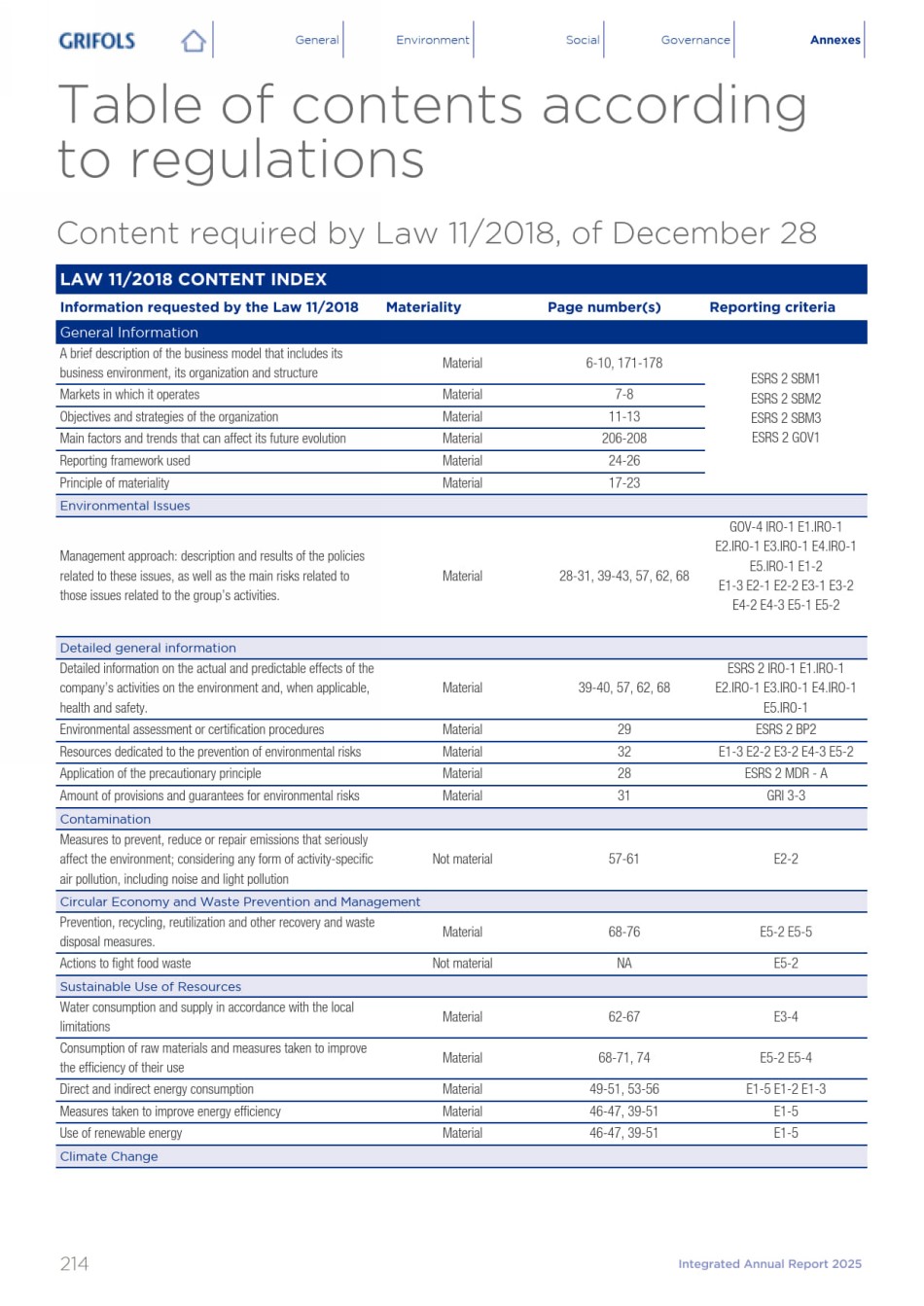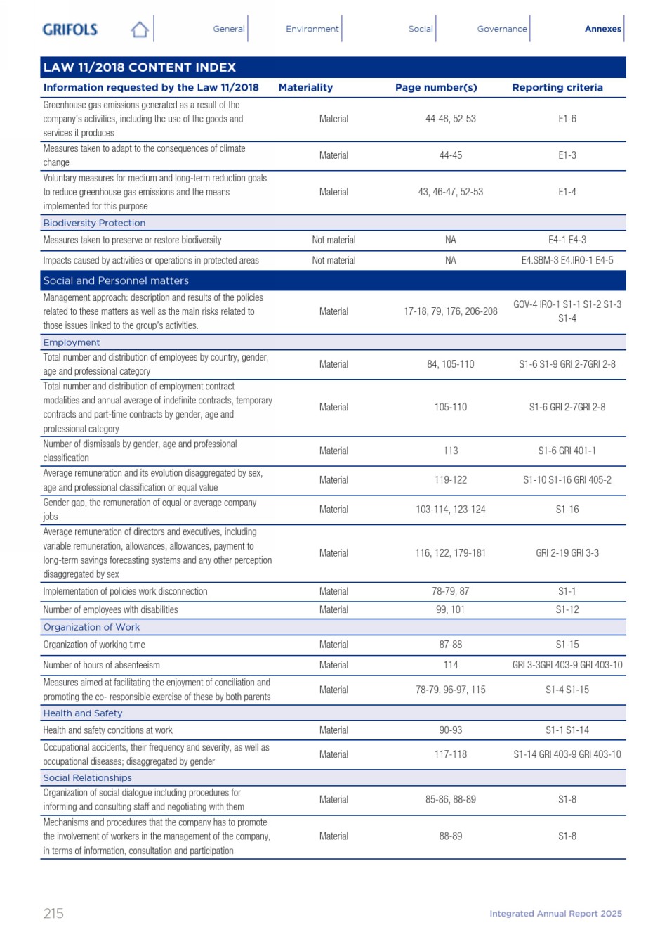与当地社区行动者保持的关系以及与这些材料的对话方式15-16、126、159 S3-2伙伴关系或赞助行动材料15-16、132、134、137-138 GRI 3-3 GRI 201-1分包和供应商纳入社会的采购政策,性别平等和环境问题材料194-196 G1-1在与供应商和分包商的社会和环境责任关系中的考虑材料194-196 G1-2监督和审计制度及其结果材料144-147,195 GRI 414-2GRI 308-2消费者健康和安全措施消费者材料144-149 S4-4投诉制度,收到的投诉及其解决材料149 S4-3税务信息逐国获得的利润材料211-212 GRI 207-4支付的福利所得的税款(每个国家)材料211-212 GRI 207-4收到的公共赠款(每个国家)材料211-212 GRI 201-4欧盟分类学材料33-38 KPI根据本报告法11/2018中描述的方法制定的内容索引信息11/2018法律要求的重要性页码(s)报告标准一般环境社会治理附件217综合年度报告2025