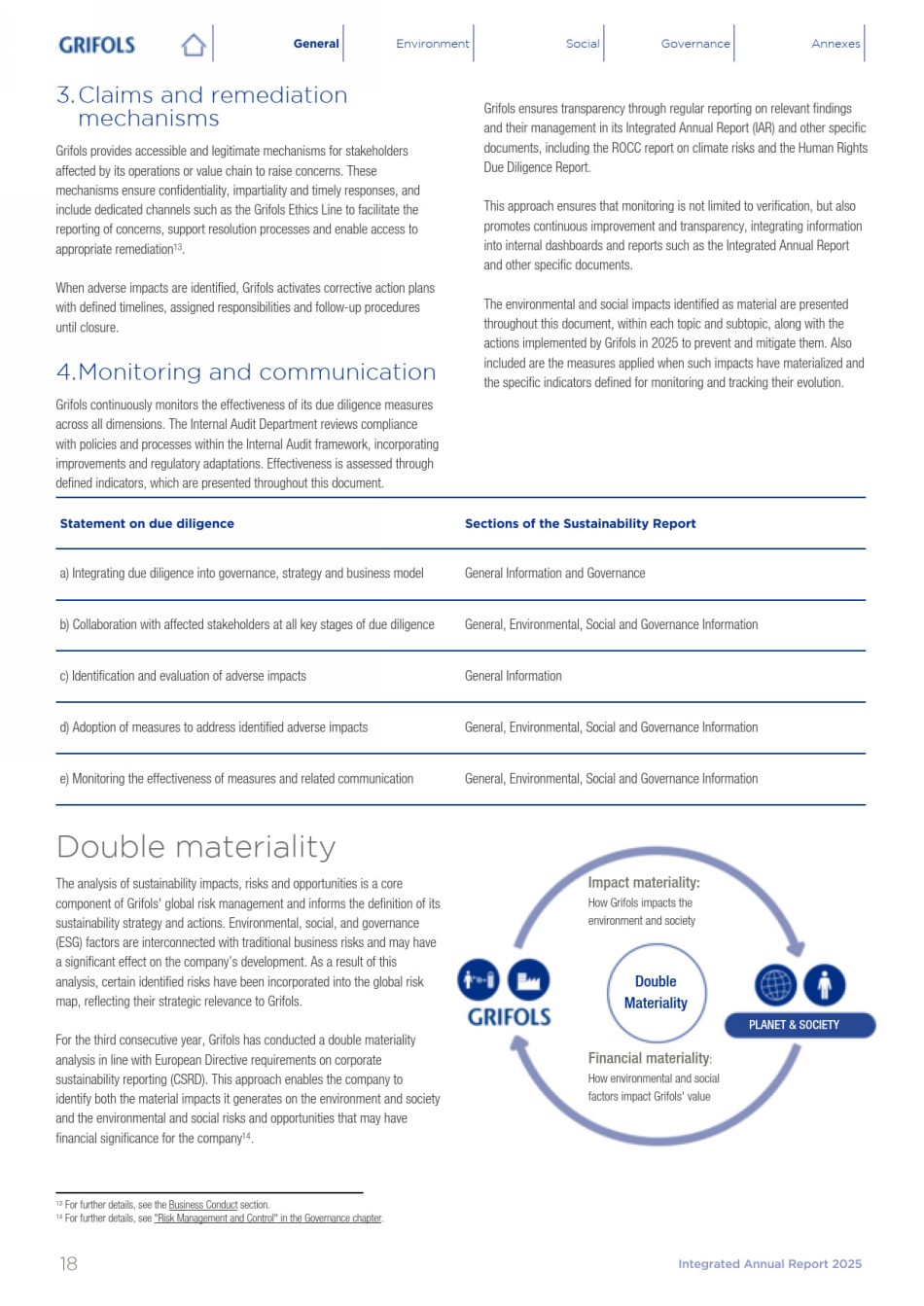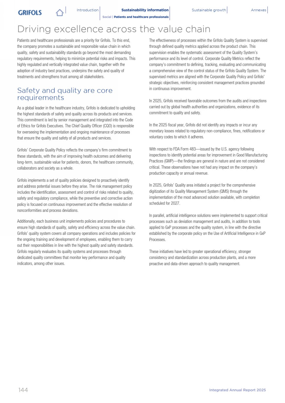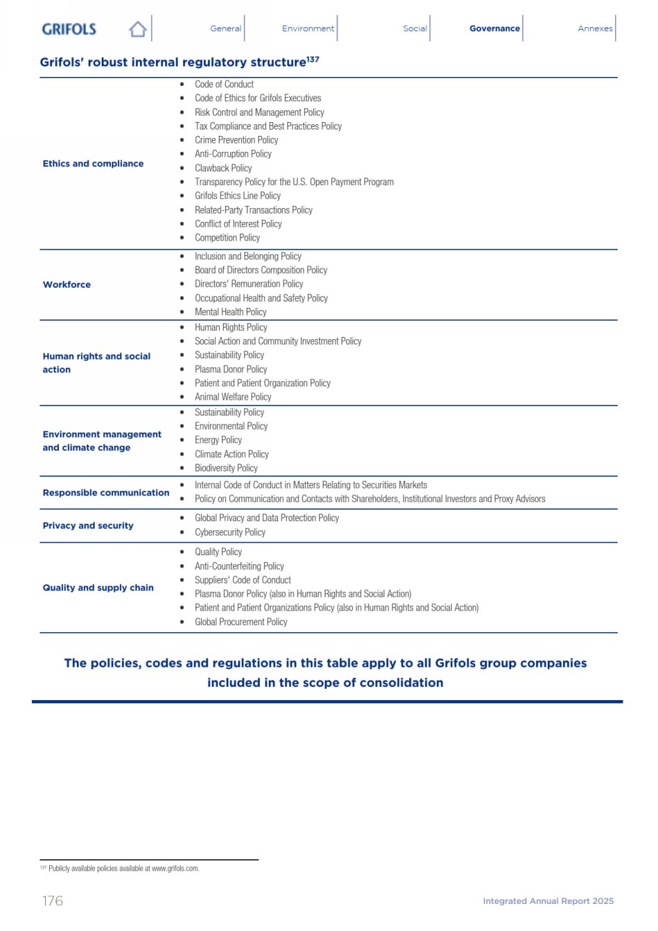 政策,本表中的代码和法规适用于纳入合并范围的所有Grifols集团公司Grifols稳健的内部监管结构e 137道德与合规•行为准则• Grifols高管的Code of Ethics •风险控制和管理政策•税收合规和最佳做法政策•预防犯罪政策•反腐败政策•追回政策•美国开放支付计划的透明度政策• Grifols道德额度政策•关联方交易政策•利益冲突政策•竞争政策员工队伍•包容和归属政策•董事会组成政策•董事薪酬政策•职业健康和安全政策•心理健康政策人权和社会行动•人权政策•社会行动和社区投资政策•可持续发展政策•血浆捐献者政策•患者和患者组织政策•动物福利政策环境管理和气候变化•可持续发展政策•环境政策•能源政策•气候行动政策•生物多样性政策负责任的沟通•与证券市场有关事项的内部行为准则•与股东沟通和联系的政策,机构投资者和代理顾问隐私和安全•全球隐私和数据保护政策•网络安全政策质量和供应链•质量政策•反假冒政策•供应商行为准则•血浆捐赠者政策(也在人权和社会行动中)•患者和患者组织政策(也在人权和社会行动中)•全球采购政策一般环境社会治理附件176综合年度报告2025137可在www.grifols.com上查阅的公开政策。