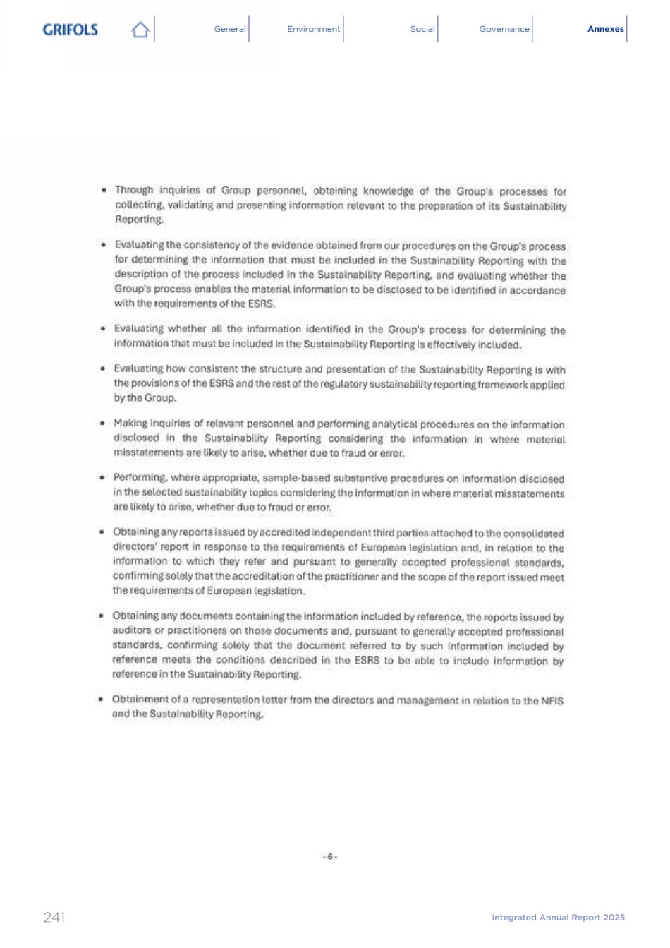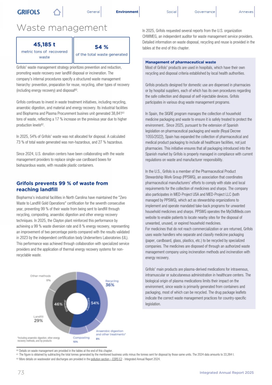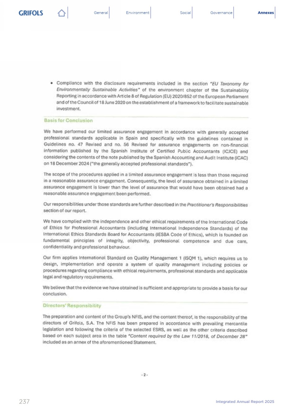 政策,本表中的代码和法规适用于纳入合并范围的所有Grifols集团公司Grifols稳健的内部监管结构e 137道德与合规•行为准则• Grifols高管的Code of Ethics •风险控制和管理政策•税收合规和最佳做法政策•预防犯罪政策•反腐败政策•追回政策•美国开放支付计划的透明度政策• Grifols道德额度政策•关联方交易政策•利益冲突政策•竞争政策员工队伍•包容和归属政策•董事会组成政策•董事薪酬政策•职业健康和安全政策•心理健康政策人权和社会行动•人权政策•社会行动和社区投资政策•可持续发展政策•血浆捐献者政策•患者和患者组织政策•动物福利政策环境管理和气候变化•可持续发展政策•环境政策•能源政策•气候行动政策•生物多样性政策负责任的沟通•与证券市场有关事项的内部行为准则•与股东沟通和联系的政策,机构投资者和代理顾问隐私和安全•全球隐私和数据保护政策•网络安全政策质量和供应链•质量政策•反假冒政策•供应商行为准则•血浆捐赠者政策(也在人权和社会行动中)•患者和患者组织政策(也在人权和社会行动中)•全球采购政策一般环境社会治理附件176综合年度报告2025137可在www.grifols.com上查阅的公开政策。