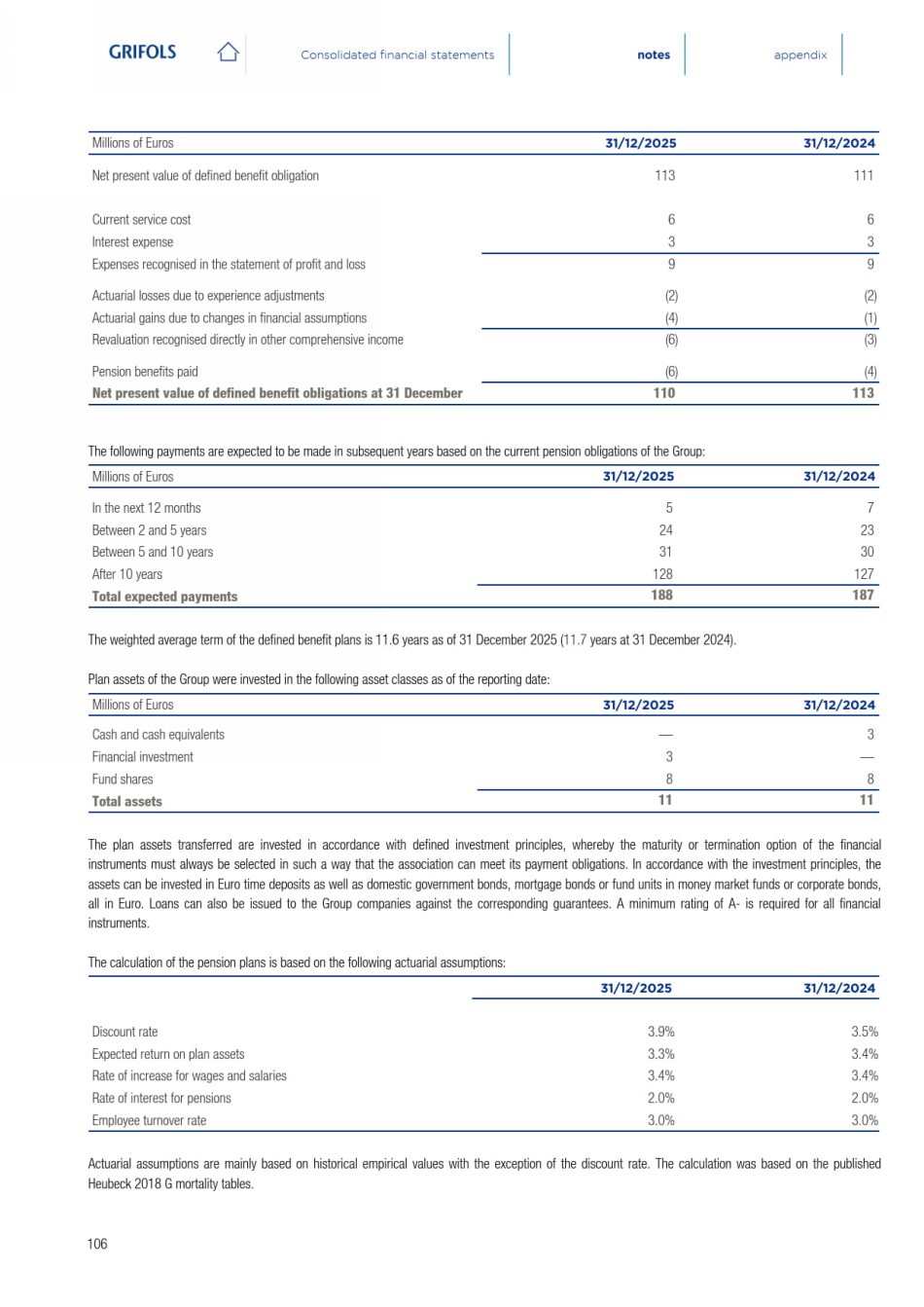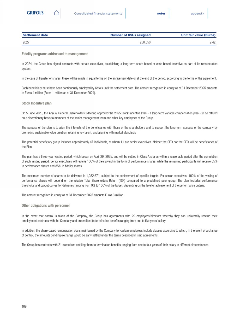 绩效和薪酬Grifols致力于培养基于执行力、效率、有效性和问责制的绩效驱动文化。为了体现这一承诺,其短期和长期激励战略结合了与股东利益一致的可持续发展绩效。长期激励计划Grifols为高级管理层成员和其他关键员工制定了长期可变薪酬计划。其目的是使受益人的利益与股东的利益保持一致,促进人才保留并加强对创造可持续长期价值的承诺。它还回应了投资者和代理顾问的期望,并补充了短期薪酬结构。该计划目前包括两个激励计划:2023年度股票期权激励计划经2023年度股东大会批准,该计划针对由Grifols管理团队组成的约220名员工。该计划为每位受益人提供四年期限,自生效之日起算。授予期权的归属取决于每个受益人在每个归属日继续受雇于Grifols。此外,它还受制于以下条件:•在前两年,雇员必须平均至少达到为相应年度短期薪酬确定的两个目标的90%:(i)与集团整体业绩挂钩的经济指标,参考EBITDA(90%的权重),以及(ii)ESG指标(10%的权重)。•顺利完成相应的绩效年度评价。非董事会成员的受益人必须在1至5的等级中获得最低年度绩效评级3(以5为最高分)。该评级是通过Grifols绩效系统(GPS)确定的,这是一种标准化评估工具,旨在评估绩效和潜力,并确保对绩效和行为的结构化反馈。作为董事会成员的受益人必须顺利通过任命和薪酬委员会进行的年度评估。2025年新股票激励计划经2025年年度股东大会批准,该计划以Grifols股票交割为基础,面向约47名关键员工,其中包括11名高级管理层成员。首席执行官和首席财务官(CFO)不是受益人。正如董事会批准决议(可在线获取)中所详述,该计划的期限为三年,从2025年4月29日至2028年4月29日。其目标是在竞争日益激烈的全球环境中吸引、留住和激励关键人才;促进对公司战略目标的长期承诺;并加强符合现行市场标准的薪酬战略。该计划还回应了代理顾问和机构投资者的期望,并解决了公司总薪酬提供中已确定的差距,特别是在某些关键角色和地区。它被设计为一种高度选择性的、与绩效挂钩的激励措施,补充了现有的短期薪酬结构。该计划的结构是通过授予业绩股份,这些股份专门授予高级管理层。其余受益人将获得Performance Shares(65%)和Fidelity Shares(35%)的组合。根据该计划可能交付的A类股票数量上限为1,032,671股,最高总价值为931万欧元,每股参考价值为9.017欧元。股份交割需满足以下条件:•在整个计划期限内连续受雇。•在Grifols性能系统(GPS)下,最低年平均性能等级为3分(满分5分)。•在绩效股份的情况下,归属取决于是否符合基于相对股东总回报(TSR)的既定绩效指标,该指标将Grifols的股东总回报与生物技术和制药公司定义的同行组的总回报进行比较。基于相对TSR结果,根据Grifols在同行组内的排名确定派息率(低于第40个百分位的派息率为0%;40-60个百分位之间的派息率为60%;60-75个百分位之间的派息率为100%;75-85个百分位之间的派息率为120%;高于或高于90个百分位的派息率为150%)。对于高级管理层,绩效由监督目标的任命和薪酬委员会和董事会进行评估,董事会批准绩效水平。对于所有其他受益人,绩效由首席执行官主持的特别委员会进行评估。总体来看,2025年股票激励计划强化Grifols竞争力, 将薪酬与实际业绩挂钩,并加强领导力、成果和为股东创造可持续长期价值之间的一致性。大环境社会治理附件179综合年度报告2025