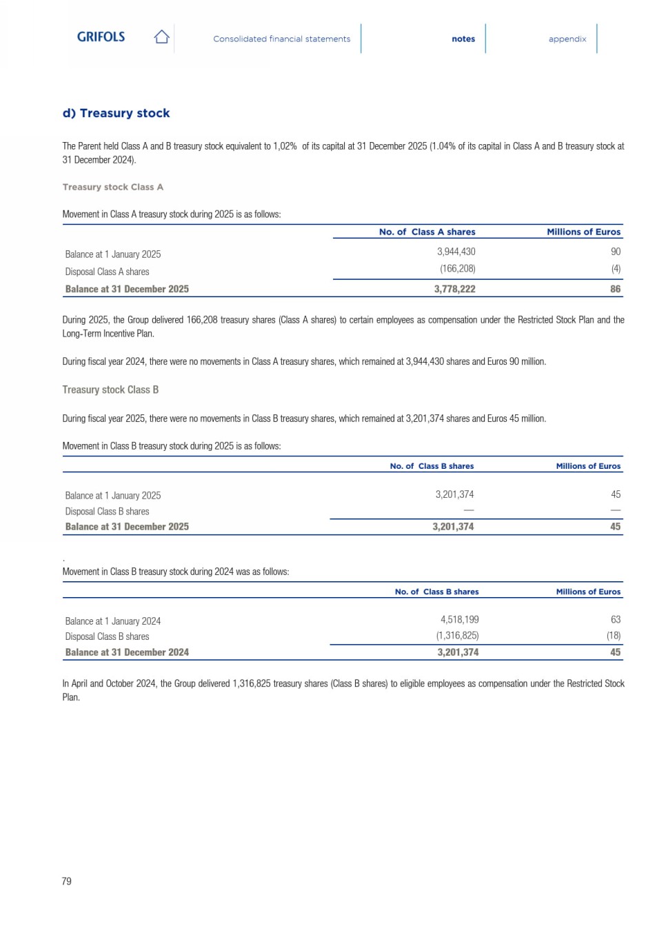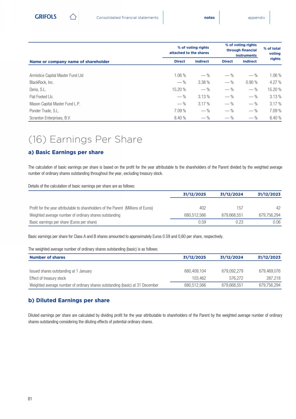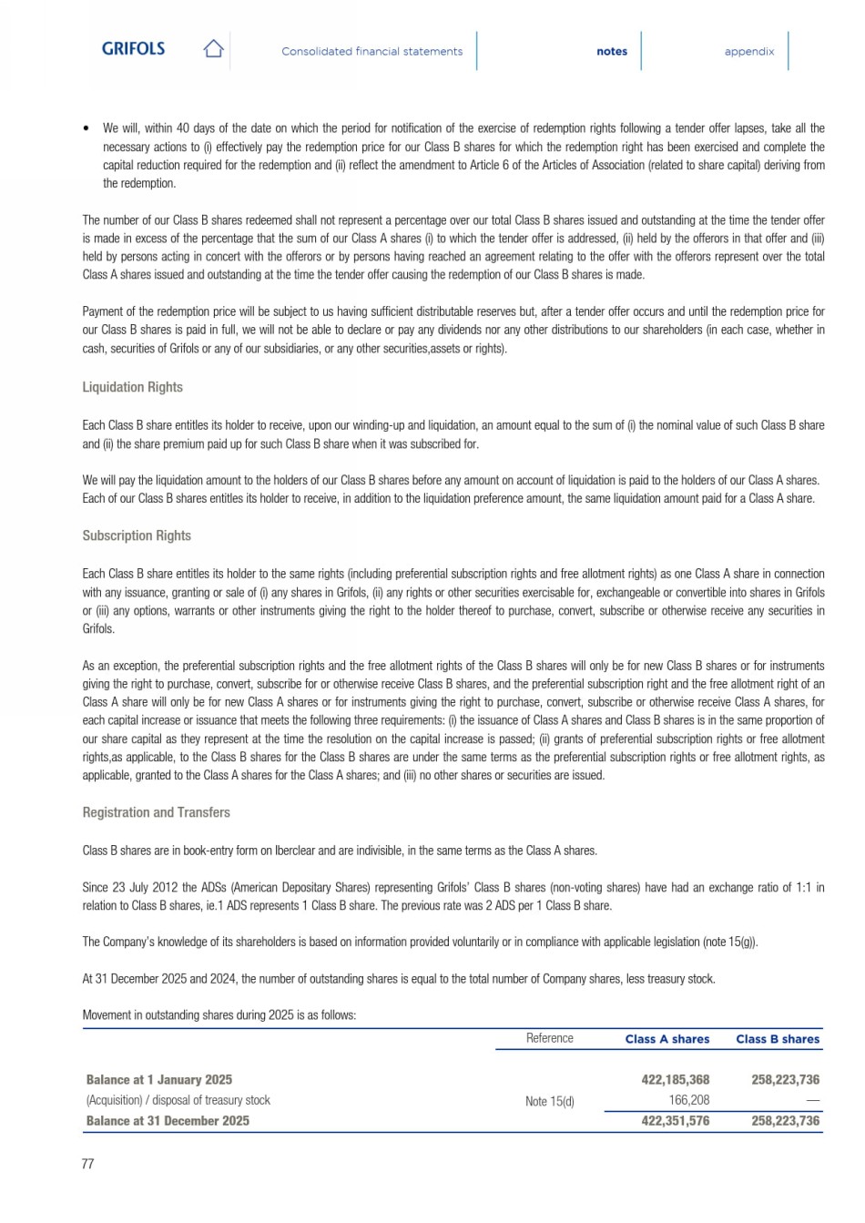 上市公司的治理Grifols通过与公认的最佳实践相一致的稳固且以战略为导向的公司治理框架,推动了长期可持续价值的创造。其治理模式以原则和标准为基础,以确保高效、透明和负责任的管理,加强投资者和关键利益相关者之间的信心。Grifols的股本Grifols是一家公开上市公司,没有额外的法定或股东之间的一致行动。此外,对其证券的可转让性或表决权的行使没有任何法定、法律或其他限制,第132条。Grifols S.A.股本目前为119,603,705欧元,代表687,554,908股,已全额认购并缴款。该公司的股票分为两类:• A类股:426,129,798股有投票权的普通股,每股面值0.25欧元,在巴塞罗那、马德里、巴伦西亚和毕尔巴鄂证券交易所和西班牙连续市场系统上市。• B类股:261,425,110股具有一定优先经济权利、每股面值0.05欧元的无投票权股份,在巴塞罗那、马德里、巴伦西亚和毕尔巴鄂证券交易所和西班牙连续市场系统上市。B类股票每股派发0.01欧元的优先股息。Grifols于2025年8月13日派发中期股息。A类股和B类股的总金额均为每股0.15欧元。• Grifols在美国有两个美国存托凭证(ADR)项目:A类股的ADR Level I和B类股的ADR Level III。一级ADR在场外市场以美元交易,而三级ADR在纳斯达克以美元上市。股东组成加强沟通和建立信任作为一家上市公司,Grifols有几个渠道向其股东提供清晰、深入和及时的信息,包括财务报表和可持续发展报告。同时,通过路演、网络研讨会和会议等形式与投资者保持定期联系。该公司致力于在其运营中整合可持续和负责任的做法,并评估其环境和社会影响。作为上市公司的法律框架Grifols是西班牙和美国的一家公开上市公司,遵守这两个司法管辖区的所有适用法律。内部监管框架•公司章程•股东大会条例•董事会条例•守则、内部条例和公司政策外部监管框架•资本公司法(Ley de Sociedades de Capital)、证券市场和投资服务法(Ley de los Mercados de Valores y de los Servicios de Inversi ó n),以及其他适用的西班牙和美国立法。•中国证监会发布的《上市公司良好治理准则》。一般环境社会治理附件171综合年度报告2025132更多详细信息,请参见Grifols的公司网站www.grifols.com。浮动资本:56.31%关联股东和董事会:31.03%贝莱德:4.28%民信资本:3.17%平足:3.13%停战资本主基金:1.06%库存股:1.02%