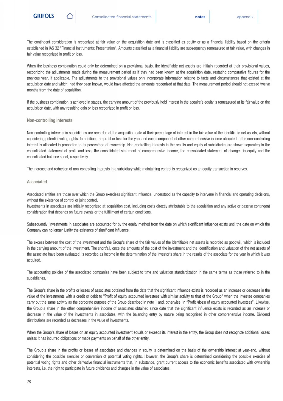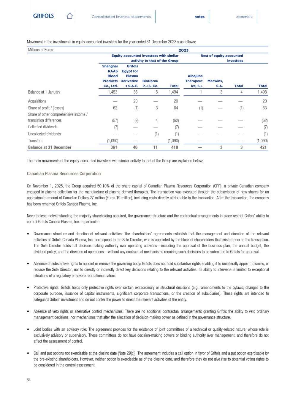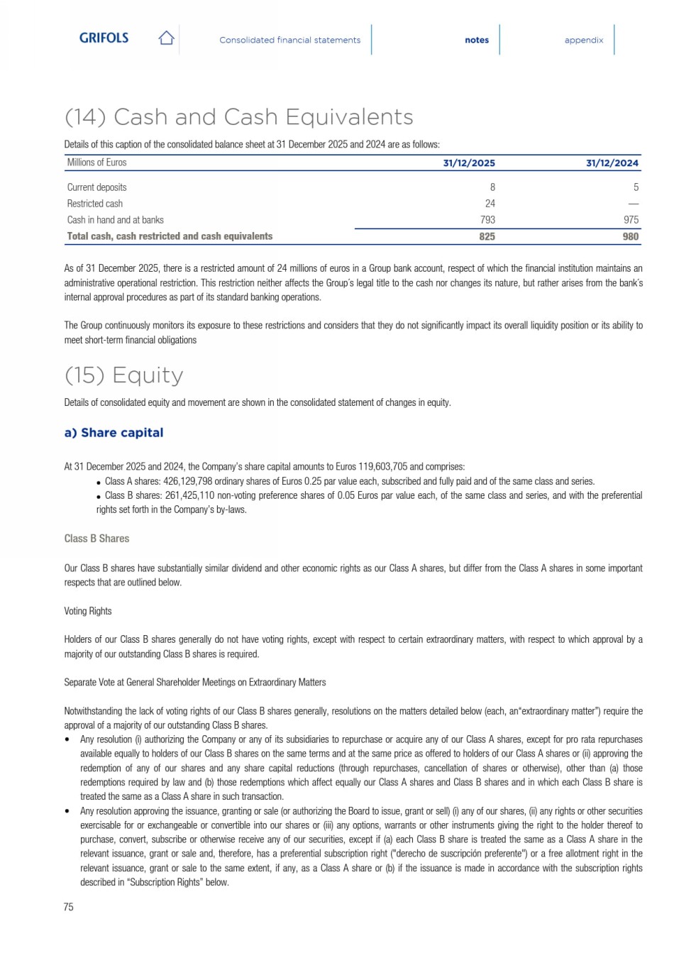 上市公司的治理Grifols通过与公认的最佳实践相一致的稳固且以战略为导向的公司治理框架,推动了长期可持续价值的创造。其治理模式以原则和标准为基础,以确保高效、透明和负责任的管理,加强投资者和关键利益相关者之间的信心。Grifols的股本Grifols是一家公开上市公司,没有额外的法定或股东之间的一致行动。此外,对其证券的可转让性或表决权的行使没有任何法定、法律或其他限制,第132条。Grifols S.A.股本目前为119,603,705欧元,代表687,554,908股,已全额认购并缴款。该公司的股票分为两类:• A类股:426,129,798股有投票权的普通股,每股面值0.25欧元,在巴塞罗那、马德里、巴伦西亚和毕尔巴鄂证券交易所和西班牙连续市场系统上市。• B类股:261,425,110股具有一定优先经济权利、每股面值0.05欧元的无投票权股份,在巴塞罗那、马德里、巴伦西亚和毕尔巴鄂证券交易所和西班牙连续市场系统上市。B类股票每股派发0.01欧元的优先股息。Grifols于2025年8月13日派发中期股息。A类股和B类股的总金额均为每股0.15欧元。• Grifols在美国有两个美国存托凭证(ADR)项目:A类股的ADR Level I和B类股的ADR Level III。一级ADR在场外市场以美元交易,而三级ADR在纳斯达克以美元上市。股东组成加强沟通和建立信任作为一家上市公司,Grifols有几个渠道向其股东提供清晰、深入和及时的信息,包括财务报表和可持续发展报告。同时,通过路演、网络研讨会和会议等形式与投资者保持定期联系。该公司致力于在其运营中整合可持续和负责任的做法,并评估其环境和社会影响。作为上市公司的法律框架Grifols是西班牙和美国的一家公开上市公司,遵守这两个司法管辖区的所有适用法律。内部监管框架•公司章程•股东大会条例•董事会条例•守则、内部条例和公司政策外部监管框架•资本公司法(Ley de Sociedades de Capital)、证券市场和投资服务法(Ley de los Mercados de Valores y de los Servicios de Inversi ó n),以及其他适用的西班牙和美国立法。•中国证监会发布的《上市公司良好治理准则》。一般环境社会治理附件171综合年度报告2025132更多详细信息,请参见Grifols的公司网站www.grifols.com。浮动资本:56.31%关联股东和董事会:31.03%贝莱德:4.28%民信资本:3.17%平足:3.13%停战资本主基金:1.06%库存股:1.02%