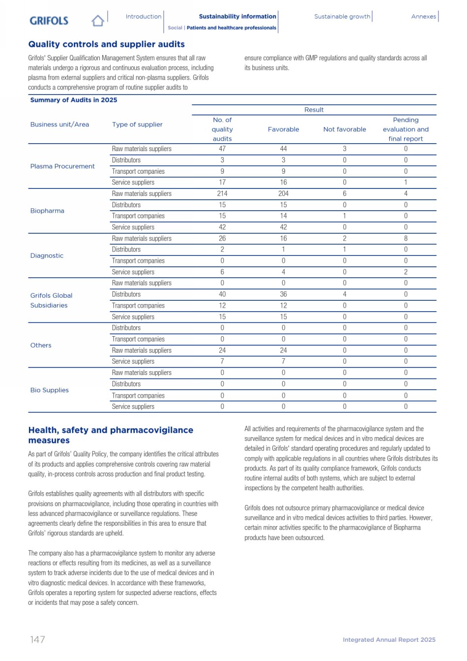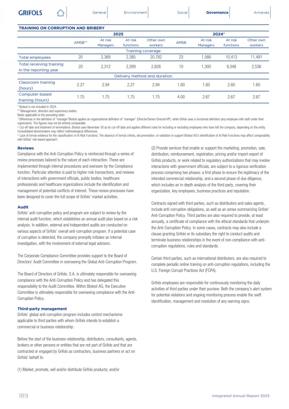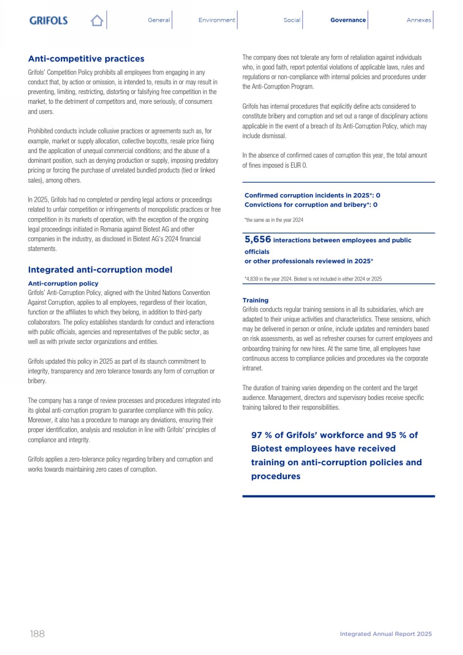 反竞争做法Grifols的竞争政策禁止所有员工从事任何通过作为或不作为,旨在、导致或可能导致阻止、限制、限制、扭曲或伪造市场自由竞争的行为,从而损害竞争对手,更严重的是损害消费者和用户。被禁止的行为包括串通做法或协议,例如,市场或供应分配、集体抵制、转售价格固定和适用不平等的商业条件;以及滥用支配地位,例如拒绝生产或供应、强加掠夺性定价或强迫购买不相关的捆绑产品(捆绑或关联销售)等。2025年,Grifols在其经营市场中没有与不公平竞争或违反垄断做法或自由竞争相关的已完成或未决的法律诉讼或诉讼,但Biotest AG 2024年财务报表中披露的在罗马尼亚针对Biotest AG和该行业其他公司发起的正在进行的法律诉讼除外。综合反腐败模式反腐败政策Grifols的反腐败政策与《联合国反腐败公约》保持一致,除第三方合作者外,适用于所有员工,无论其所在地点、职能或所属关联机构。该政策确立了与公职人员、机构和公共部门代表以及与私营部门组织和实体的行为和互动标准。Grifols在2025年更新了这项政策,作为其对任何形式的腐败或贿赂行为的廉洁、透明和零容忍的坚定承诺的一部分。该公司在其全球反腐败计划中整合了一系列审查流程和程序,以保证遵守这一政策。此外,它还有一个程序来管理任何偏差,确保按照Grifols的合规和诚信原则对其进行适当的识别、分析和解决。Grifols对贿赂和腐败实行零容忍政策,致力于保持腐败案件为零。公司不容忍对善意报告可能违反适用法律、规则和条例或不遵守反腐败计划下的内部政策和程序的个人进行任何形式的报复。Grifols的内部程序明确定义了被视为构成贿赂和腐败的行为,并规定了在违反其反腐败政策的情况下适用的一系列纪律行动,其中可能包括解雇。在今年没有确认腐败案件的情况下,罚款总额为0欧元。2025年已确认的腐败事件*:贪污、受贿罪定罪0件*: 0*与2024年度相同5,656雇员与公职人员或其他专业人员之间的互动2025年审查**2024年为4,839人。Biotest不包括在2024年或2025年培训中Grifols在其所有子公司定期举办培训课程,这些课程根据其独特的活动和特点进行调整。这些课程可以亲自或在线进行,包括基于风险评估的更新和提醒,以及针对现有员工的进修课程和新员工的入职培训。同时,所有员工都可以通过企业内联网持续访问合规政策和程序。培训持续时间因内容和目标受众而异。管理层、董事和监督机构接受针对其职责的特定培训。Grifols 97%的员工和95%的Biotest员工接受过反腐败政策和程序方面的培训一般环境社会治理附件188综合年度报告2025