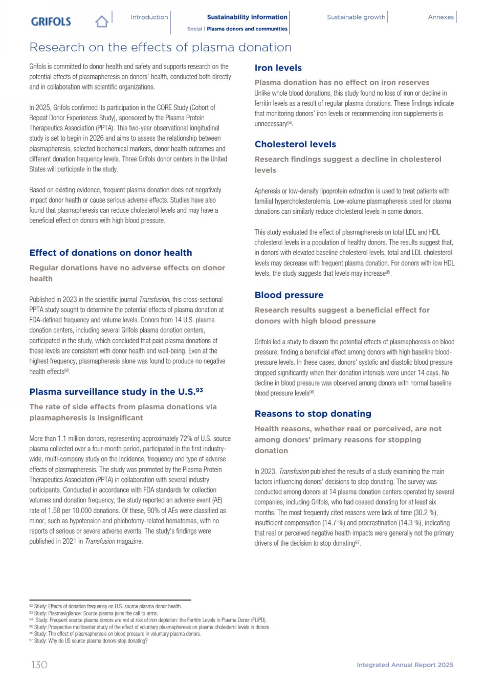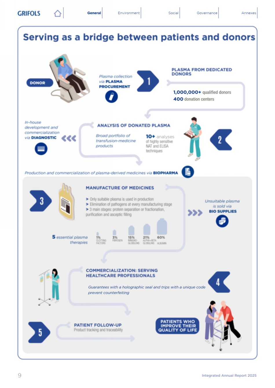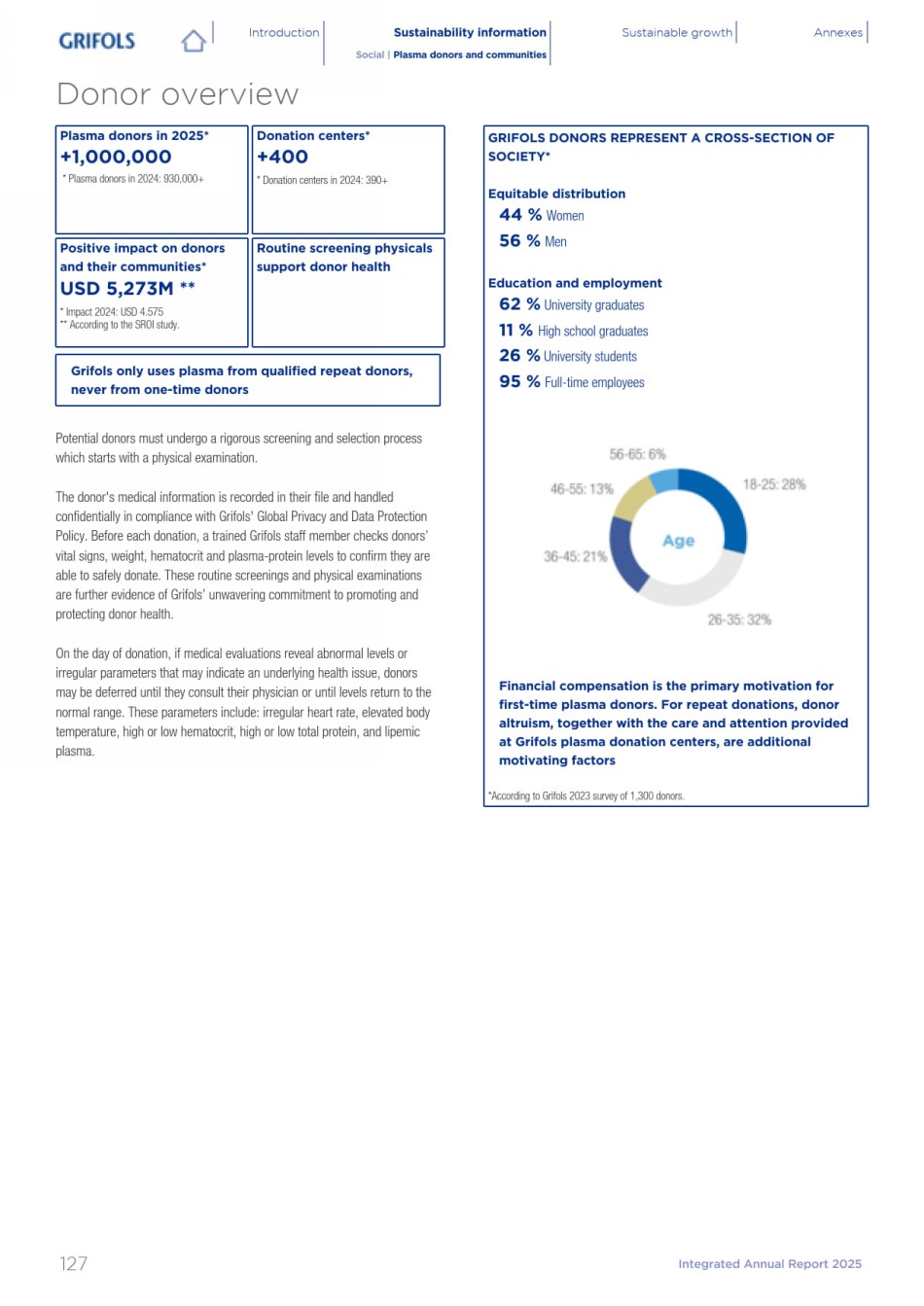 促进全球卫生系统的可持续性作为其核心业务的补充,Grifols通过向捐赠中心和公共卫生组织提供其设施、技术、专业知识和技术团队,与其他国家分享其专业知识。这包括处理多余的血浆,纯化蛋白质并以血浆衍生药物的形式完全返回。受血浆分离服务协议的监管,这些公私合作在西班牙、意大利和加拿大提供,从而能够为公共医疗保健系统大幅节省血浆衍生药物的成本。2023年,Grifols将这项服务扩展到埃及,推动该国实现血浆衍生药物自给自足的努力。有关更多详细信息,请参阅关于获得治疗的部分。Grifols的全球血浆分馏计划有助于降低医疗保健成本这一基础广泛的服务是为每个客户(公共和私营实体)定制的,涵盖整个血浆物流链,包括收集、运输、测试、分析、分馏、纯化、给药和交付成品。除其他举措外,该计划包括就质量管理和保证体系提供建议的质量计划,以及提供与血浆相关的培训活动、课程和计划的学院计划。此外,Grifols等离子体管理服务网页解决方案促进了参与监测工业等离子体分馏合同的各方之间的沟通,以保证整个过程的完全可追溯性。Grifols带头提供一系列额外服务,以支持和满足血库的需求,协同工作以促进血浆自给自足。西班牙推进血浆衍生药物自给自足进程人血浆已成为西班牙National Health体系的战略资源,是生产血浆衍生药物必不可少的原材料。通过单采血浆增加血浆捐献是当务之急,努力集中在扩大血浆捐献库上。2025年,在地方、区域和国家各级行动的支持下,西班牙的血浆采集量保持上升趋势。这种方法将扩大和优化血浆置换术能力与捐助者招募和保留倡议以及有针对性的宣传运动相结合。连续第四年,这些努力导致收集了超过40万升的血浆用于分馏和生产血液制品。这一数量占该国用于制造所需血浆疗法的血浆的40%至60%。这一年也标志着第一次全国等离子分馏招标的启动具有里程碑意义。在这方面,Grifols继续根据其对患者的承诺和促进全球医疗保健系统的可持续性,支持提高认识倡议和运动。协作解决方案安全贯穿整个供应链全面生产质量控制提高自给自足以患者为中心为医疗保健系统节省费用简介可持续发展信息可持续增长附件社会|患者和医疗保健专业人员157综合年度报告2025