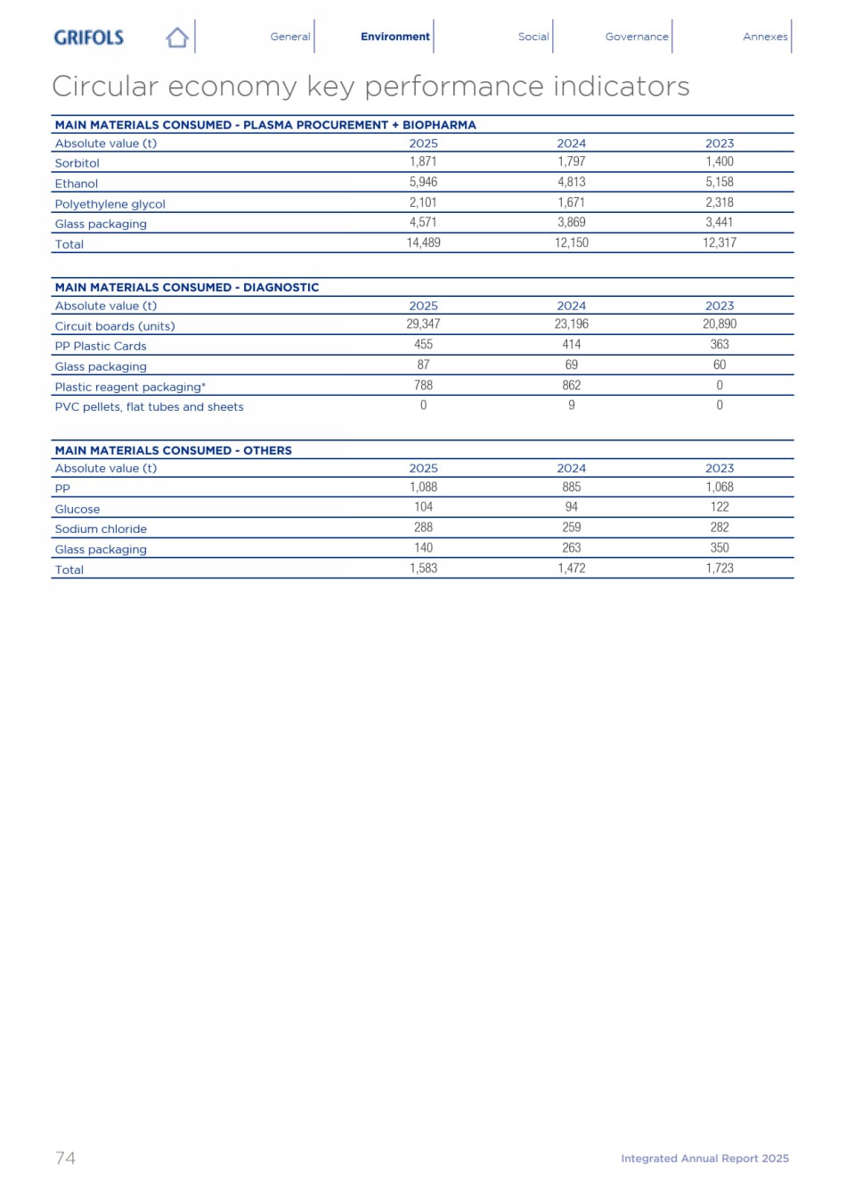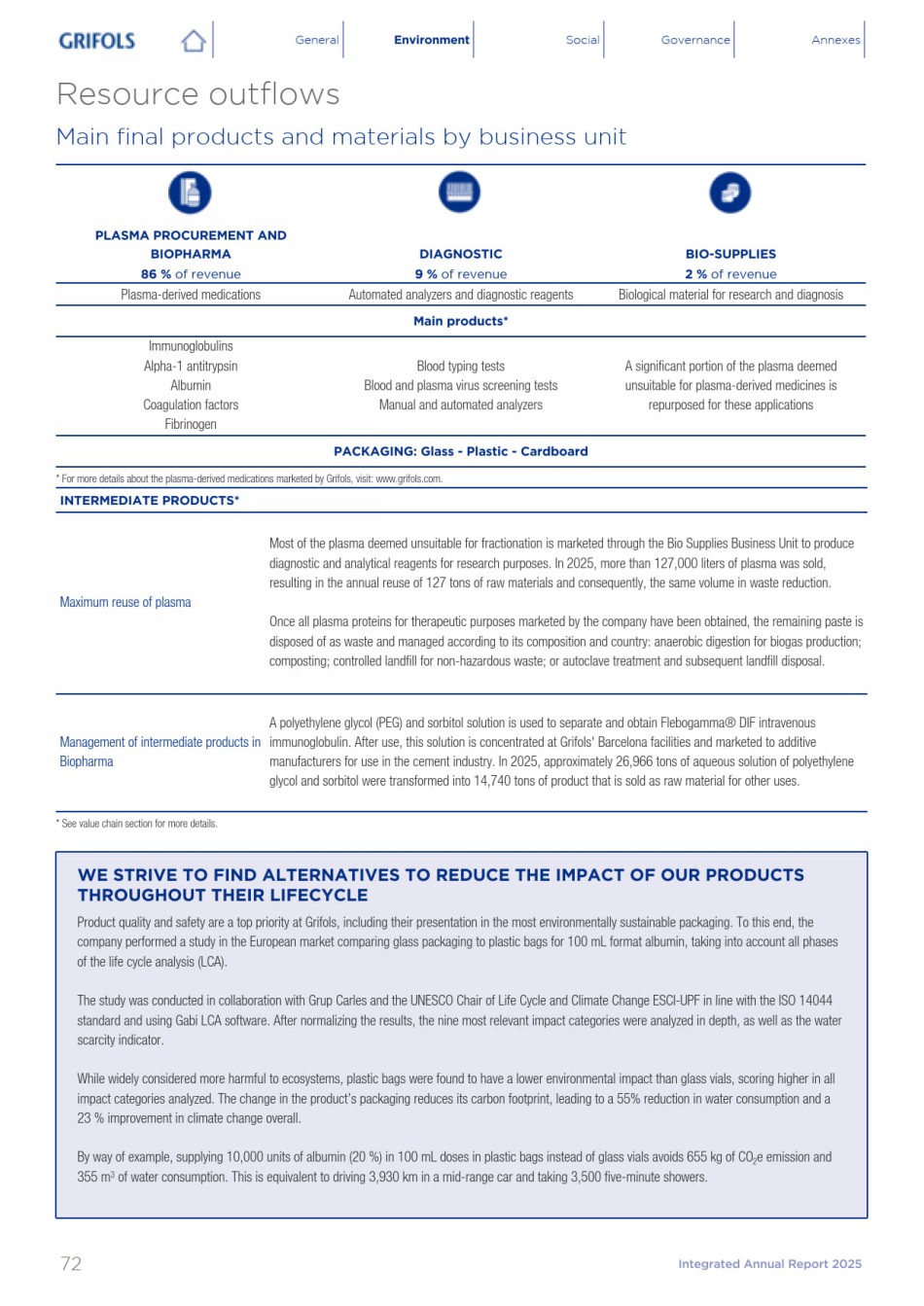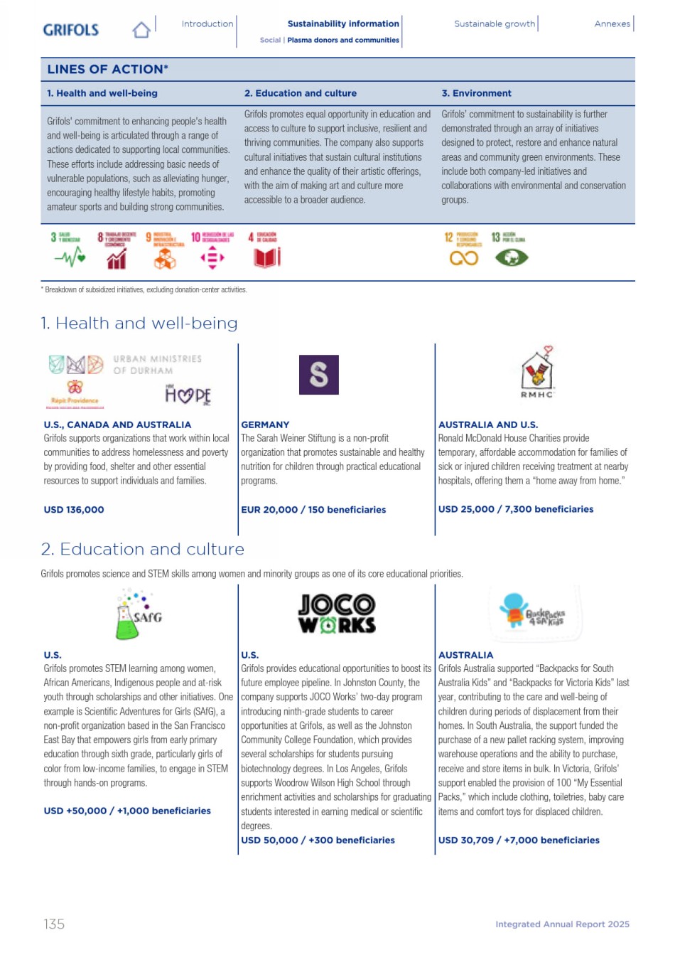 促进全球卫生系统的可持续性作为其核心业务的补充,Grifols通过向捐赠中心和公共卫生组织提供其设施、技术、专业知识和技术团队,与其他国家分享其专业知识。这包括处理多余的血浆,纯化蛋白质并以血浆衍生药物的形式完全返回。受血浆分离服务协议的监管,这些公私合作在西班牙、意大利和加拿大提供,从而能够为公共医疗保健系统大幅节省血浆衍生药物的成本。2023年,Grifols将这项服务扩展到埃及,推动该国实现血浆衍生药物自给自足的努力。有关更多详细信息,请参阅关于获得治疗的部分。Grifols的全球血浆分馏计划有助于降低医疗保健成本这一基础广泛的服务是为每个客户(公共和私营实体)定制的,涵盖整个血浆物流链,包括收集、运输、测试、分析、分馏、纯化、给药和交付成品。除其他举措外,该计划包括就质量管理和保证体系提供建议的质量计划,以及提供与血浆相关的培训活动、课程和计划的学院计划。此外,Grifols等离子体管理服务网页解决方案促进了参与监测工业等离子体分馏合同的各方之间的沟通,以保证整个过程的完全可追溯性。Grifols带头提供一系列额外服务,以支持和满足血库的需求,协同工作以促进血浆自给自足。西班牙推进血浆衍生药物自给自足进程人血浆已成为西班牙National Health体系的战略资源,是生产血浆衍生药物必不可少的原材料。通过单采血浆增加血浆捐献是当务之急,努力集中在扩大血浆捐献库上。2025年,在地方、区域和国家各级行动的支持下,西班牙的血浆采集量保持上升趋势。这种方法将扩大和优化血浆置换术能力与捐助者招募和保留倡议以及有针对性的宣传运动相结合。连续第四年,这些努力导致收集了超过40万升的血浆用于分馏和生产血液制品。这一数量占该国用于制造所需血浆疗法的血浆的40%至60%。这一年也标志着第一次全国等离子分馏招标的启动具有里程碑意义。在这方面,Grifols继续根据其对患者的承诺和促进全球医疗保健系统的可持续性,支持提高认识倡议和运动。协作解决方案安全贯穿整个供应链全面生产质量控制提高自给自足以患者为中心为医疗保健系统节省费用简介可持续发展信息可持续增长附件社会|患者和医疗保健专业人员157综合年度报告2025